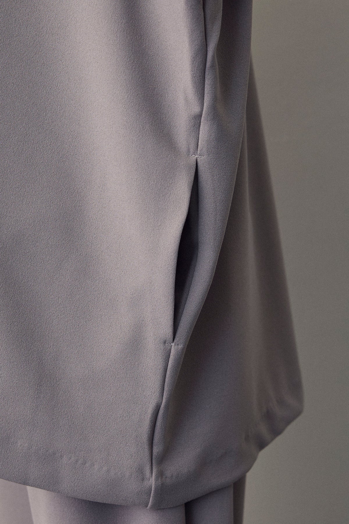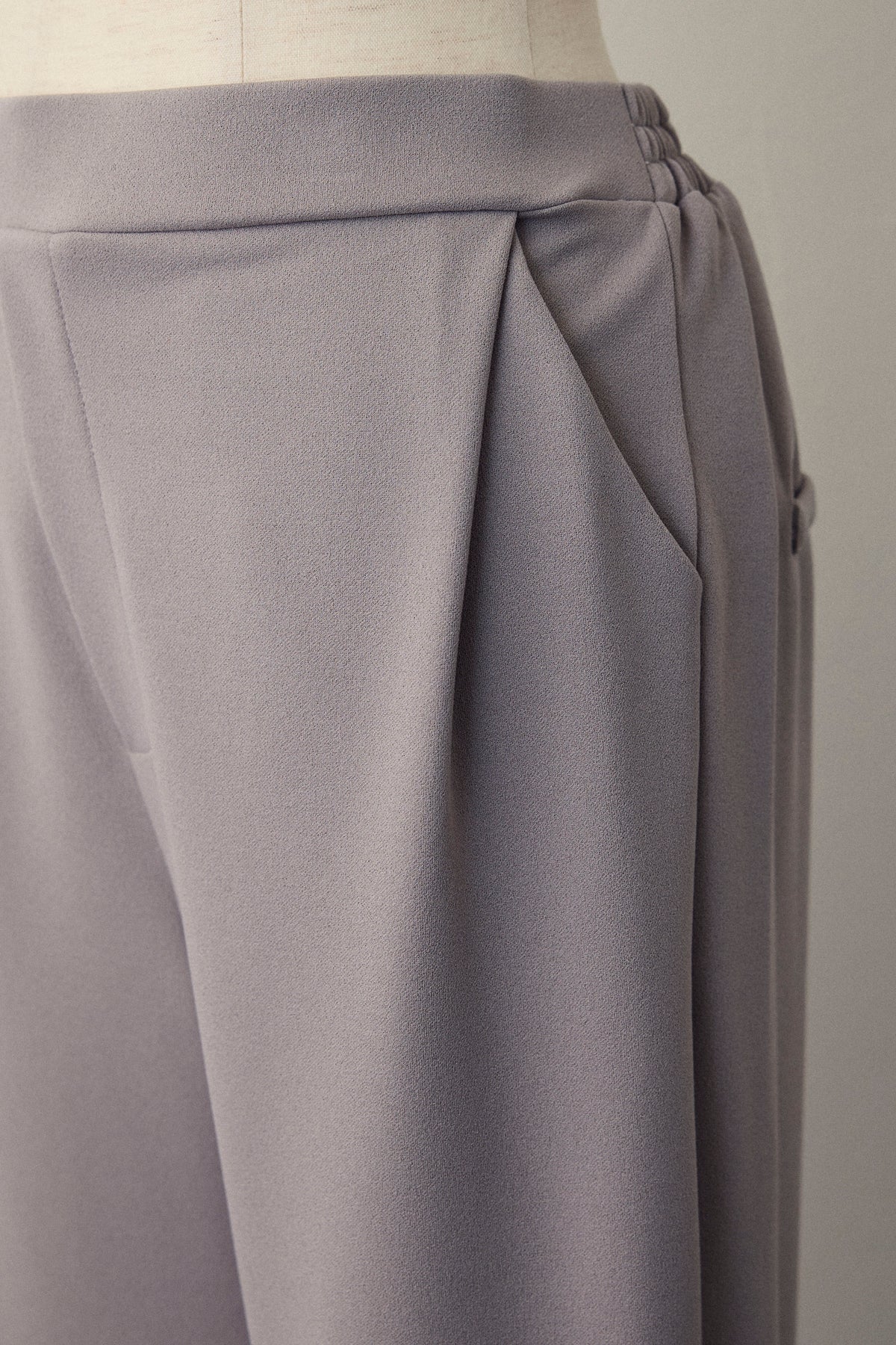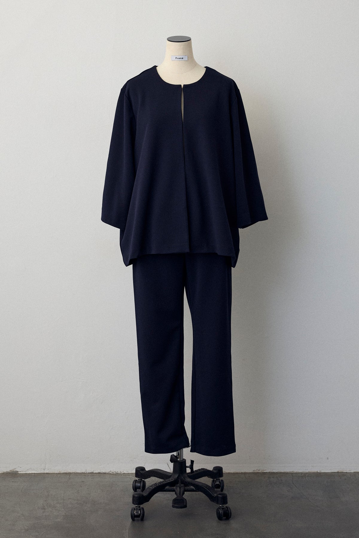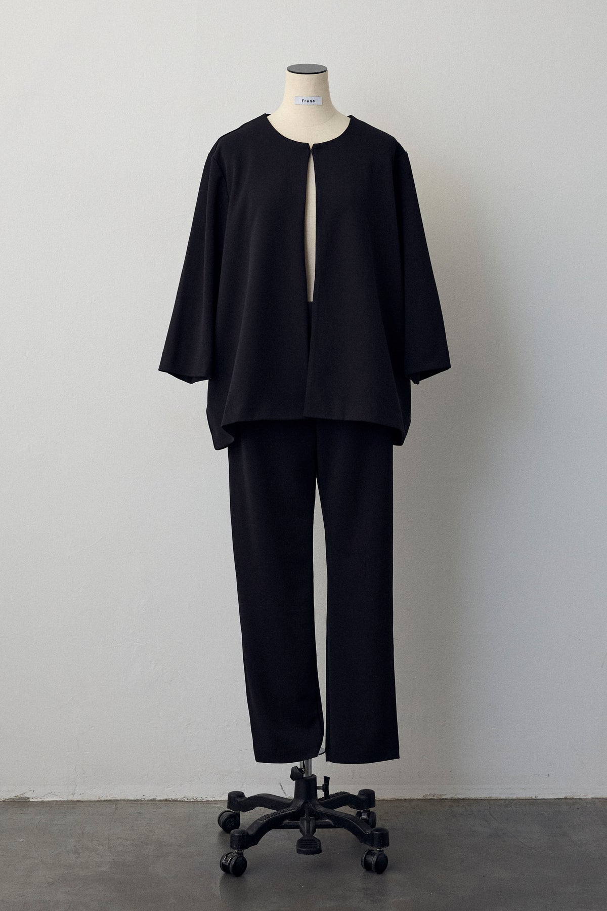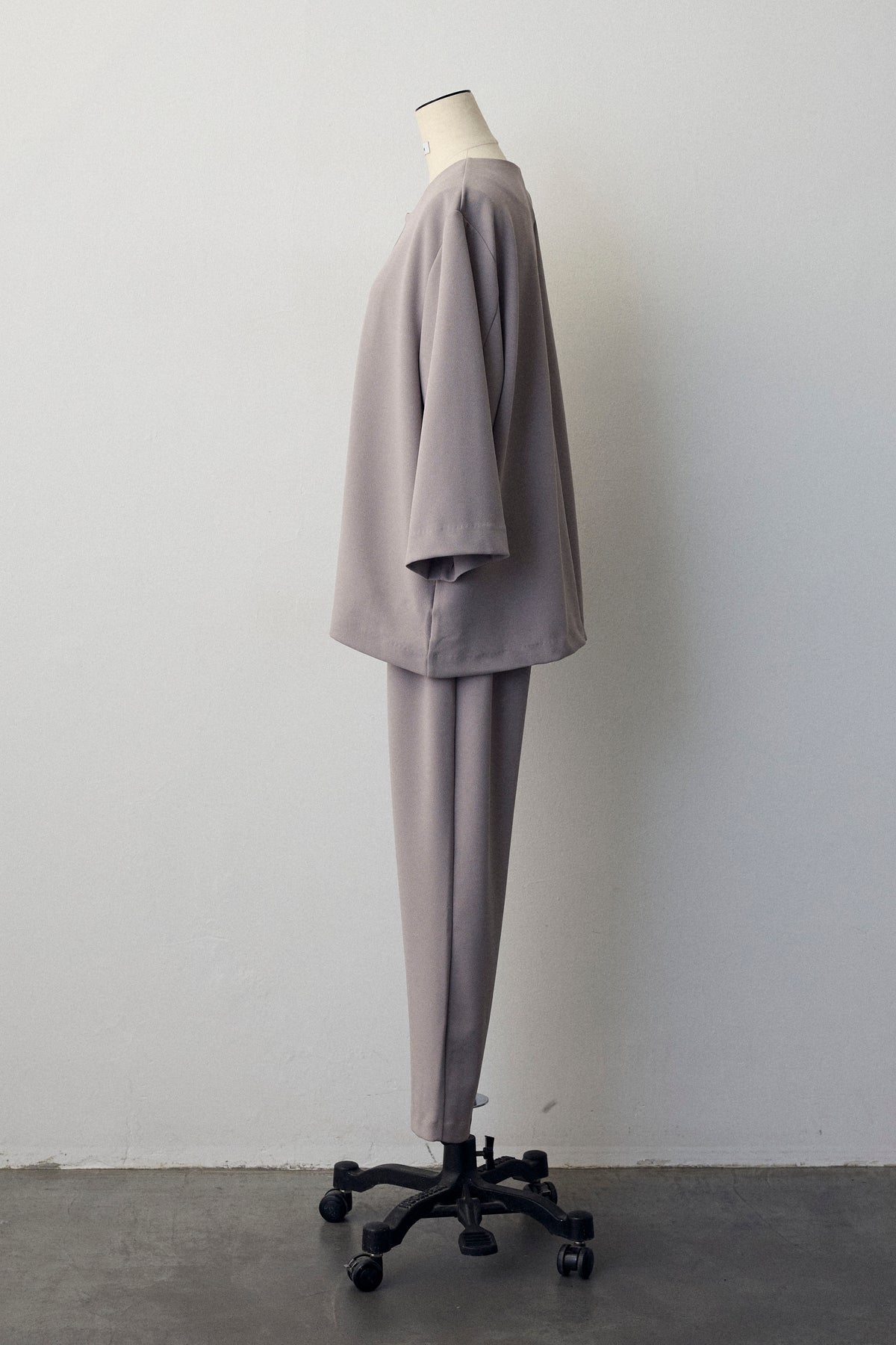 ノーカラーのすっきりとしたデザインが魅力のジョーゼットセットアップ。 程よい厚みと落ち感のある素材で、きちんと見えしながらも快適な着心地。 トップスはゆるやかなシルエット、パンツはテーパードでバランスよく仕上げました。 フォーマルにもデイリーにも対応できる万能アイテムです。