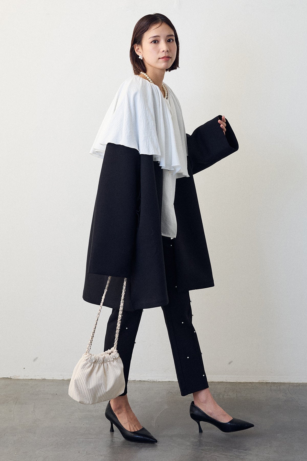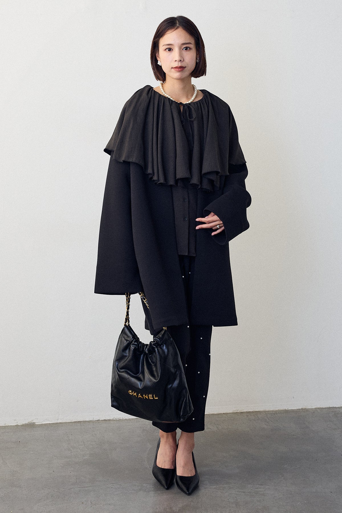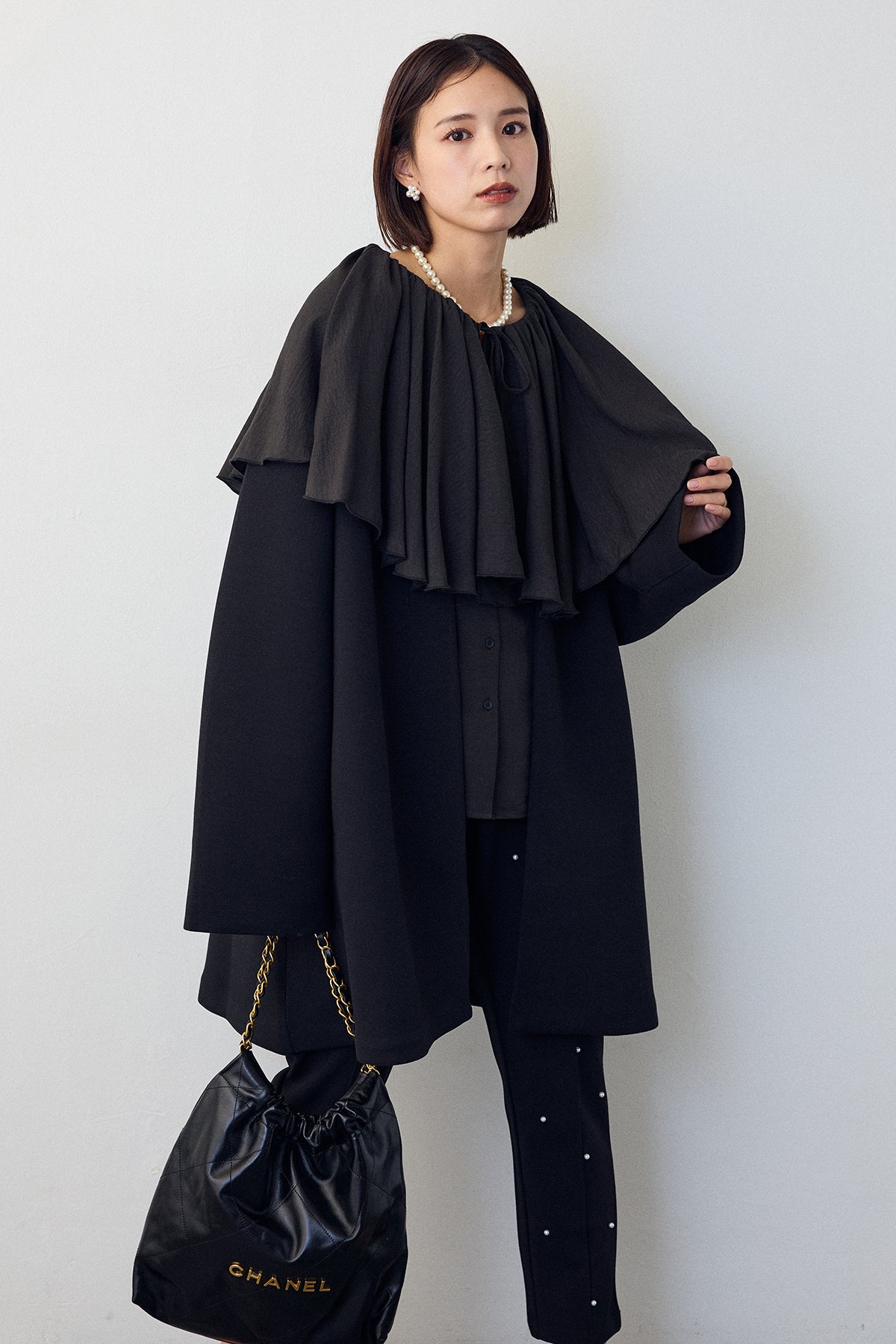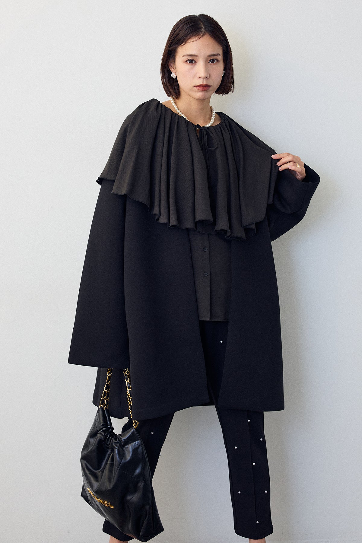 顔周りを華やかに彩る、存在感抜群のビッグカラーブラウス。贅沢に施されたフリルが、大人のフェミニンスタイルをドラマティックに演出します。一枚着はもちろん、コートやニットの上から襟を出したレイヤードスタイルもおすすめ。パールなどのアクセサリーとも相性が良く、特別なシーンを上品に彩ります。