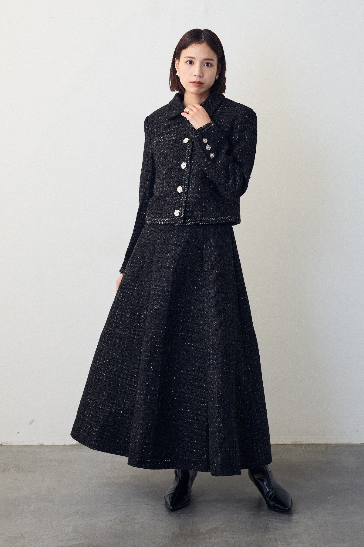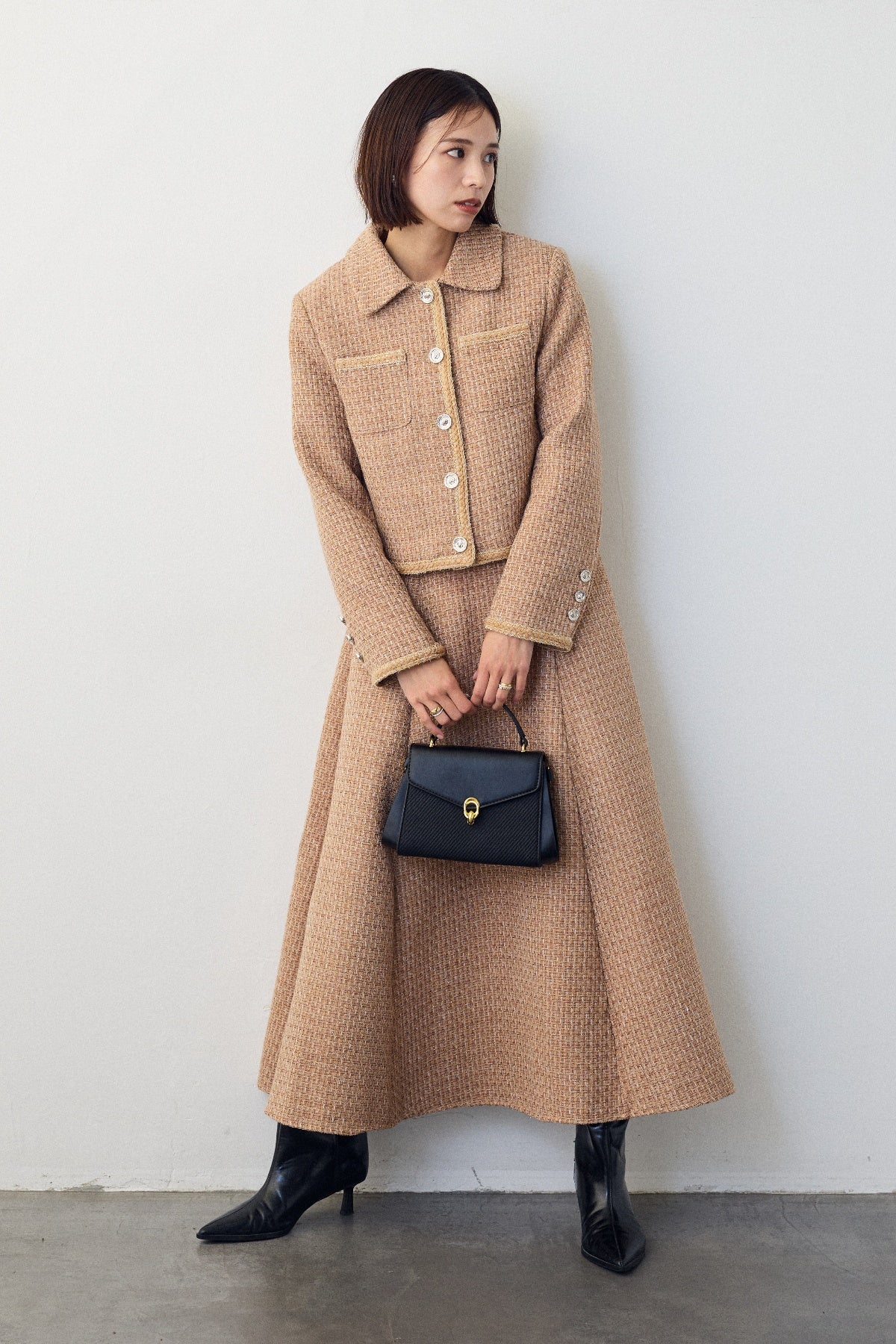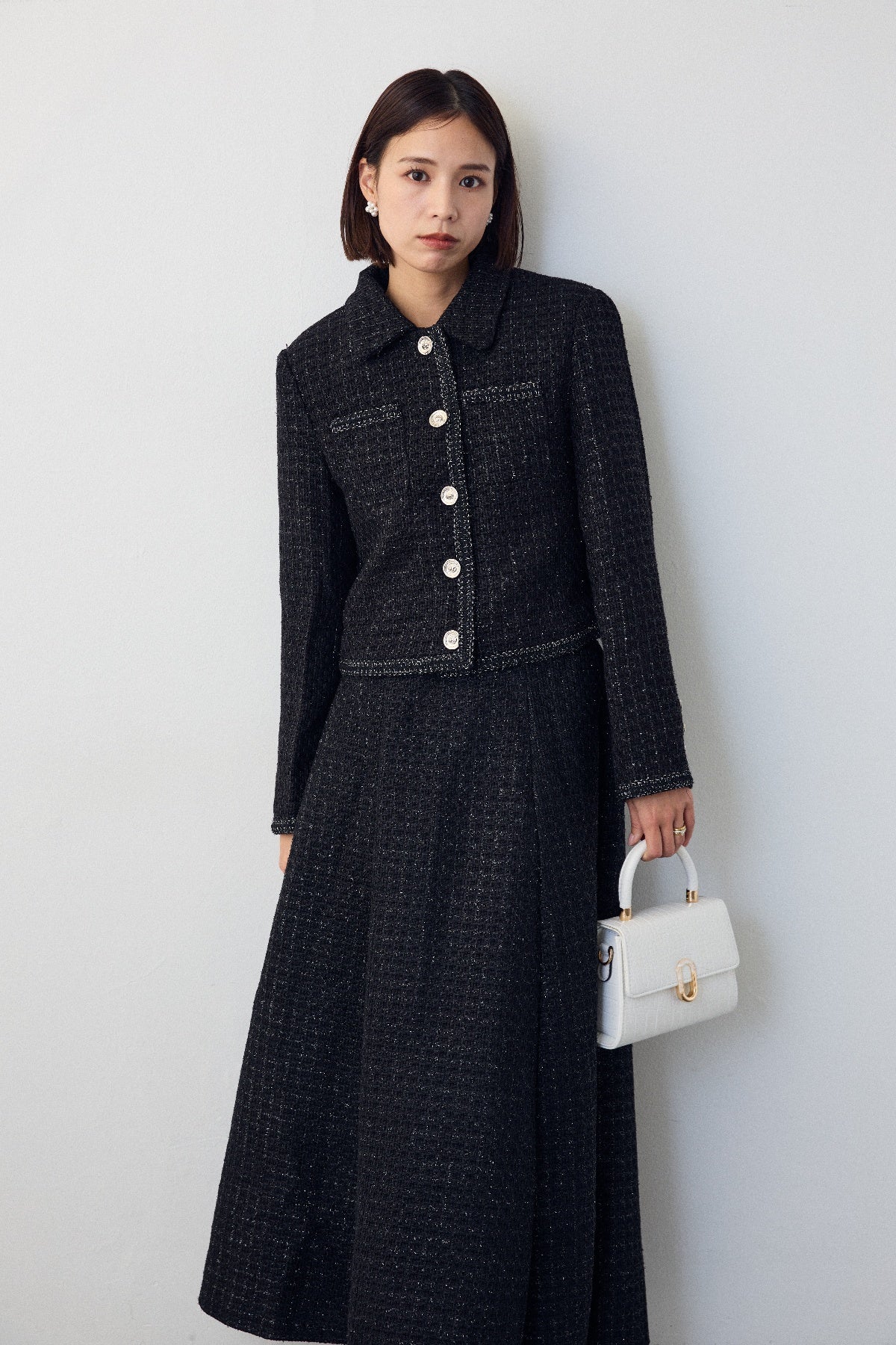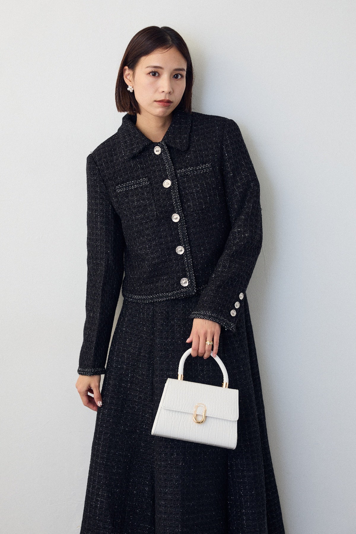 クラシカルな気品漂う、襟付きジャケットとフレアスカートのセットアップ。ゴールドのパイピングとジュエリーのようなボタンが、ハレの日に相応しい華やかさを添えます。メリハリのある美シルエットで、着るだけでスタイルアップ効果も抜群。セットでの着用はもちろん、単品使いでも着回しが効き、特別なシーンを上品に彩ります。