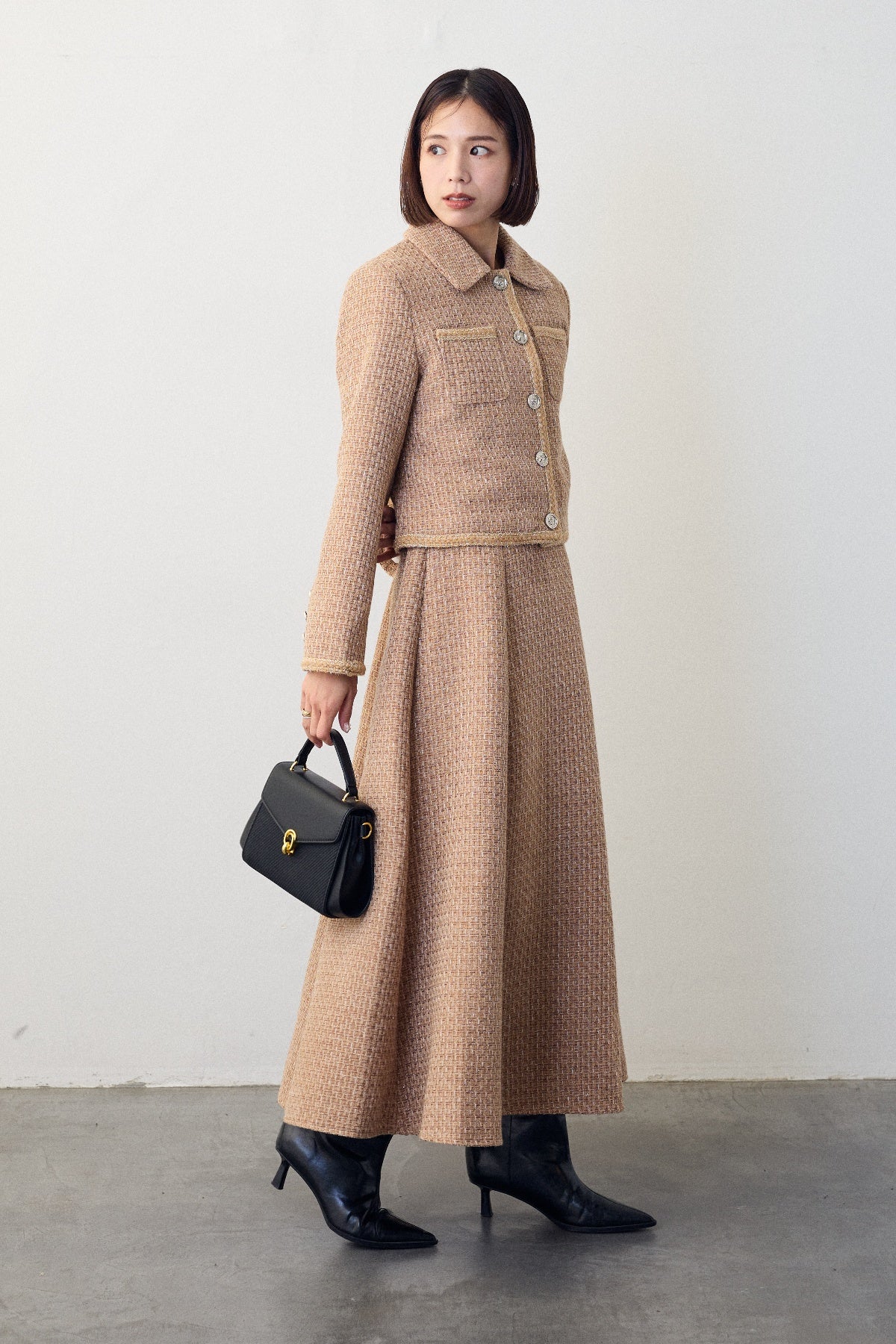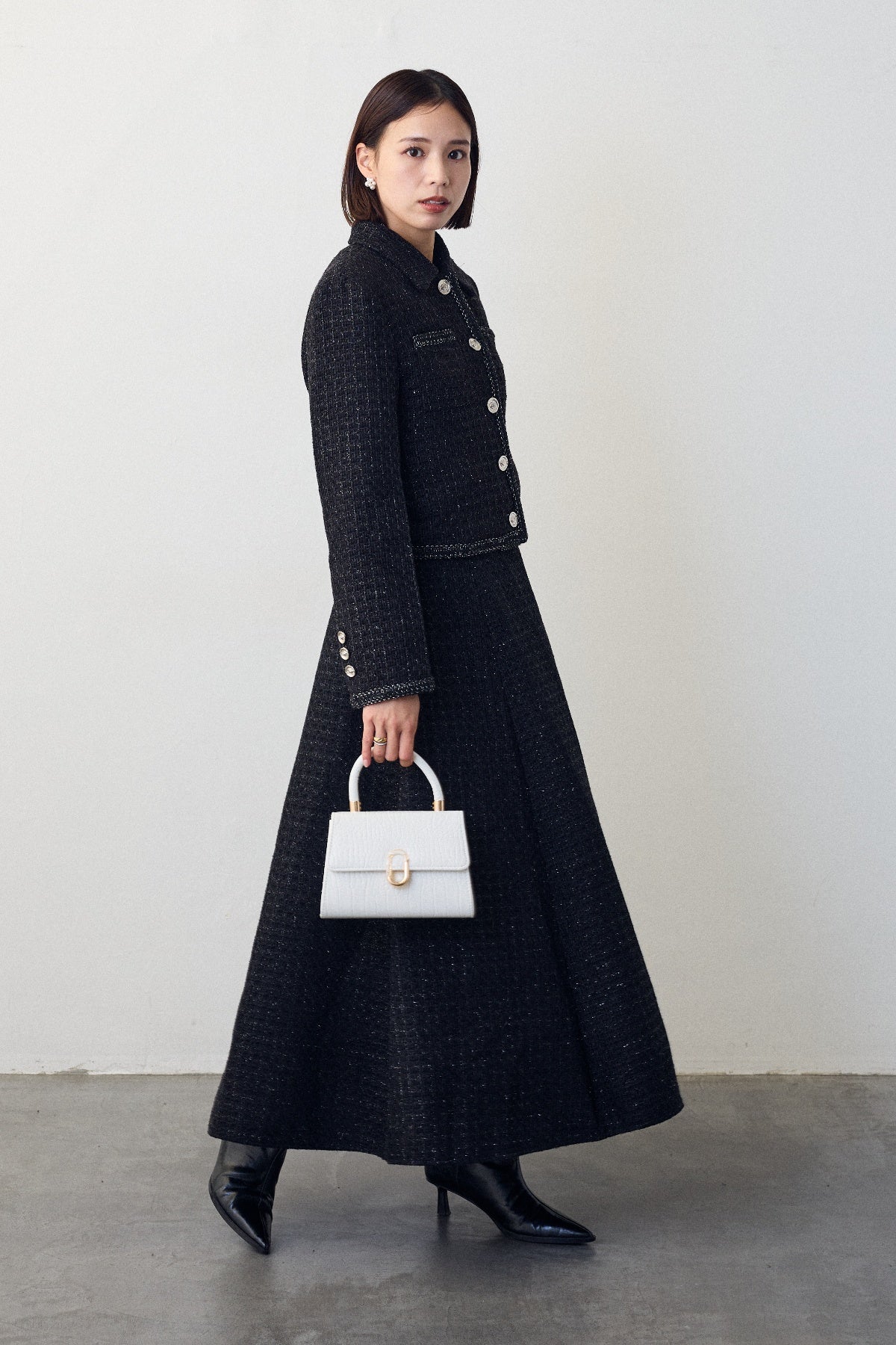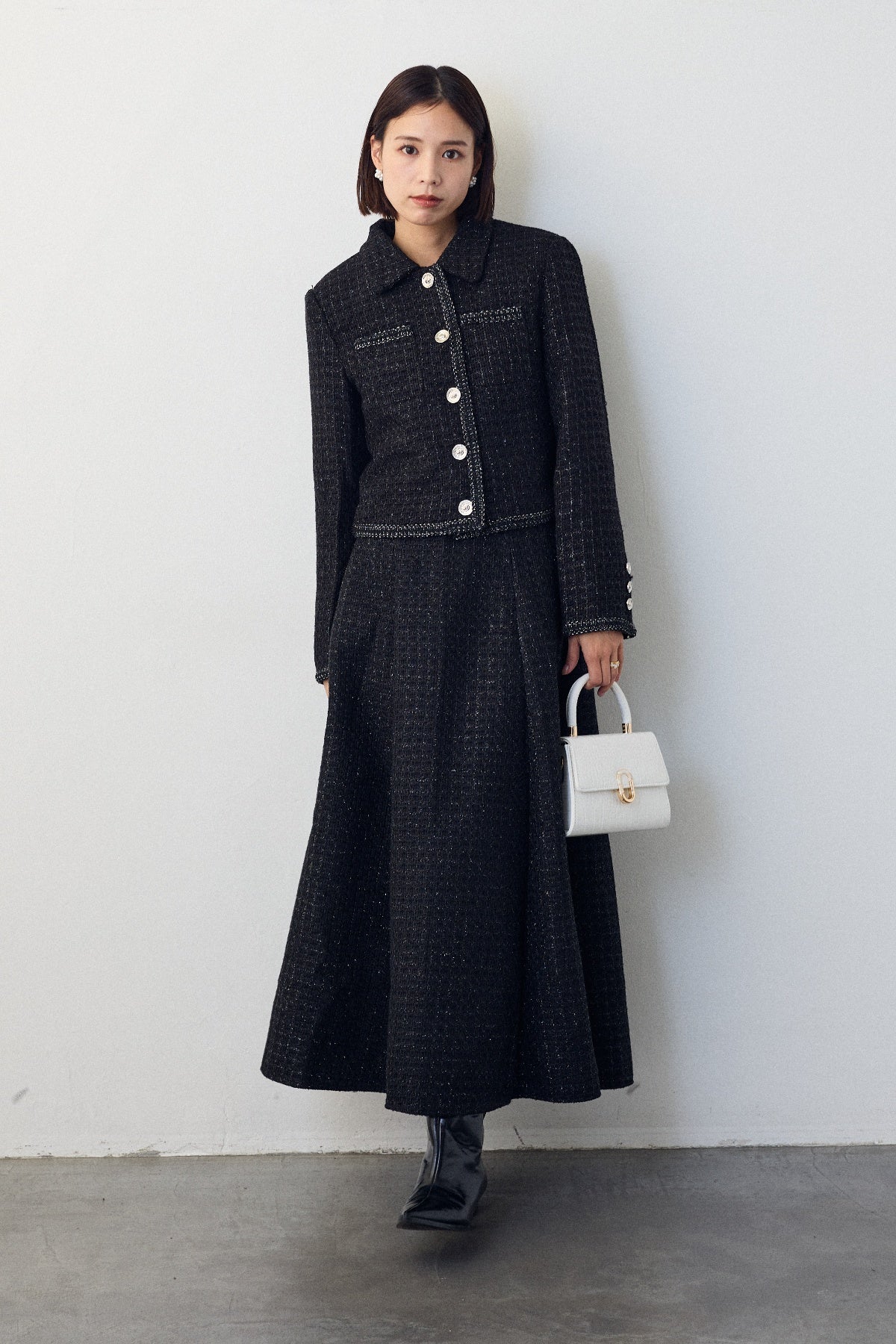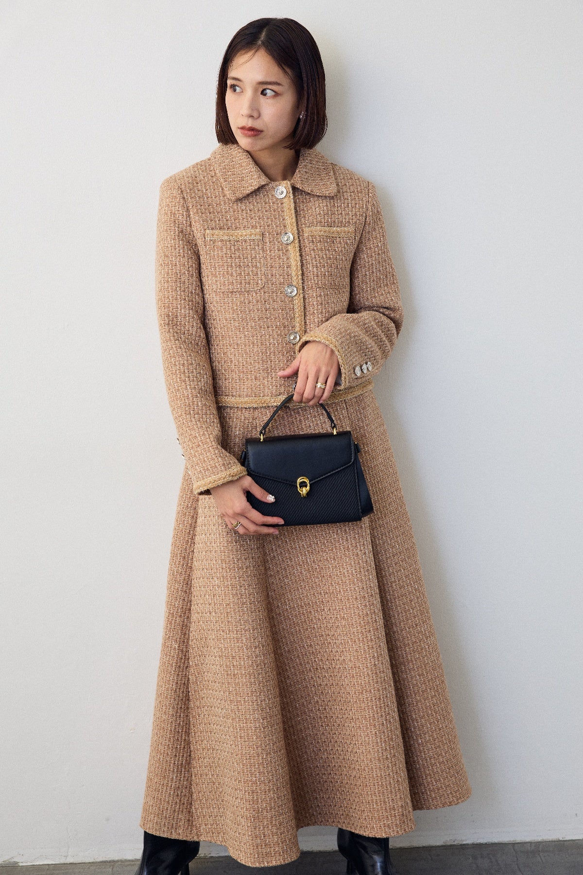 クラシカルな気品漂う、襟付きジャケットとフレアスカートのセットアップ。ゴールドのパイピングとジュエリーのようなボタンが、ハレの日に相応しい華やかさを添えます。メリハリのある美シルエットで、着るだけでスタイルアップ効果も抜群。セットでの着用はもちろん、単品使いでも着回しが効き、特別なシーンを上品に彩ります。
