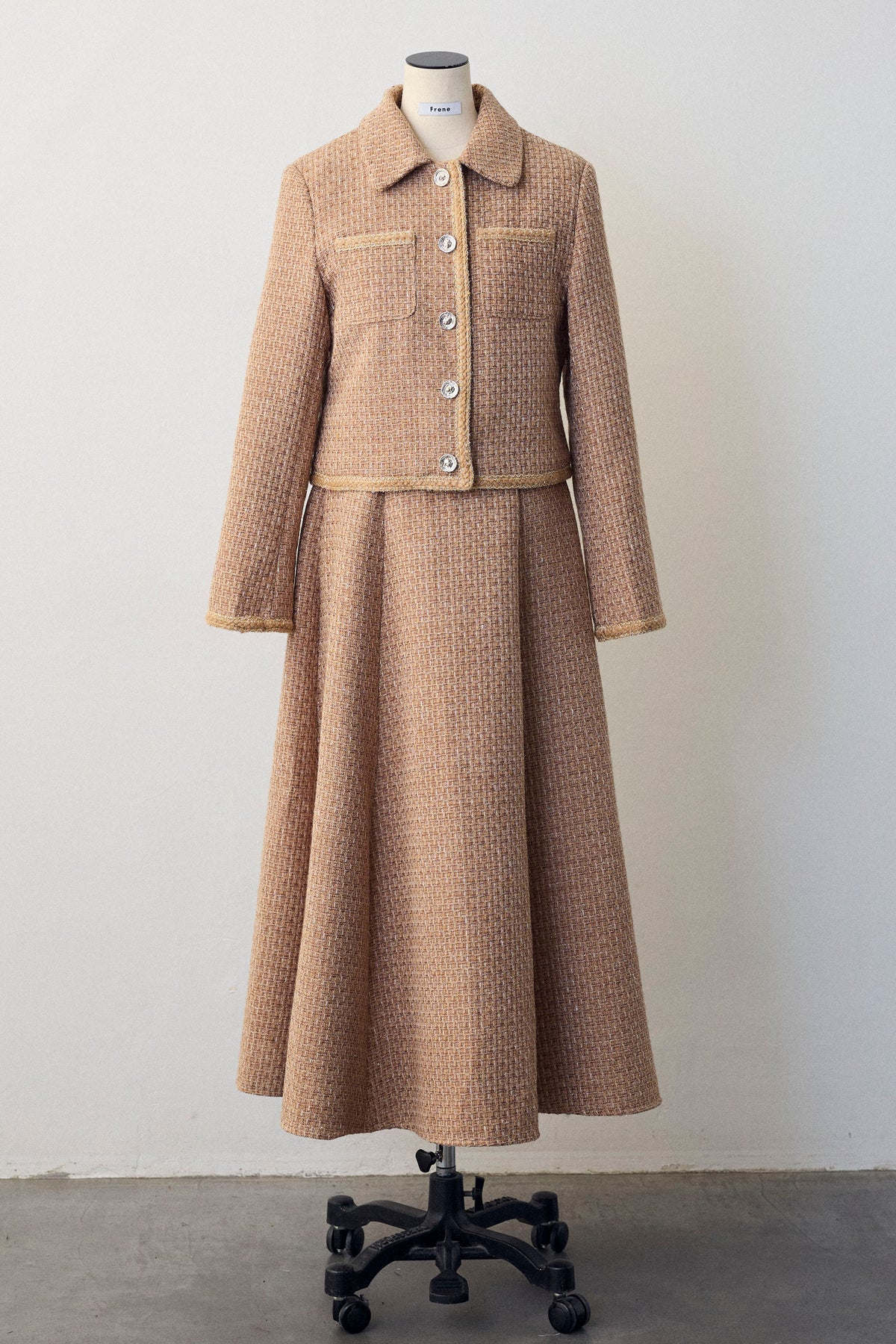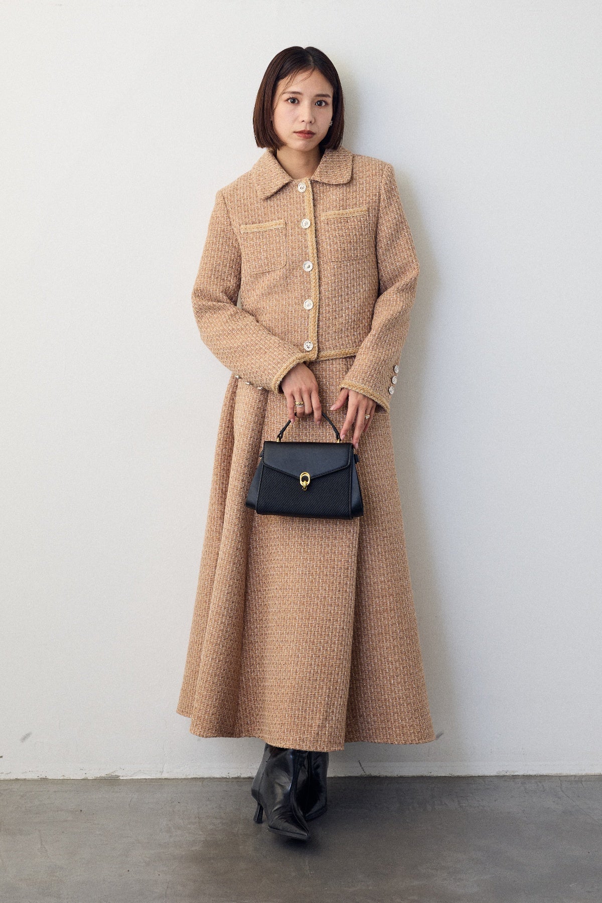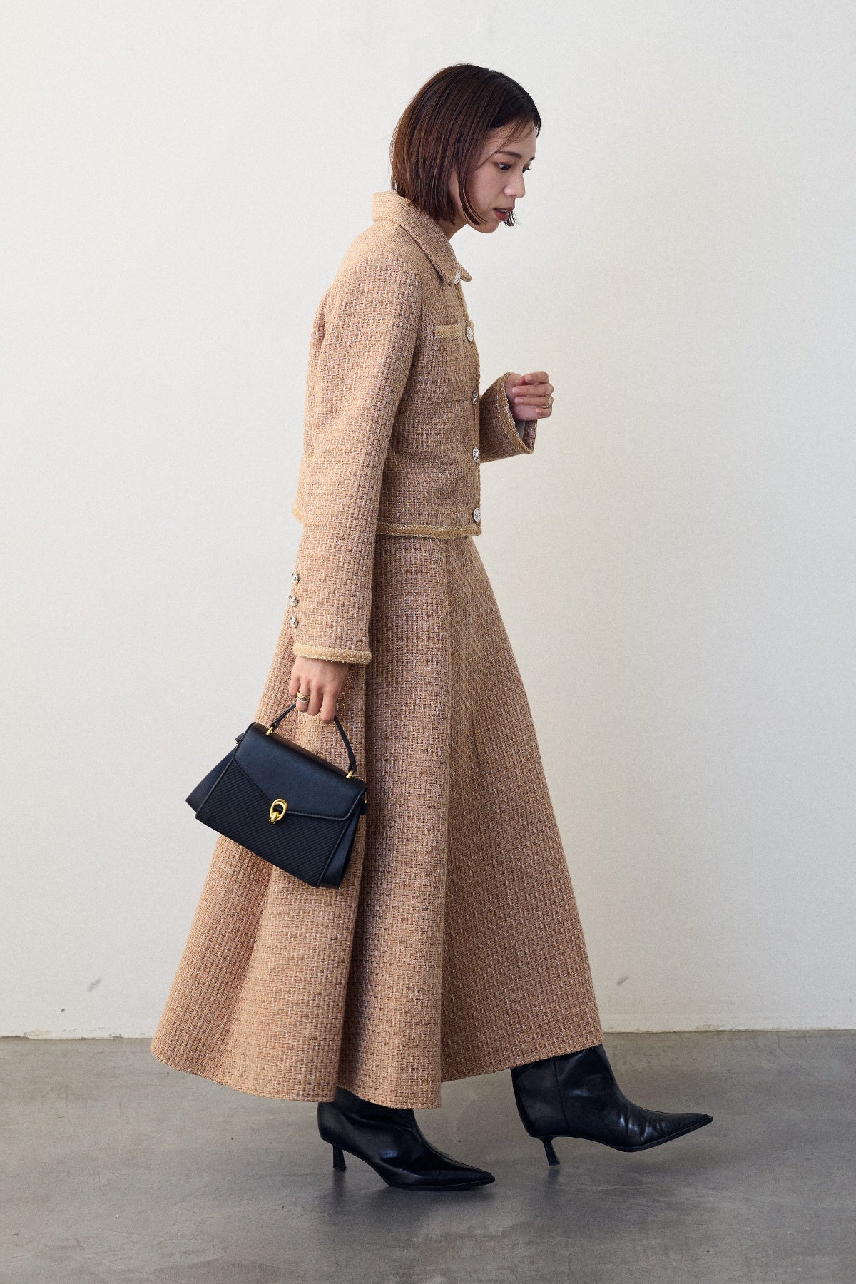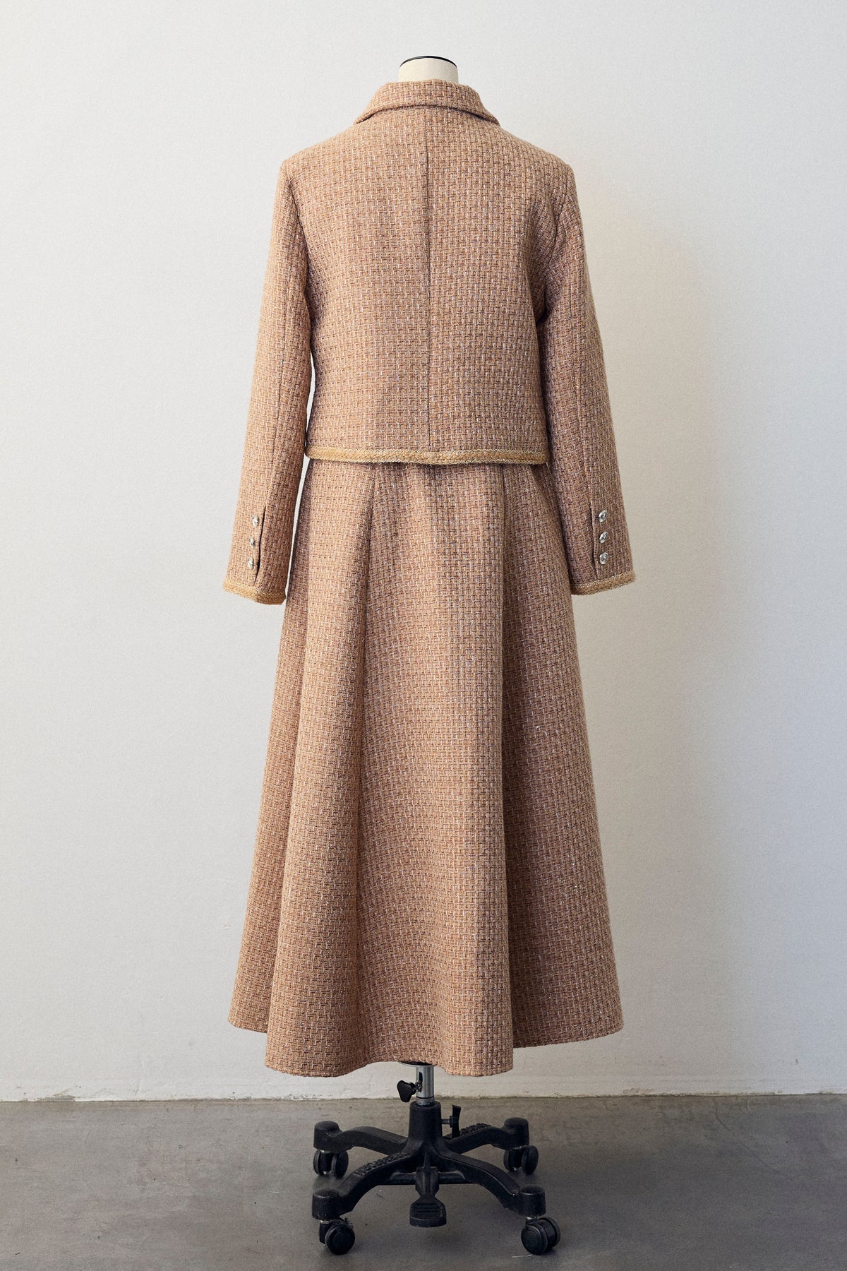 クラシカルな気品漂う、襟付きジャケットとフレアスカートのセットアップ。ゴールドのパイピングとジュエリーのようなボタンが、ハレの日に相応しい華やかさを添えます。メリハリのある美シルエットで、着るだけでスタイルアップ効果も抜群。セットでの着用はもちろん、単品使いでも着回しが効き、特別なシーンを上品に彩ります。