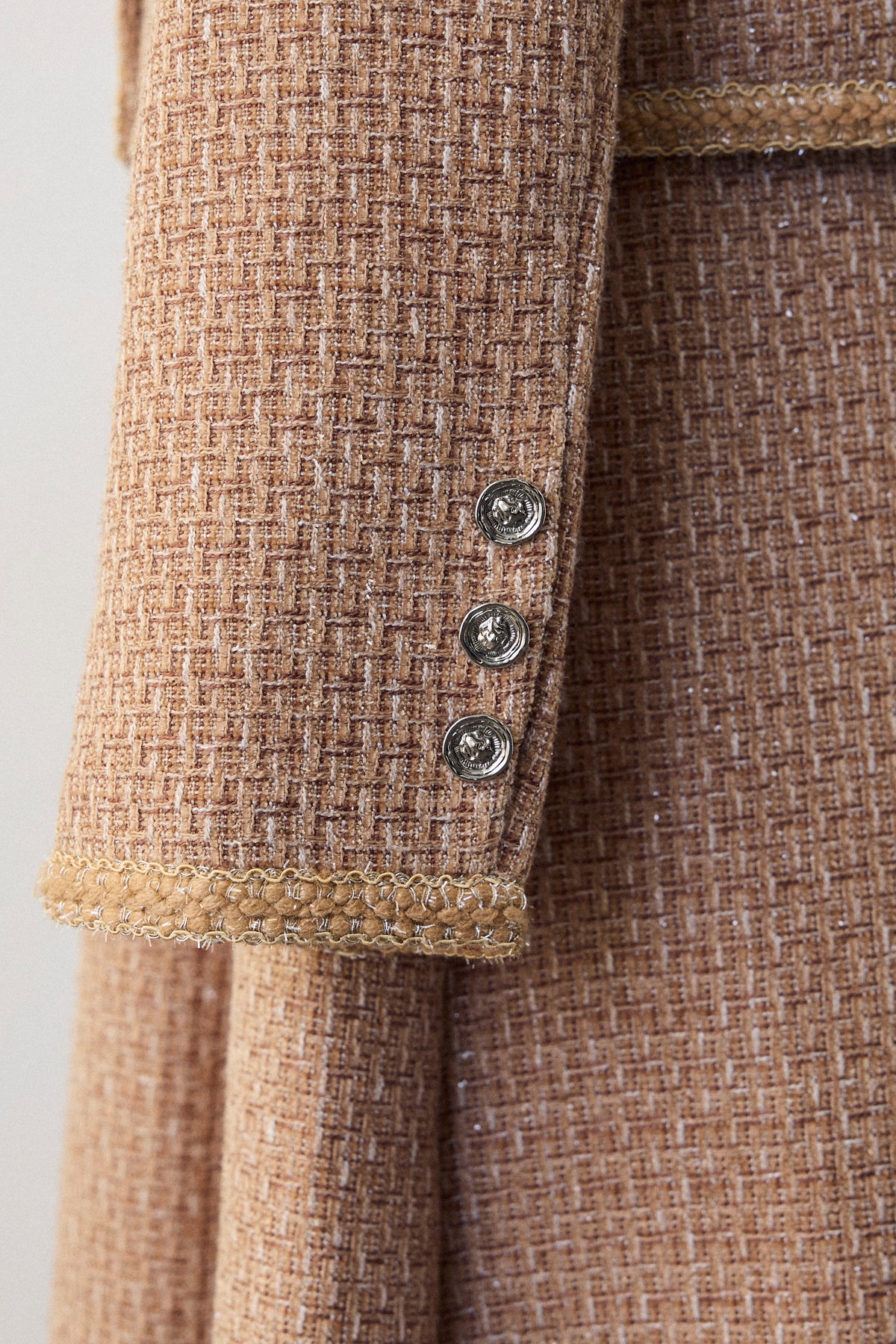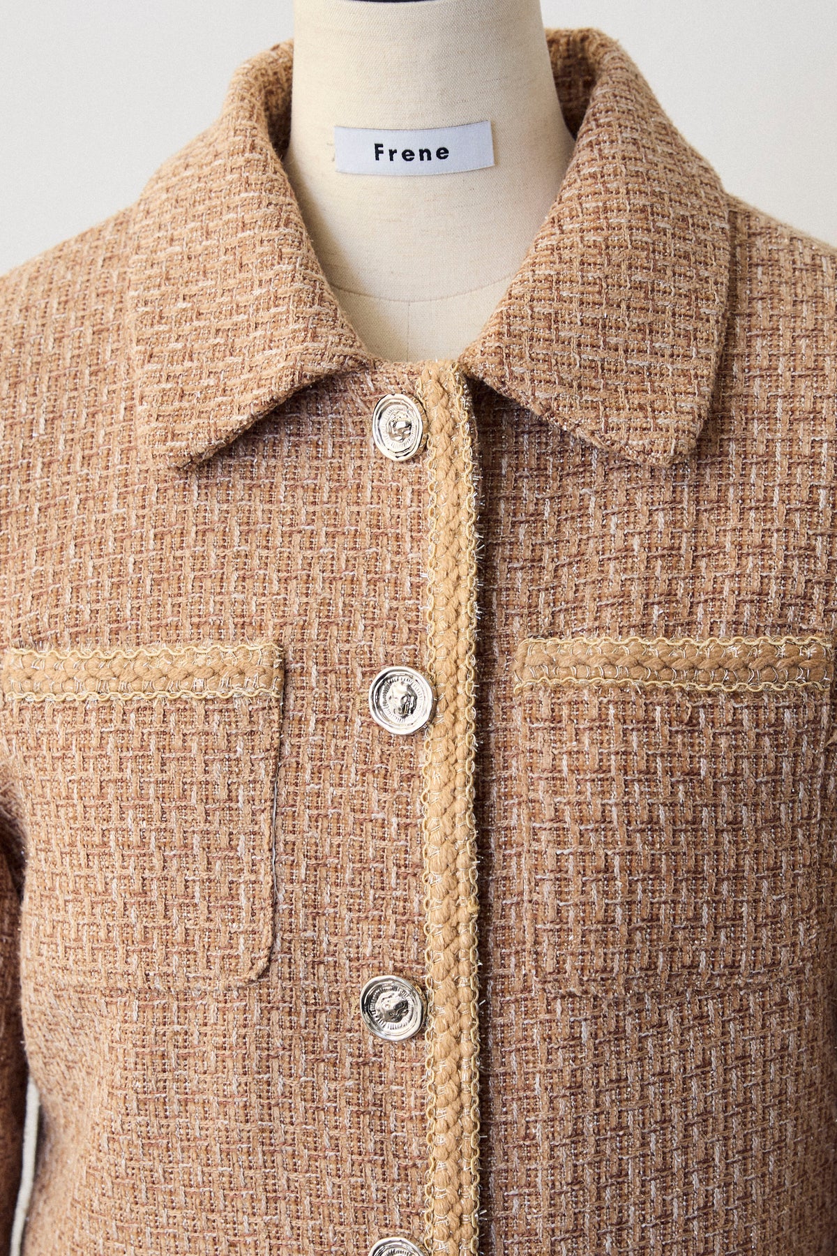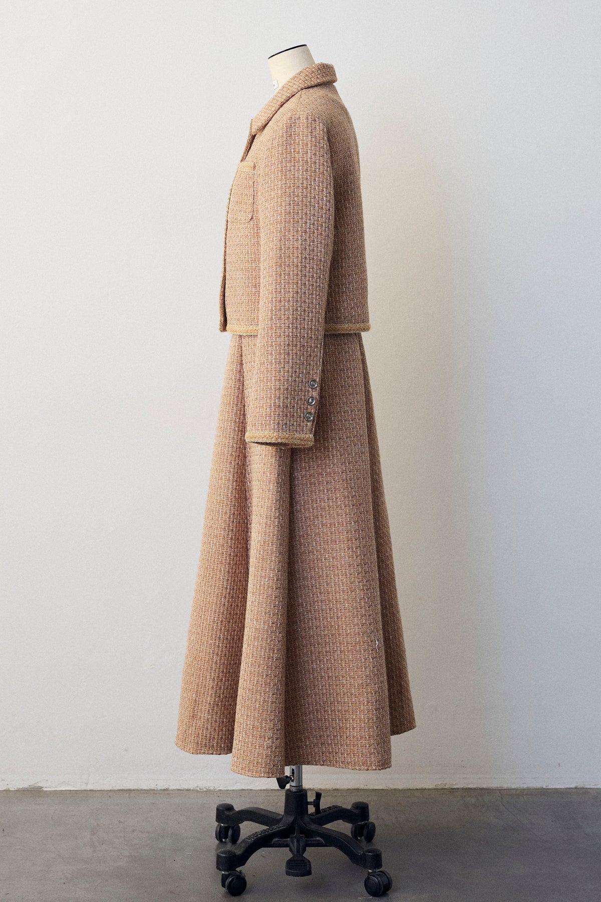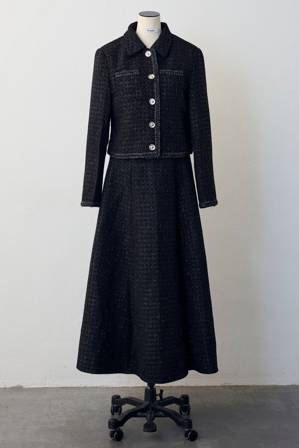 クラシカルな気品漂う、襟付きジャケットとフレアスカートのセットアップ。ゴールドのパイピングとジュエリーのようなボタンが、ハレの日に相応しい華やかさを添えます。メリハリのある美シルエットで、着るだけでスタイルアップ効果も抜群。セットでの着用はもちろん、単品使いでも着回しが効き、特別なシーンを上品に彩ります。