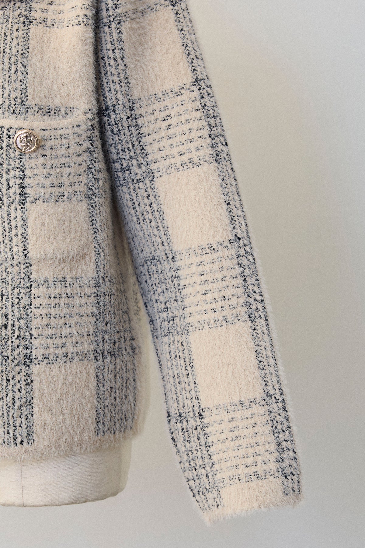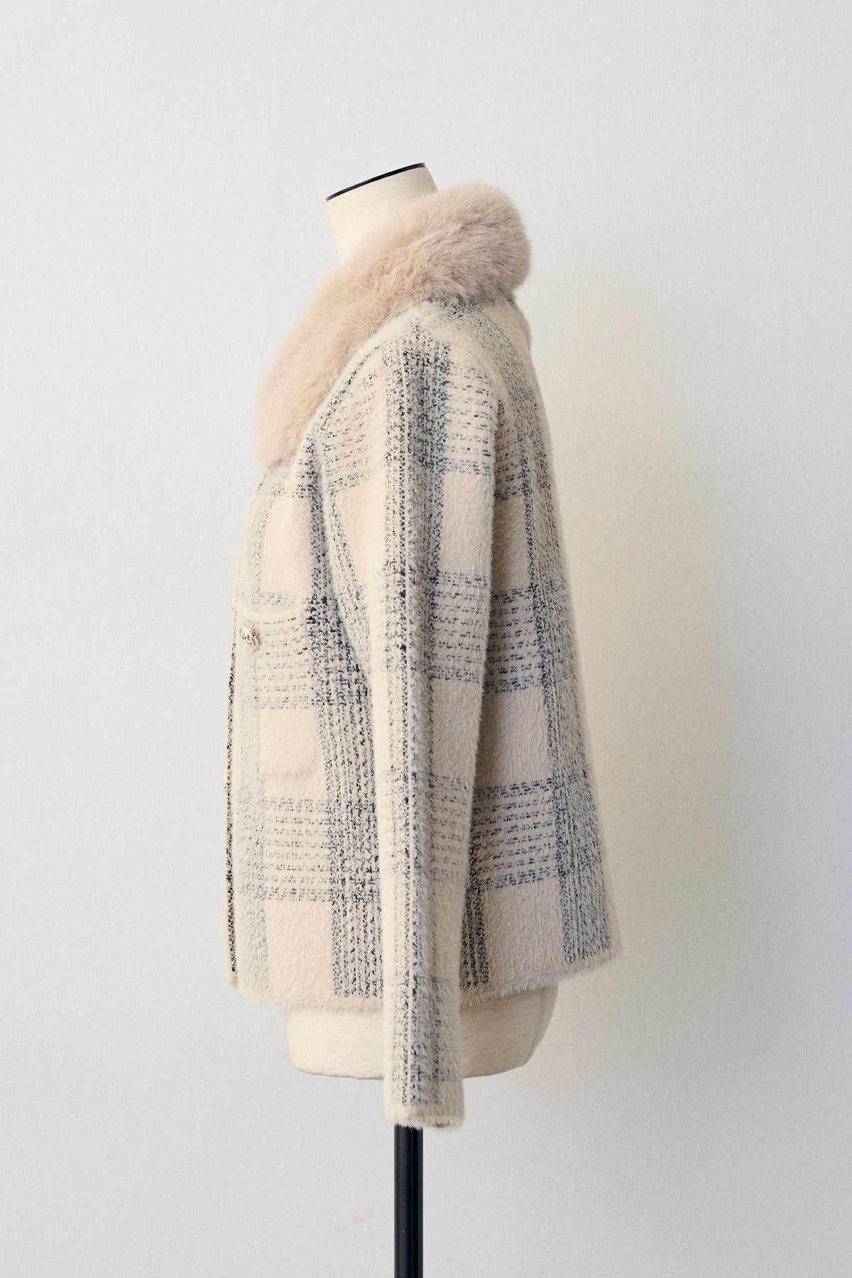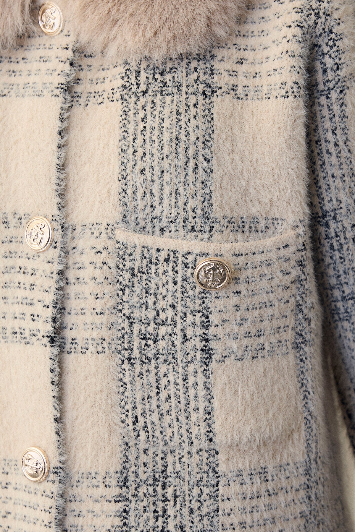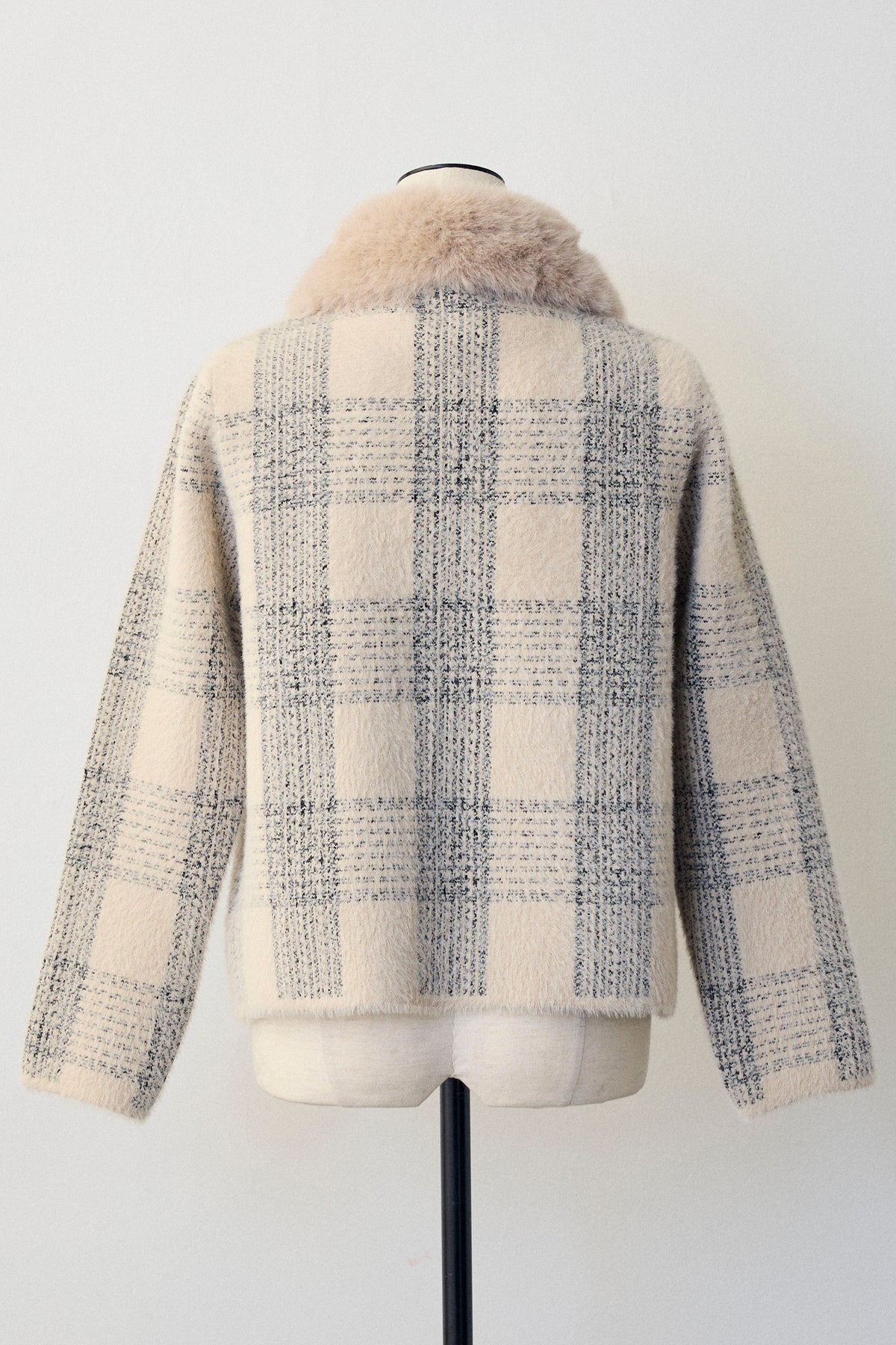 ふんわりとしたファー襟と、温かみのあるシャギーチェック柄がシーズンムードを盛り上げる主役級コーディガン。 フロントに配したアンティーク調のゴールドボタンがアクセントになり、大人のクラシカルな雰囲気を引き立てます。 コートのようなきちんと感がありながら、カーディガン感覚で軽く羽織れる絶妙なサイジングも魅力。 シンプルなコーデにプラスするだけで一気に華やかさが増し、デイリーからお出かけまで幅広く活躍する一着です。