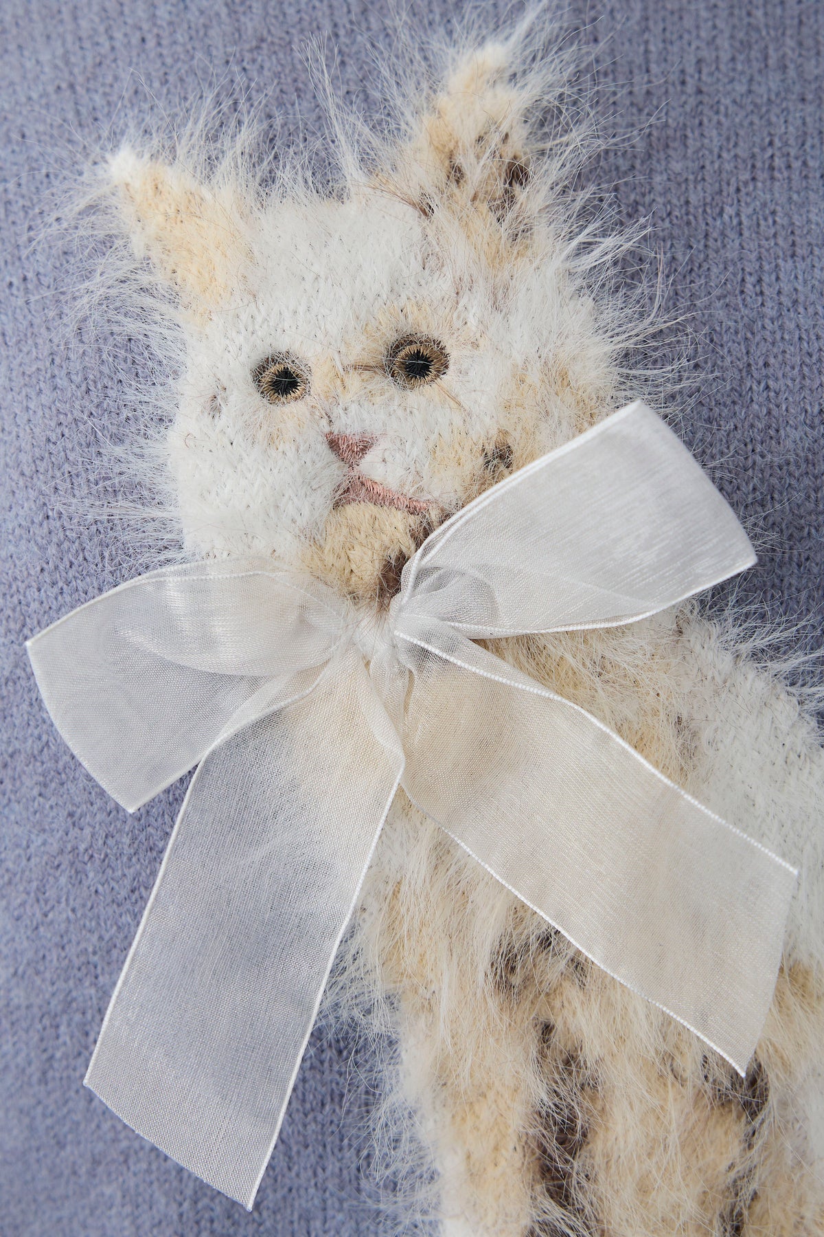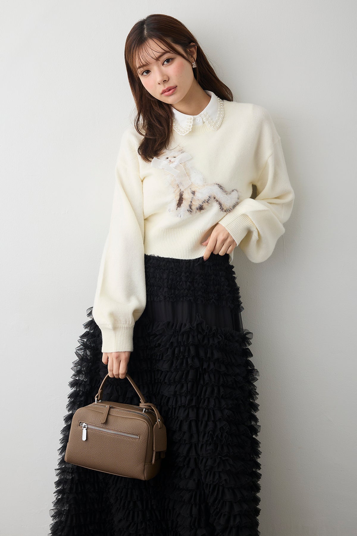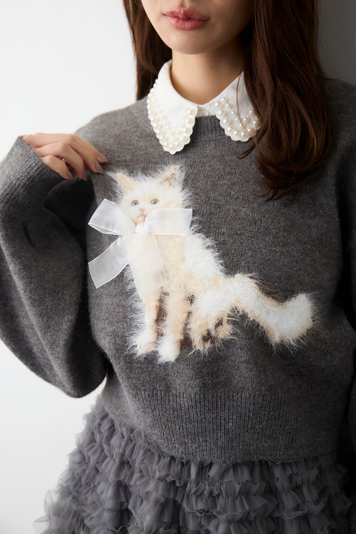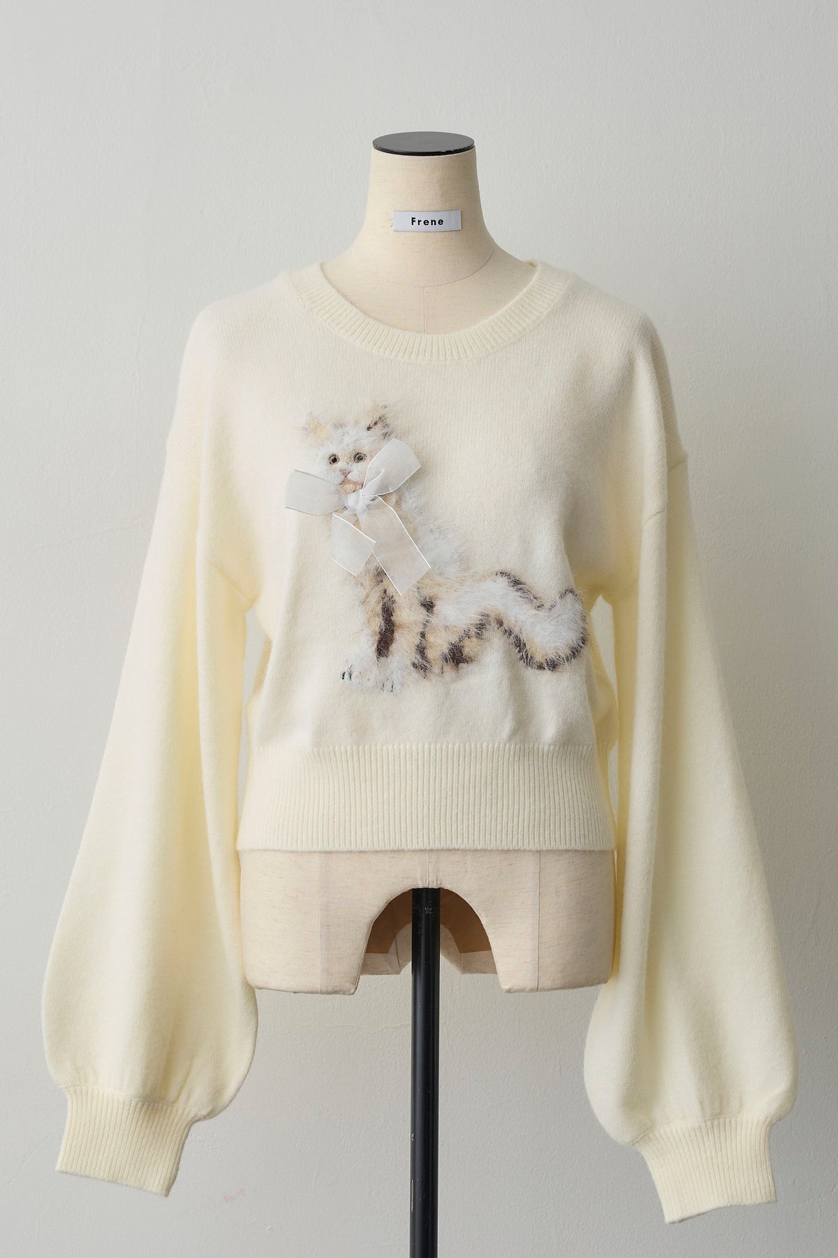 フロントに施されたふわふわのシャギー素材のキャットモチーフが目を惹く、大人の遊び心たっぷりのニットプルオーバー。 猫の首元にあしらわれたシアーなリボンが立体的なアクセントになり、フェミニンなムードを高めてくれます。 ふんわりとしたボリューム袖と、ウエストですっきりと止まる幅広のリブ切り替えがメリハリを生み、スカートやワイドパンツとも好バランス。 一枚で着るのはもちろん、襟付きのブラウスをレイヤードしてクラシカルに着こなすのもおすすめな、秋冬のスタイルを華やかに彩る一着です。