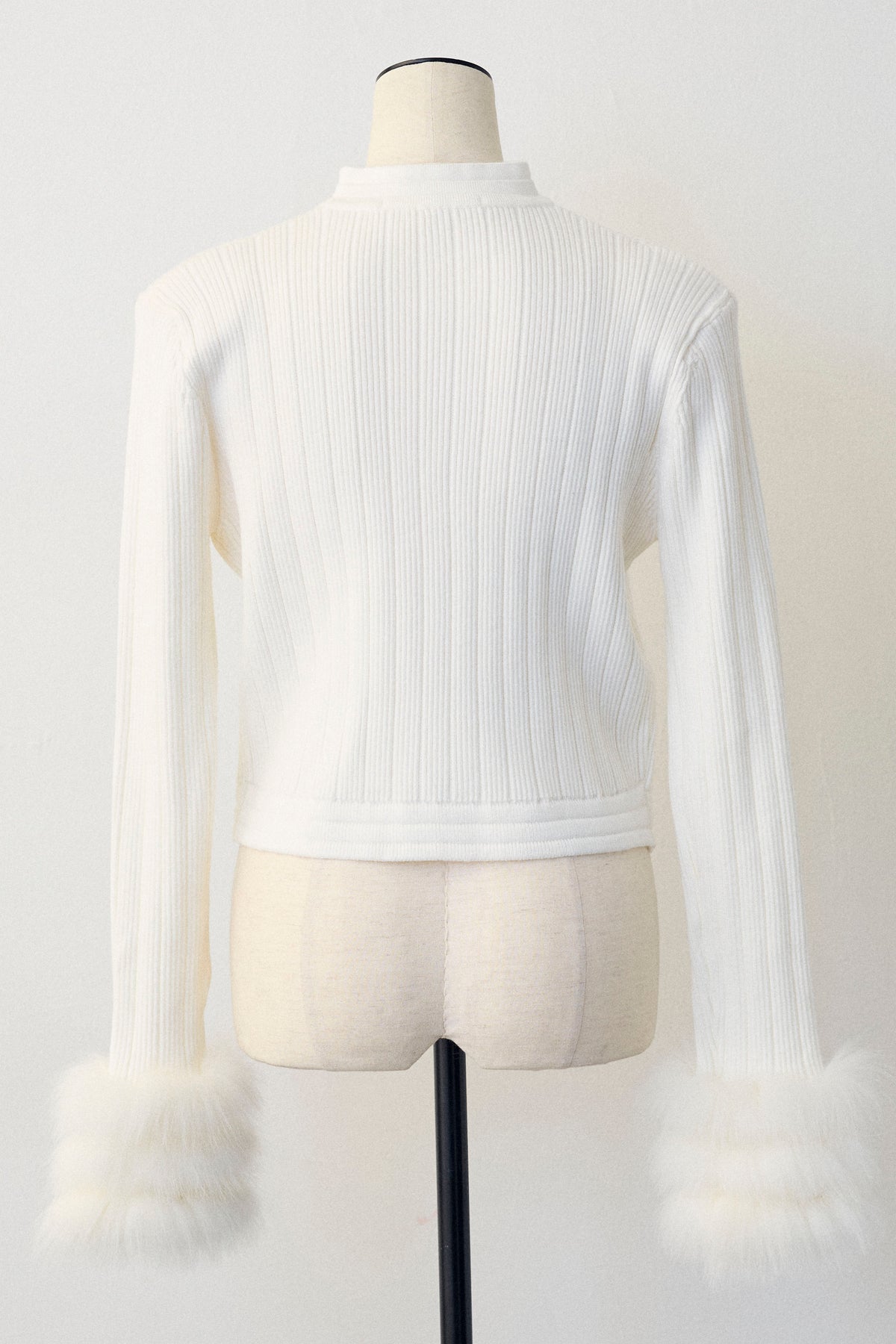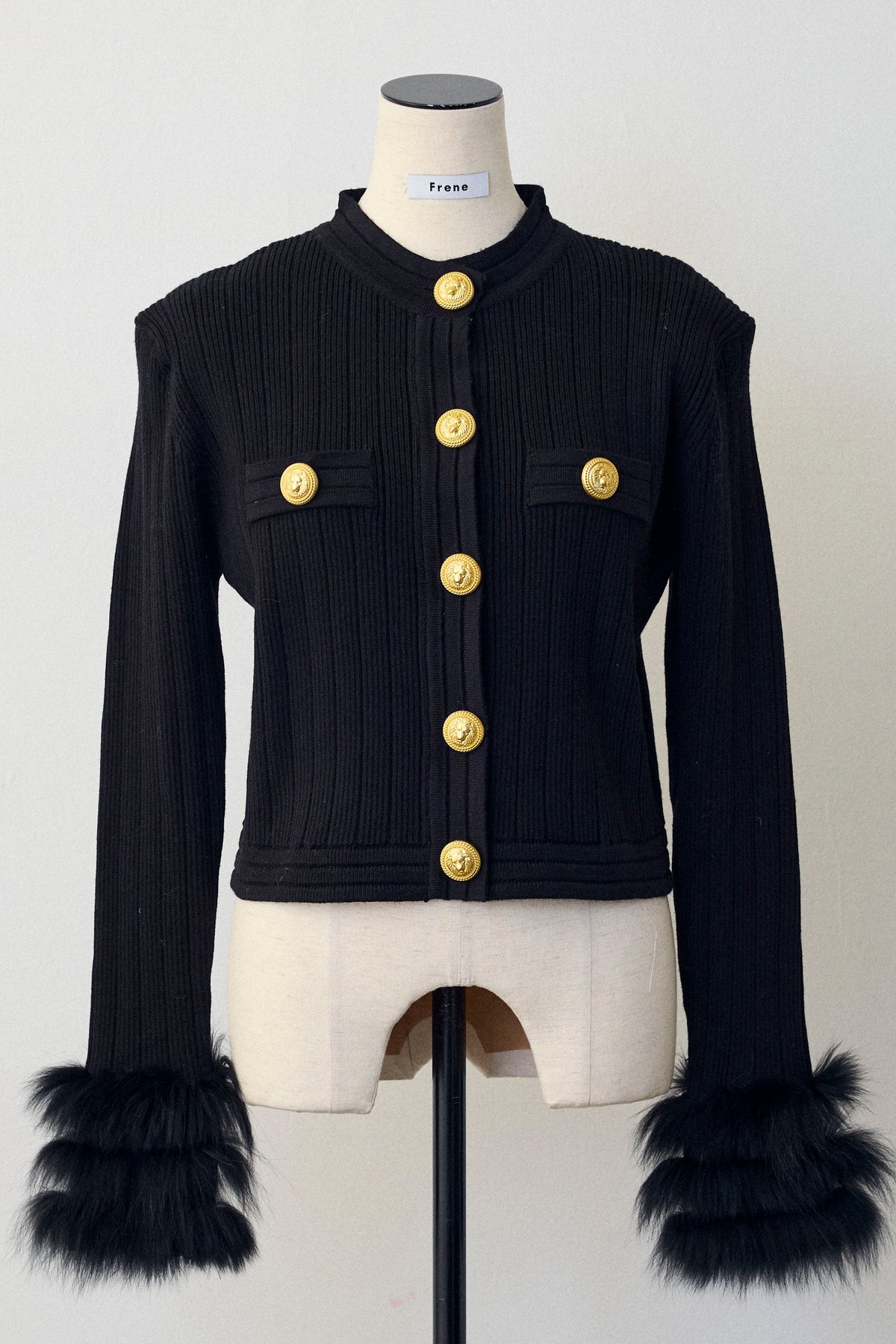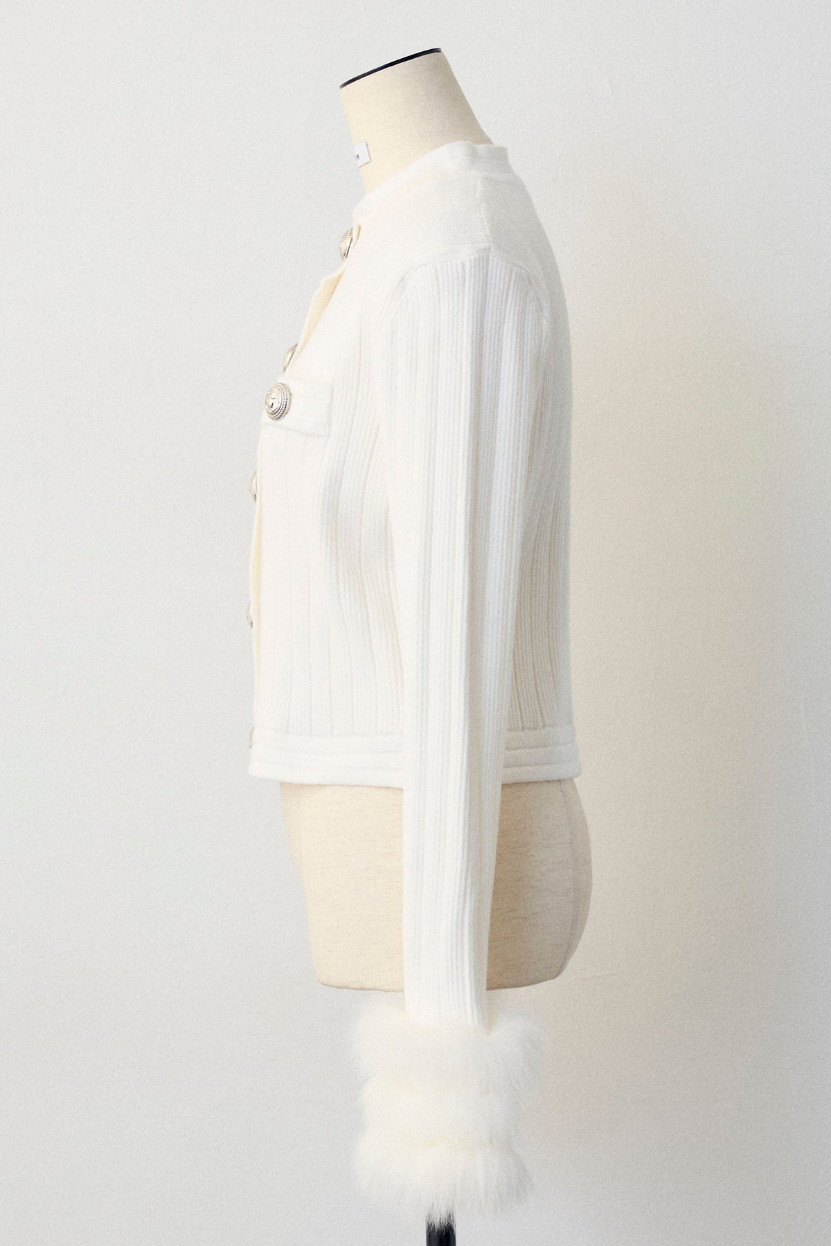袖口にあしらわれたボリューミーなファーが、手元を華やかに彩る主役級のニットカーディガン。 縦のラインを強調するリブ編みと、フロントやポケットに配したヴィンテージライクなボタンが、洗練された大人のクラシカルスタイルを演出します。 もたつきのないコンパクトなシルエットは、トレンドのボリュームスカートやワイドパンツともバランスよく決まり、脚長効果も期待できる一着。大人のフェミニンスタイルに欠かせないアイテムです。