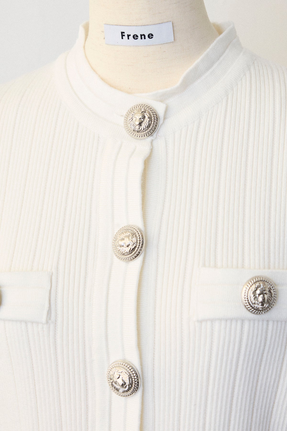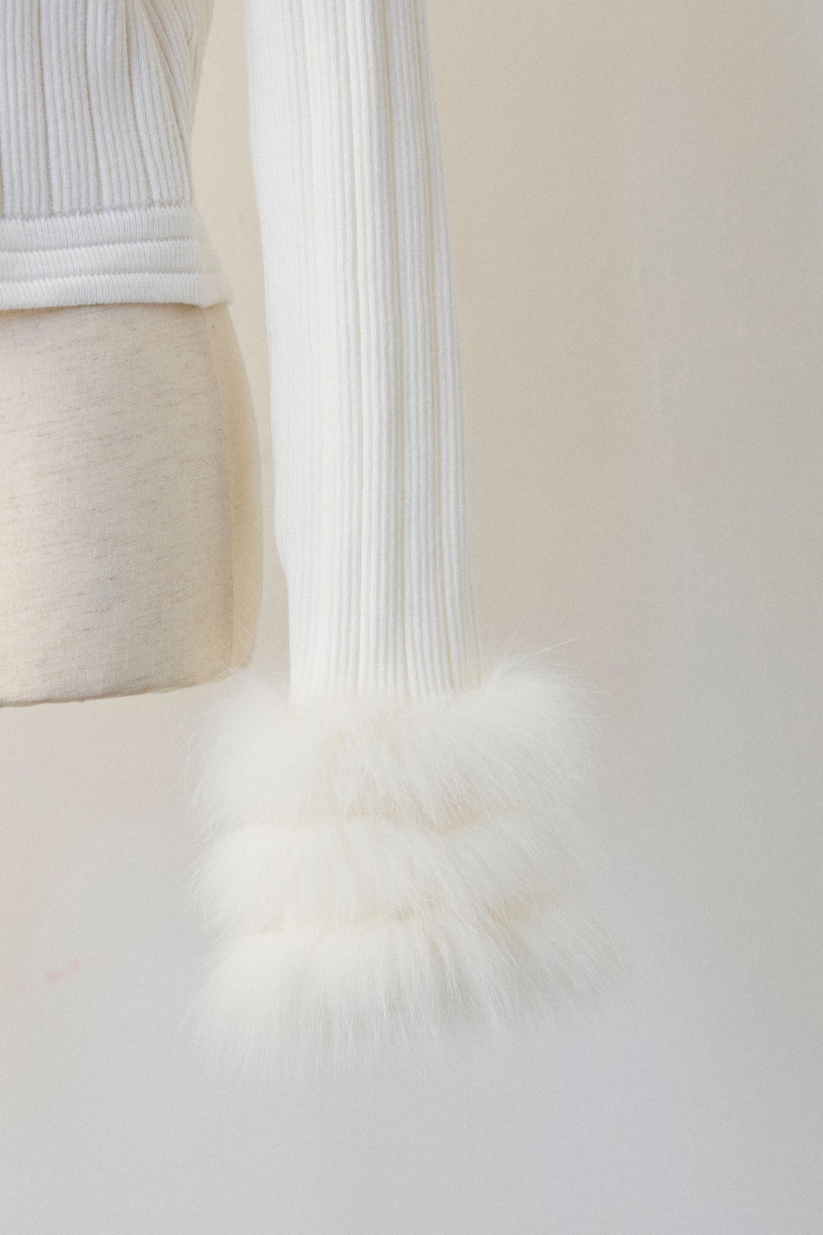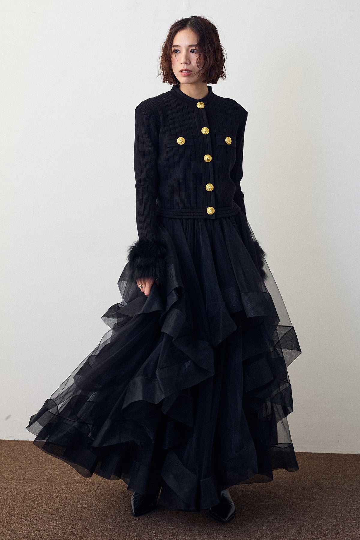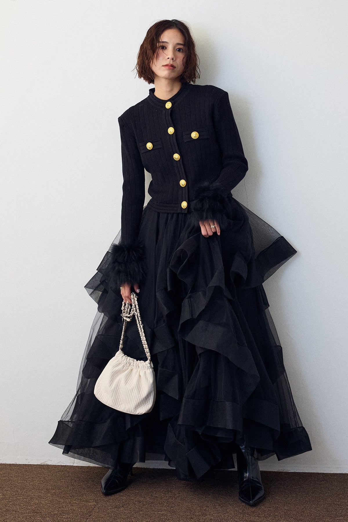 袖口にあしらわれたボリューミーなファーが、手元を華やかに彩る主役級のニットカーディガン。 縦のラインを強調するリブ編みと、フロントやポケットに配したヴィンテージライクなボタンが、洗練された大人のクラシカルスタイルを演出します。 もたつきのないコンパクトなシルエットは、トレンドのボリュームスカートやワイドパンツともバランスよく決まり、脚長効果も期待できる一着。大人のフェミニンスタイルに欠かせないアイテムです。