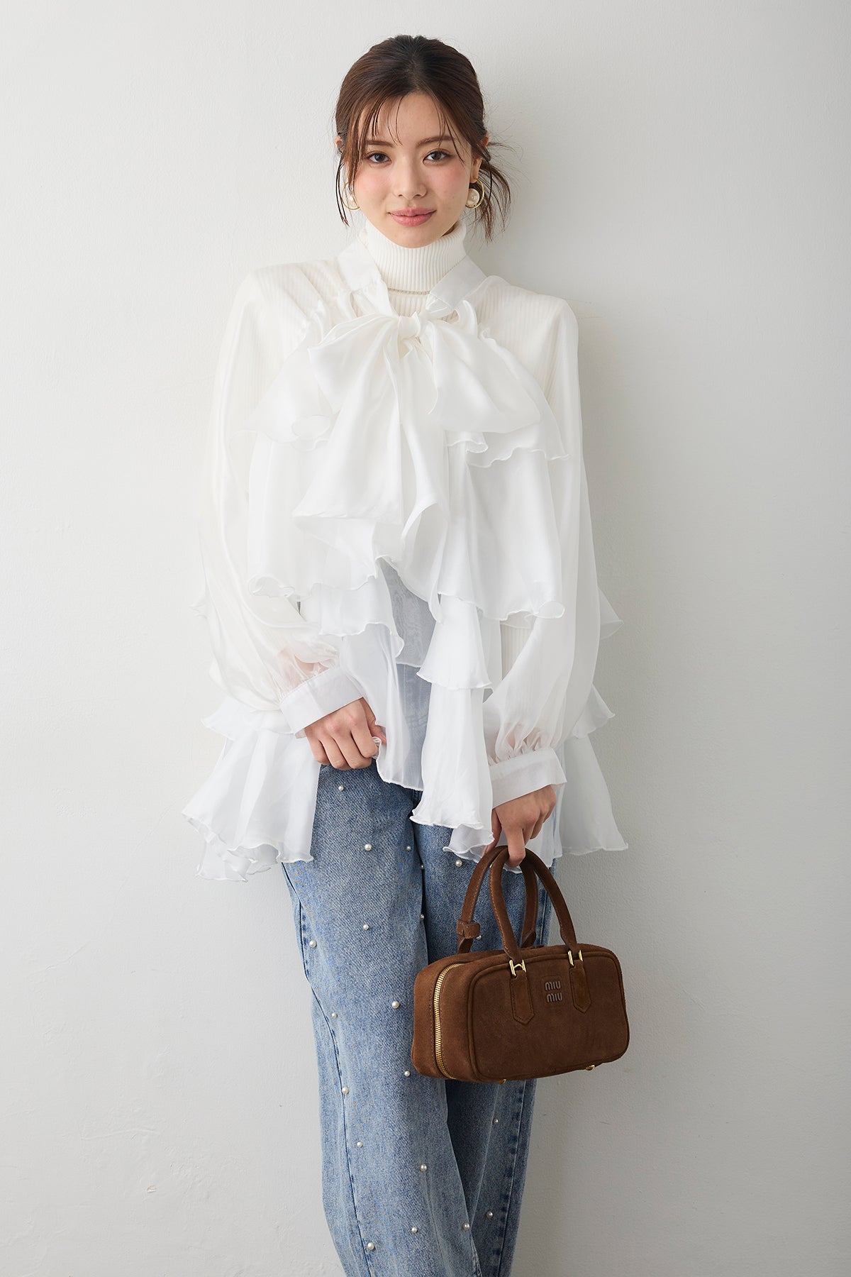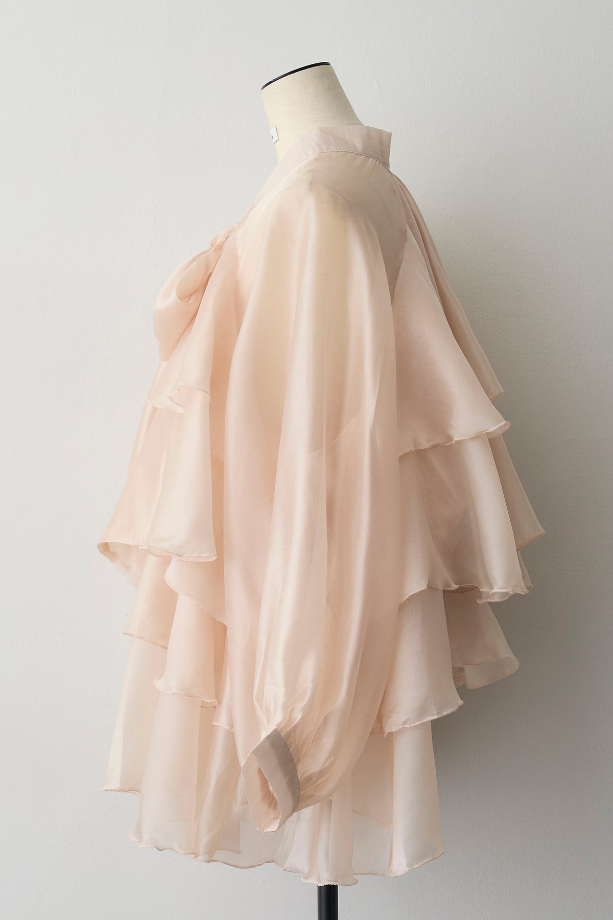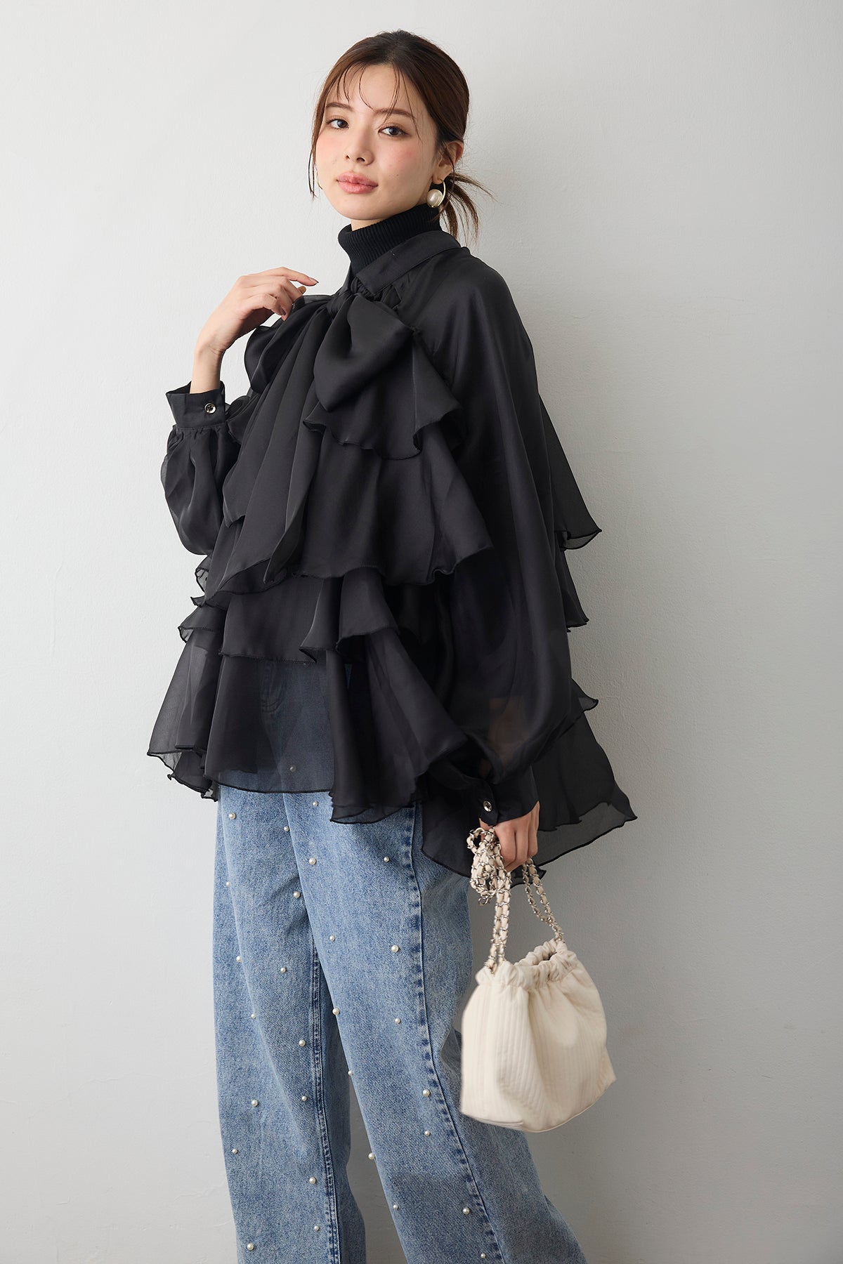 フロントに施された大きなリボンと、裾に向かって広がるティアードフリルがドラマティックなチュニックブラウス。 エアリーな透け感のある素材を使用しているため、ボリュームがありながらも重たく見えず、洗練された軽やかな印象を与えます。 ヒップラインまで隠れるチュニック丈は、細身のパンツやデニムと合わせるだけでバランス良く決まり、自然な体型カバーを実現。 インナーにタートルネックを合わせればシーズンレスで活躍し、いつものコーディネートを一気に華やかなフェミニンスタイルへと格上げしてくれる一着です。