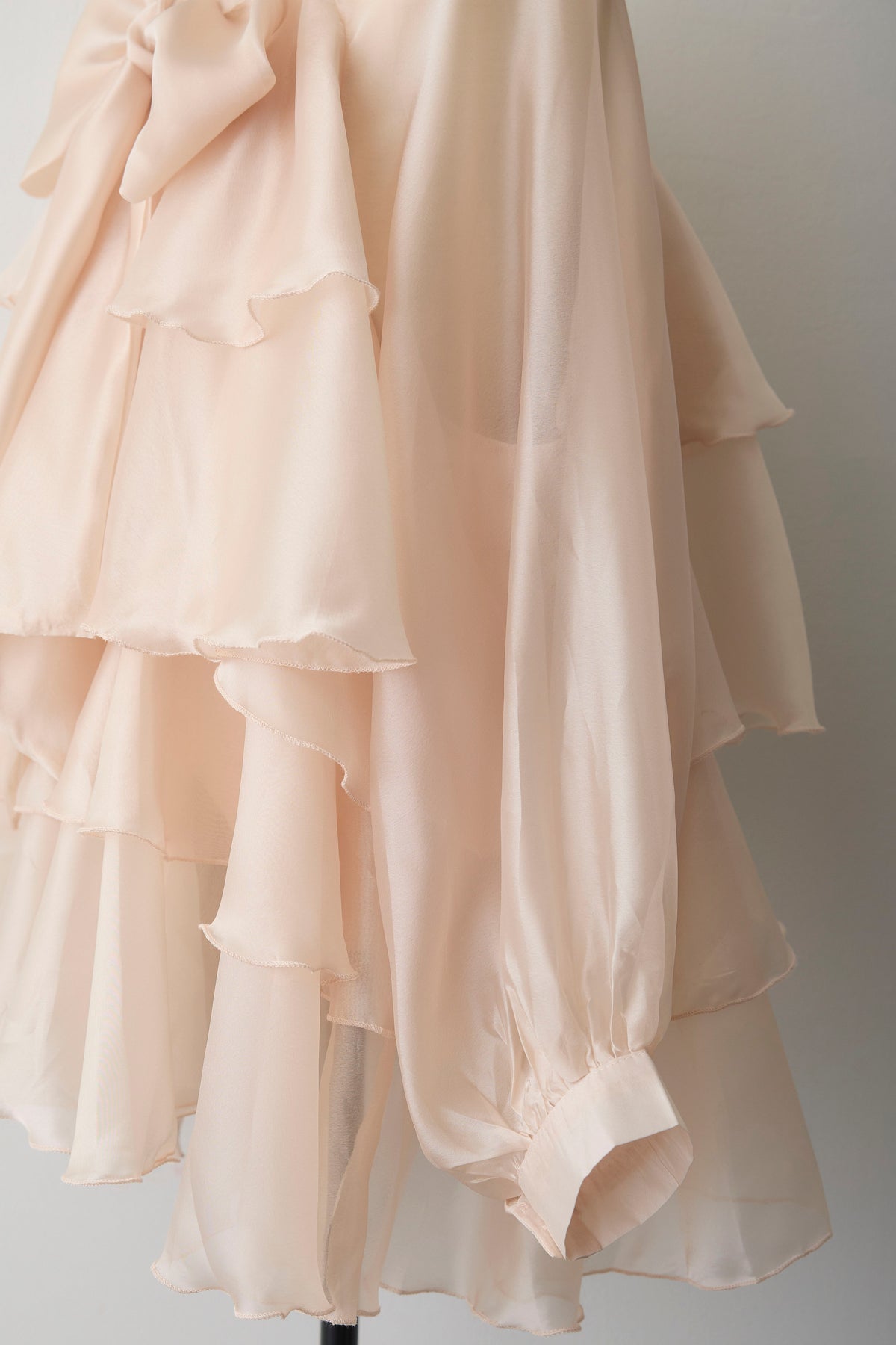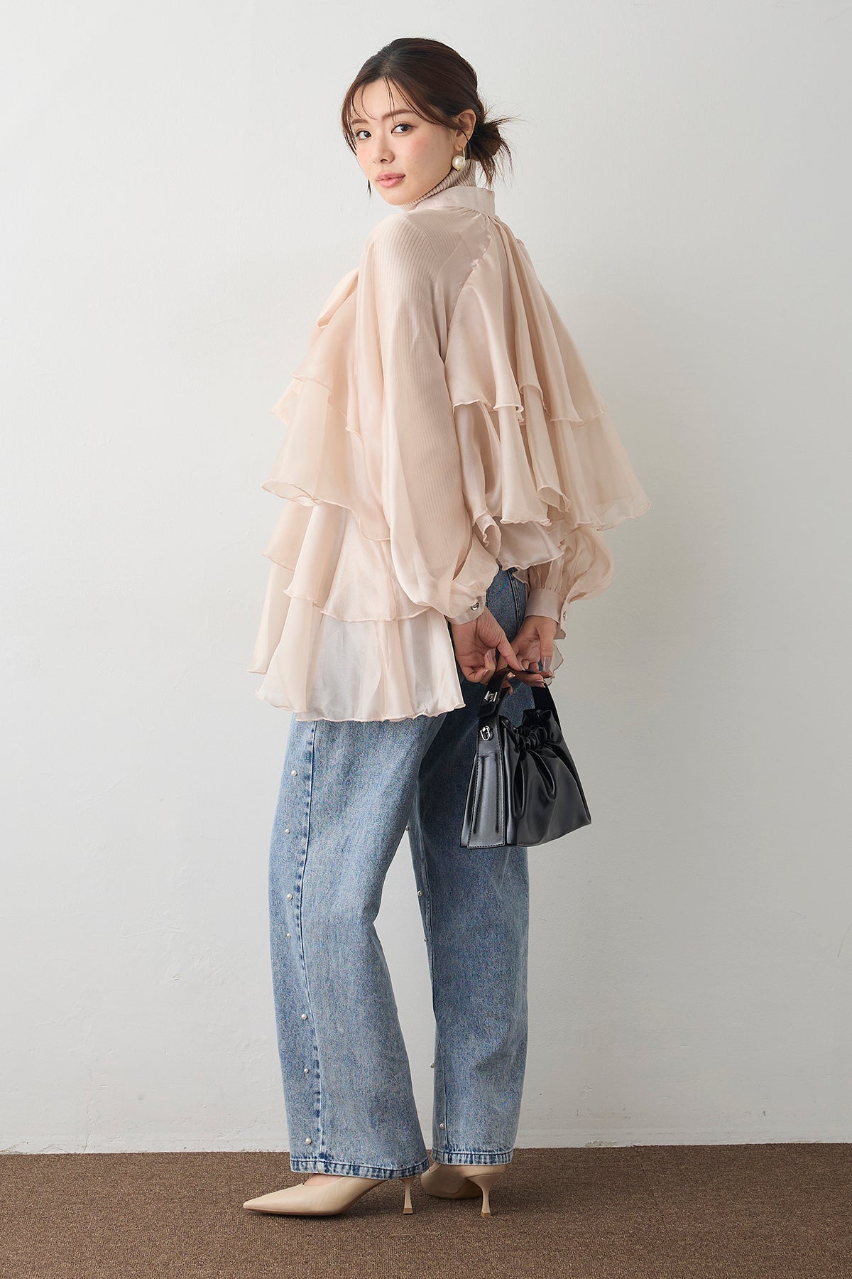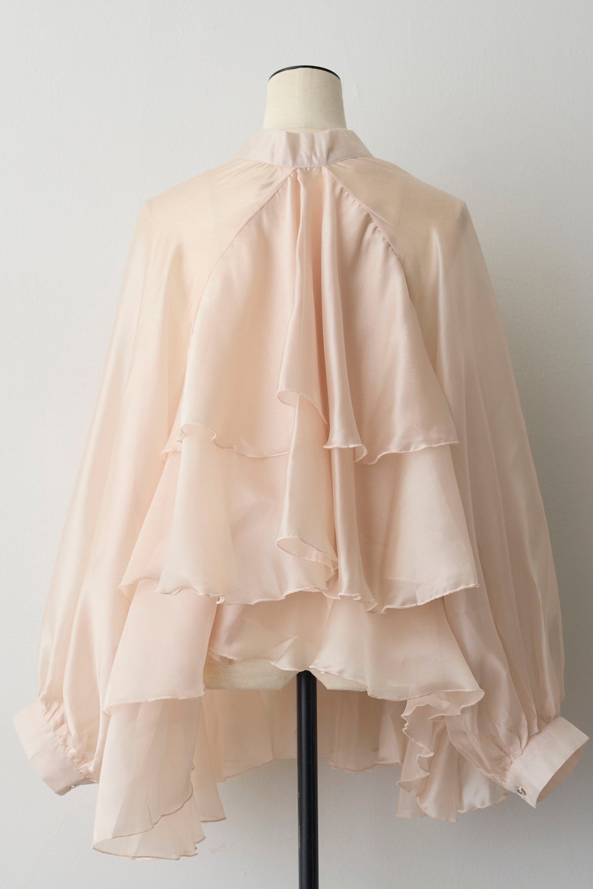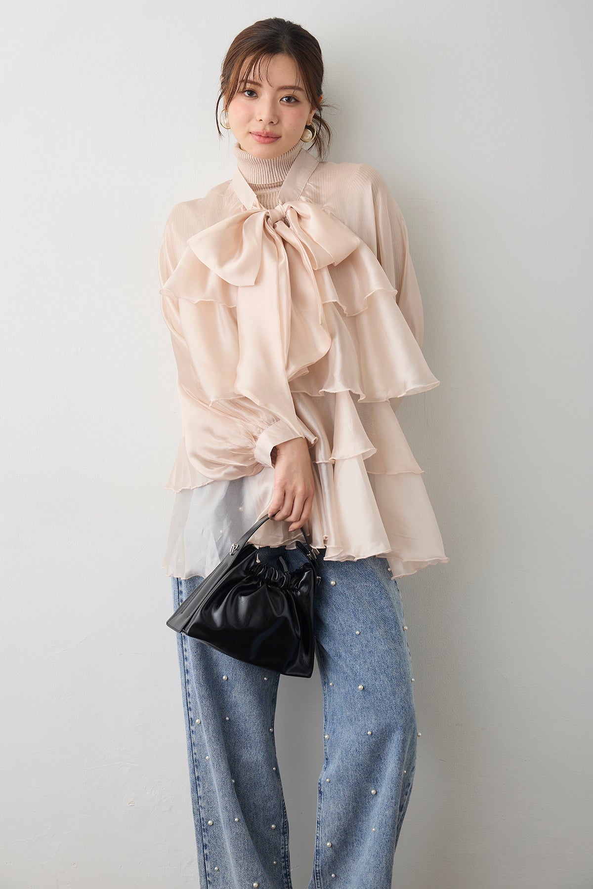 フロントに施された大きなリボンと、裾に向かって広がるティアードフリルがドラマティックなチュニックブラウス。 エアリーな透け感のある素材を使用しているため、ボリュームがありながらも重たく見えず、洗練された軽やかな印象を与えます。 ヒップラインまで隠れるチュニック丈は、細身のパンツやデニムと合わせるだけでバランス良く決まり、自然な体型カバーを実現。 インナーにタートルネックを合わせればシーズンレスで活躍し、いつものコーディネートを一気に華やかなフェミニンスタイルへと格上げしてくれる一着です。