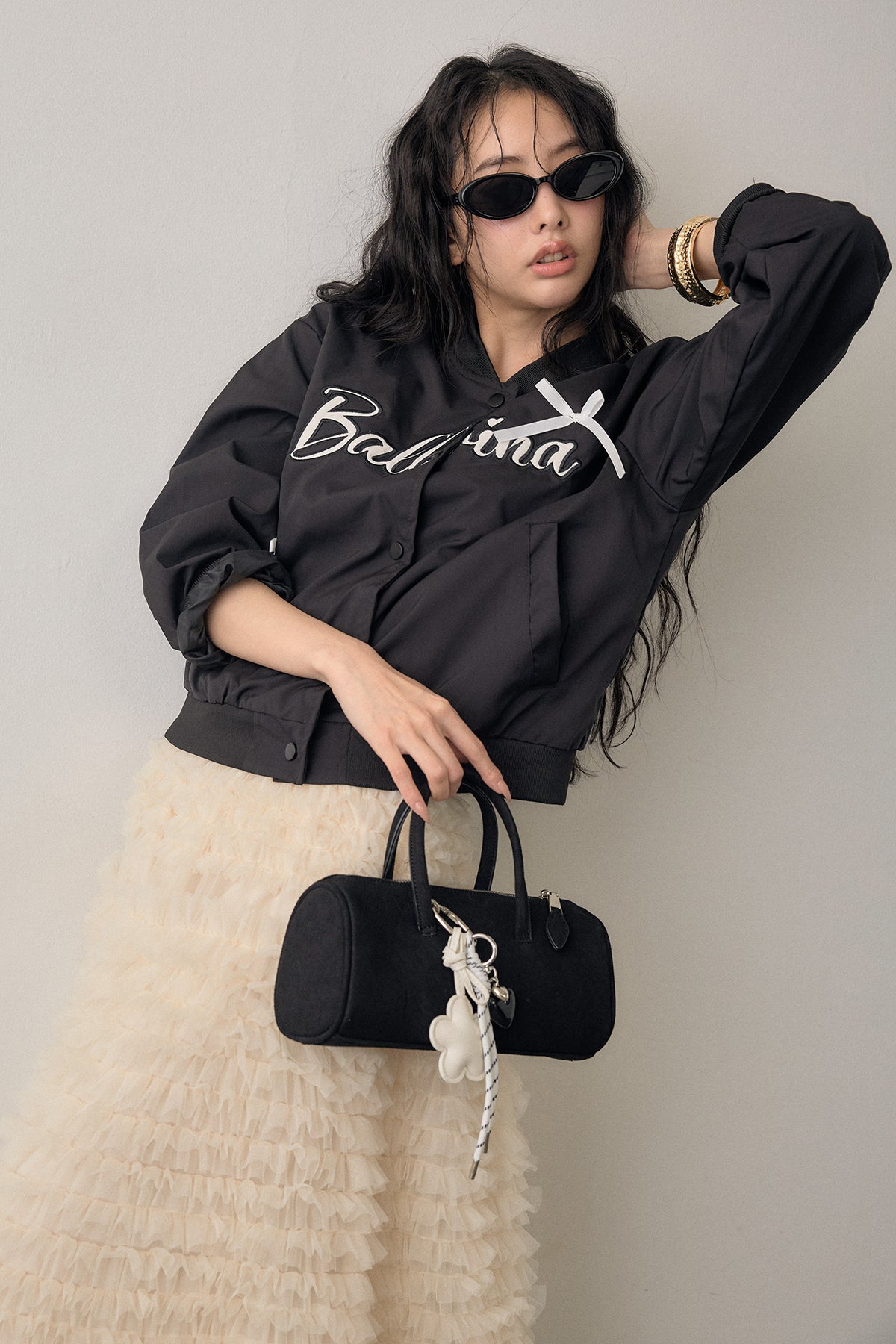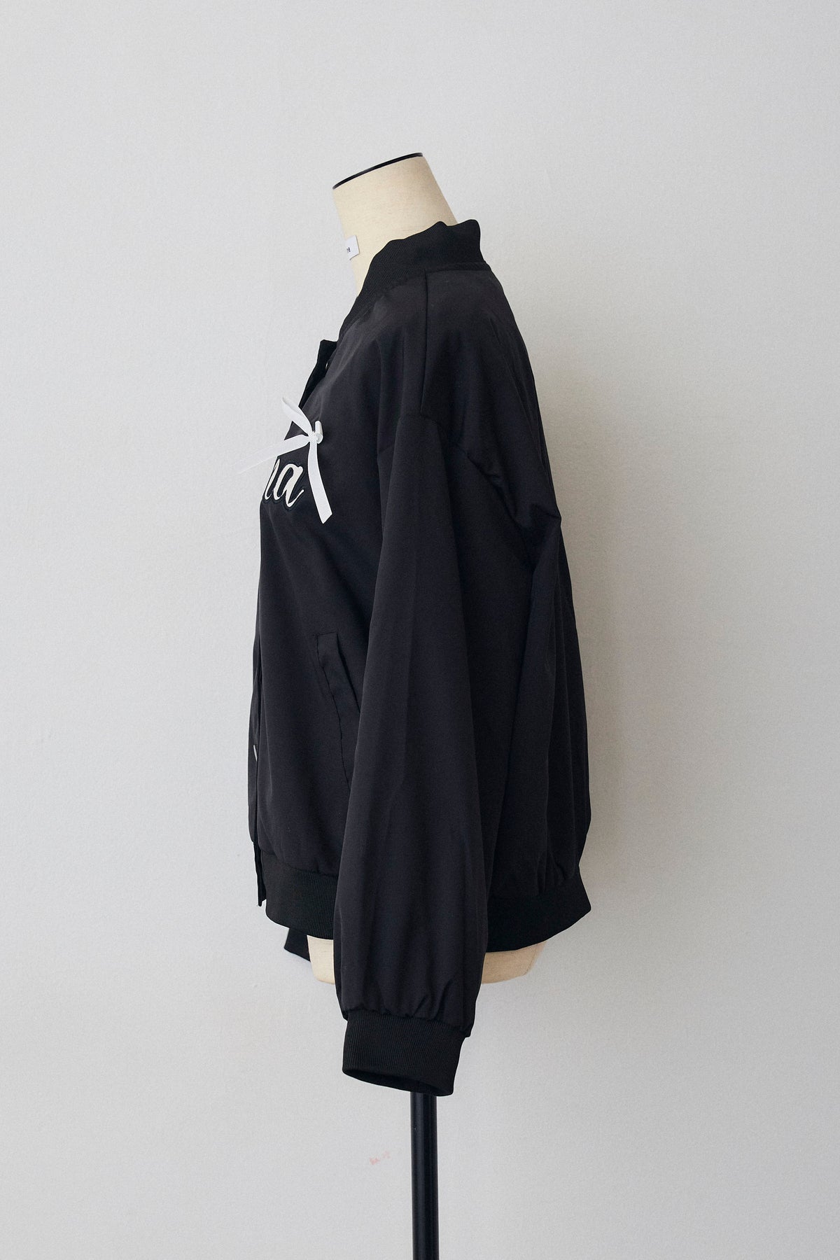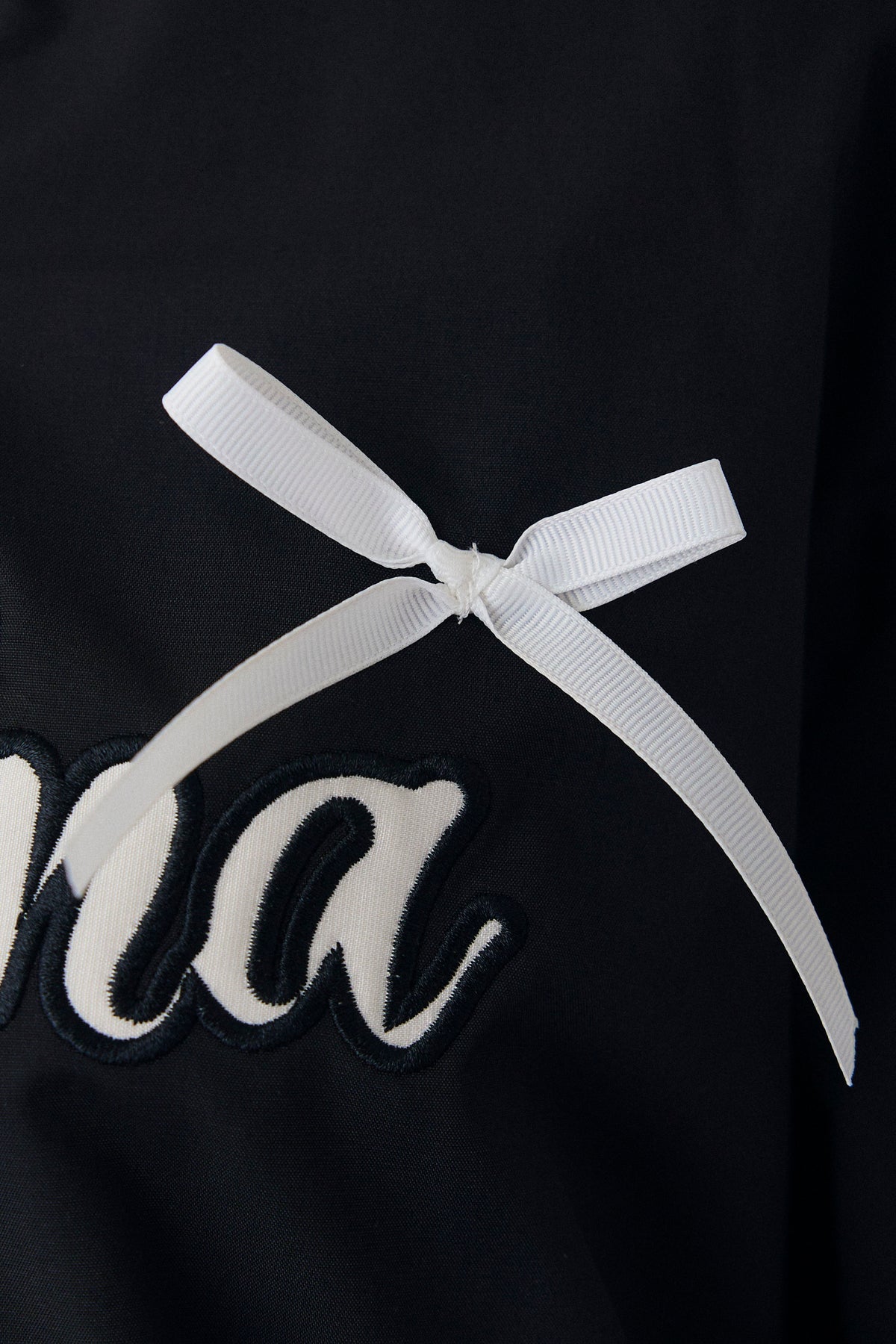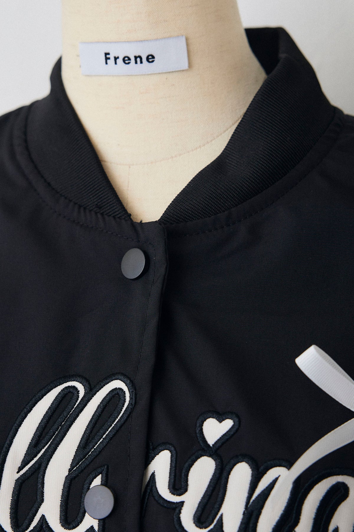 フロントのロゴ刺繍と小さなリボンモチーフが目を引く、スポーティーさと甘さを掛け合わせたブルゾン。程よくハリのある軽い素材で仕立てているため、ロングスカートやワンピースに羽織ってもバランス良く決まり、デイリーに活躍します。襟と裾、袖口のリブがシルエットを引き締めつつ、ゆったりとした身幅で中にニットも着込みやすい一枚。デニムでカジュアルに、チュールスカートと合わせてフェミニンにと、幅広いスタイリングが楽しめます。