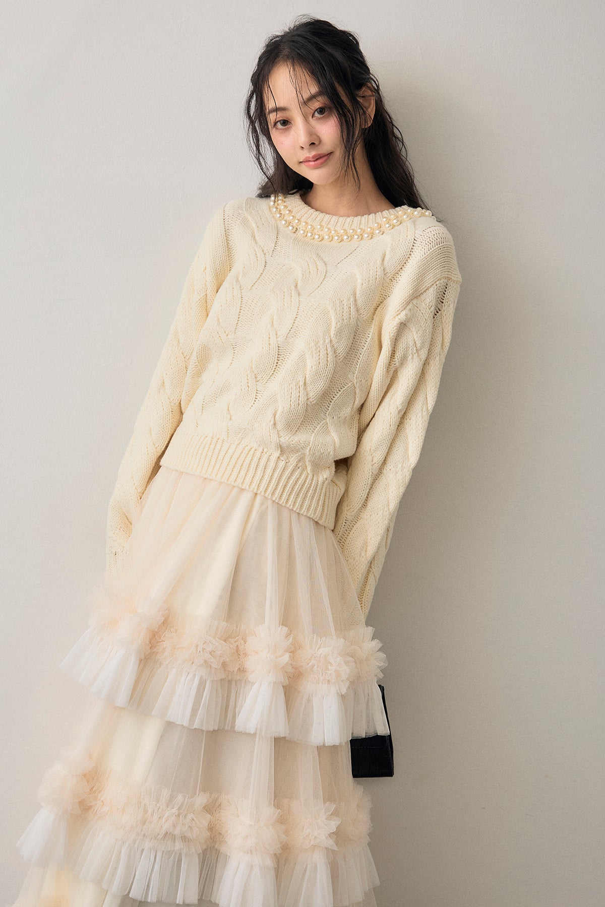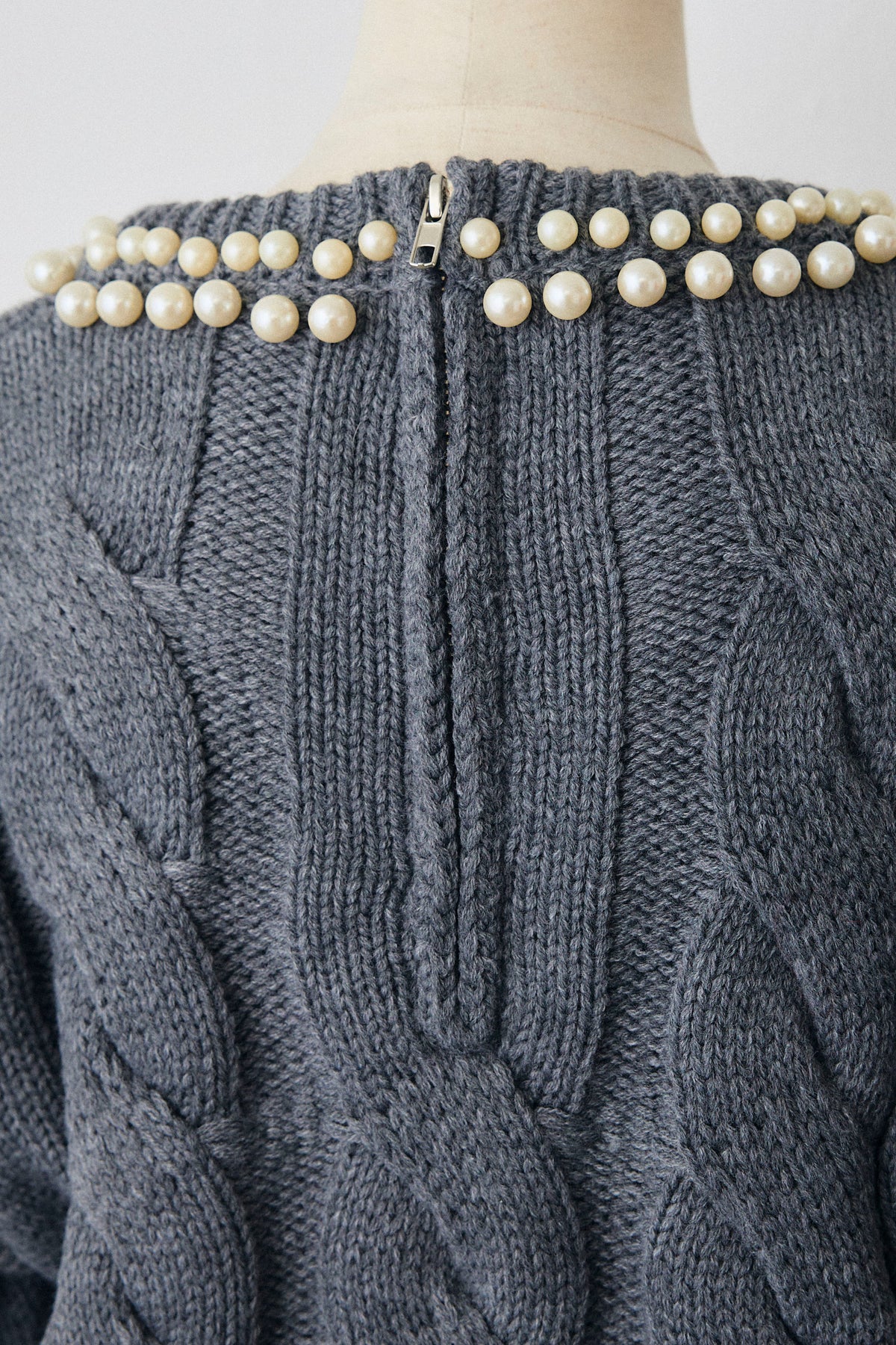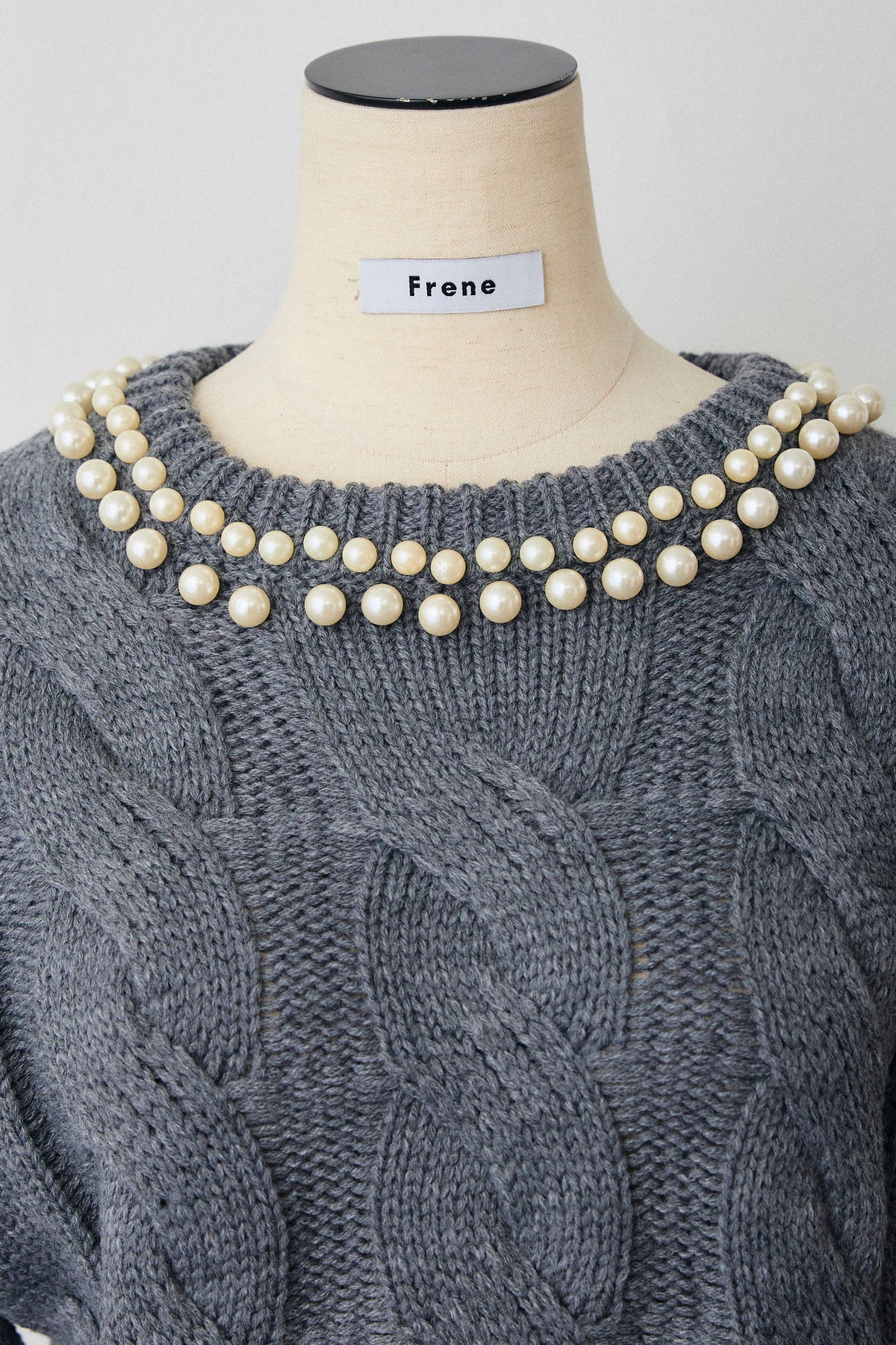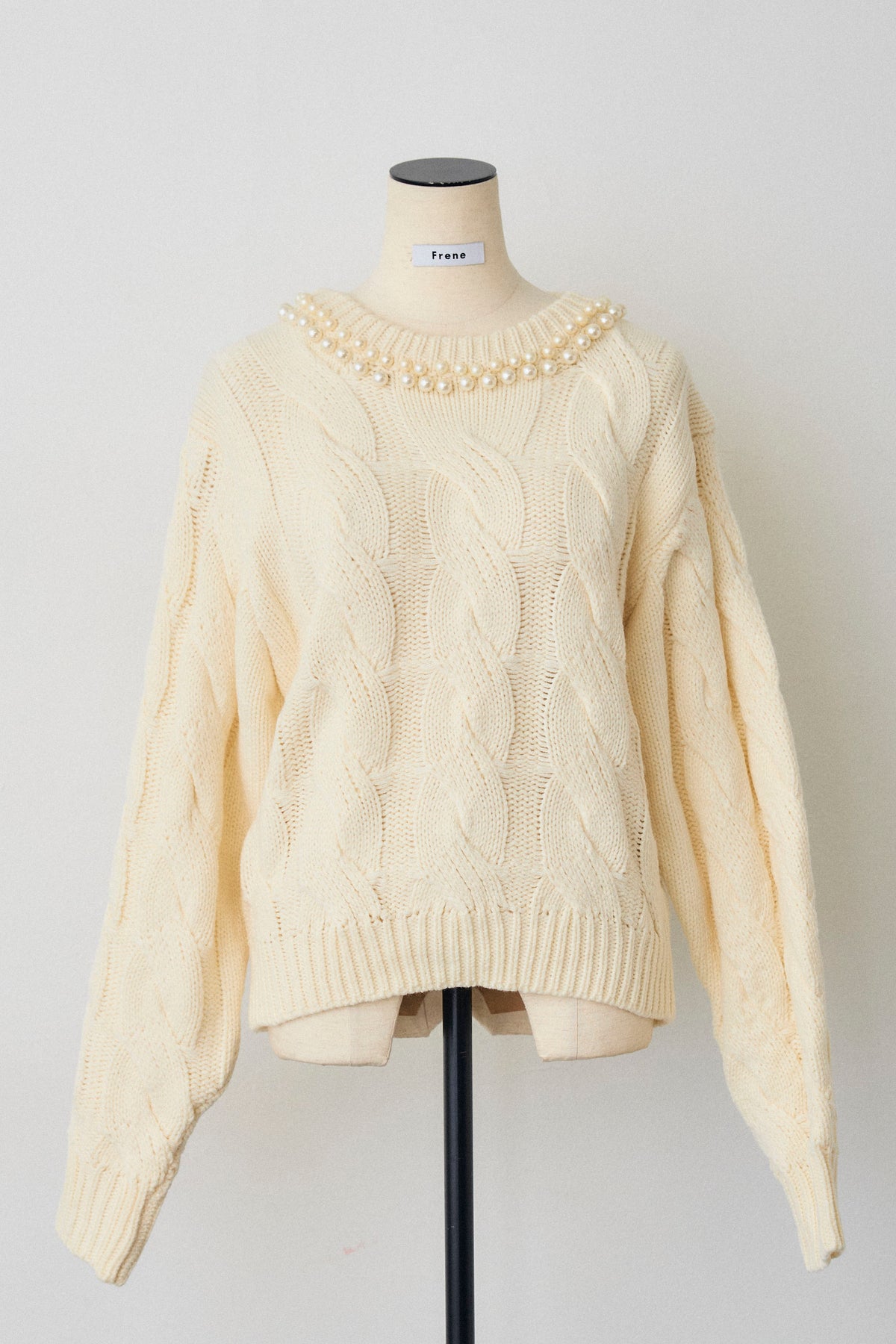 首元のパールがアクセントのケーブル編みニット。立体的なループが、シンプルなコーデでも自然な存在感をつくります。厚みのある編み地であたたかく、デニムやスカートともバランス良くまとまる一枚。甘さのあるディテールをほどよく効かせつつ、着こなしに動きをプラスしてくれるニットです。