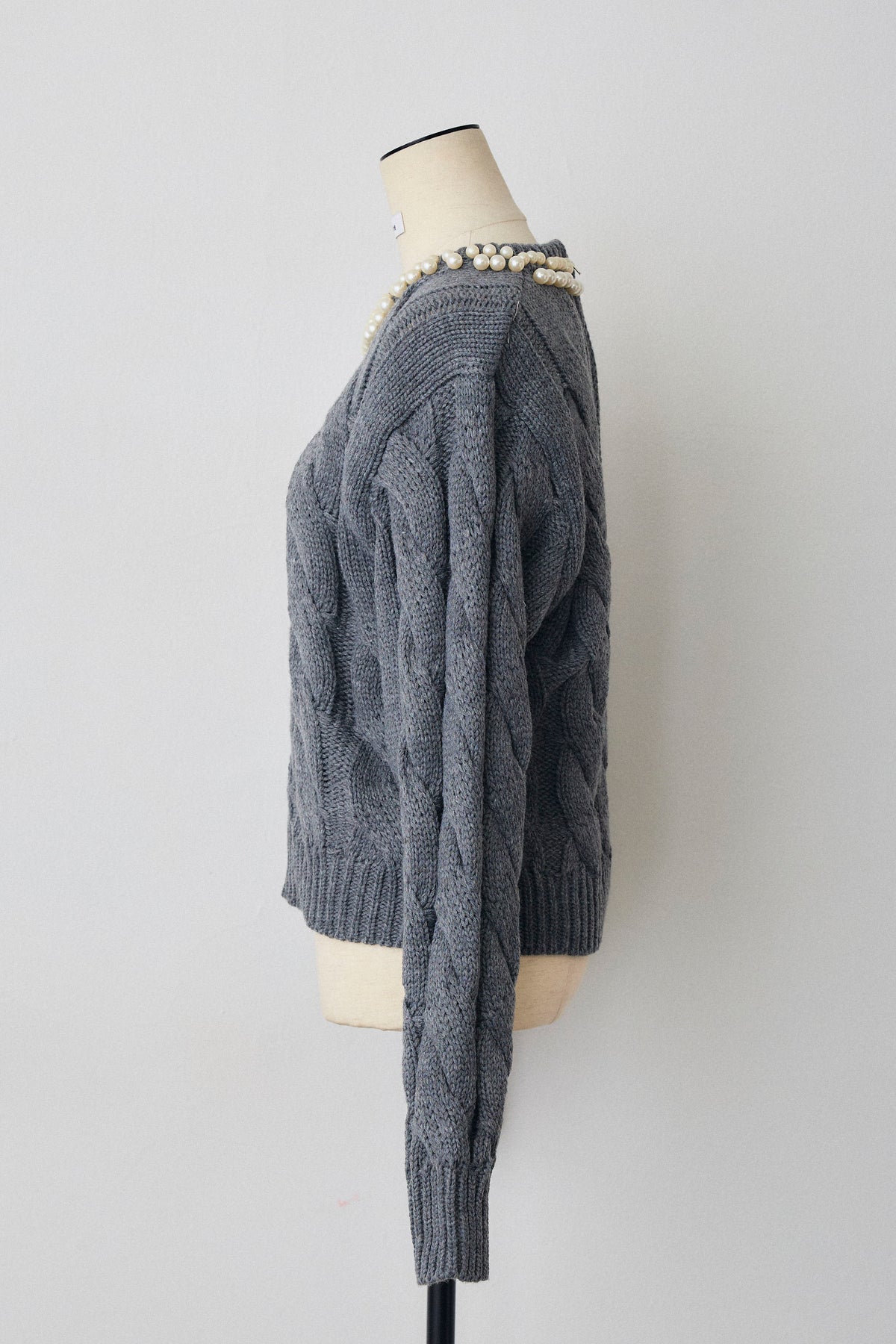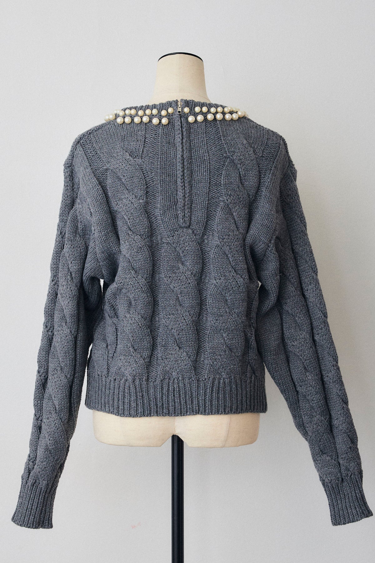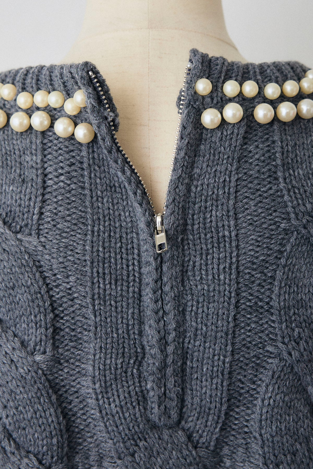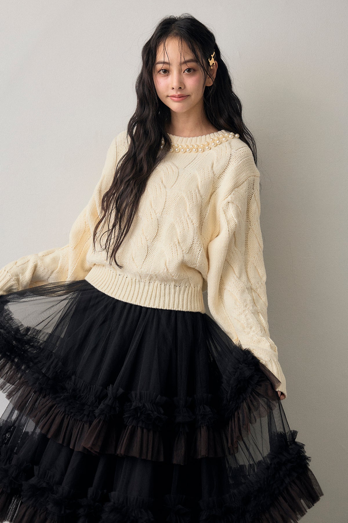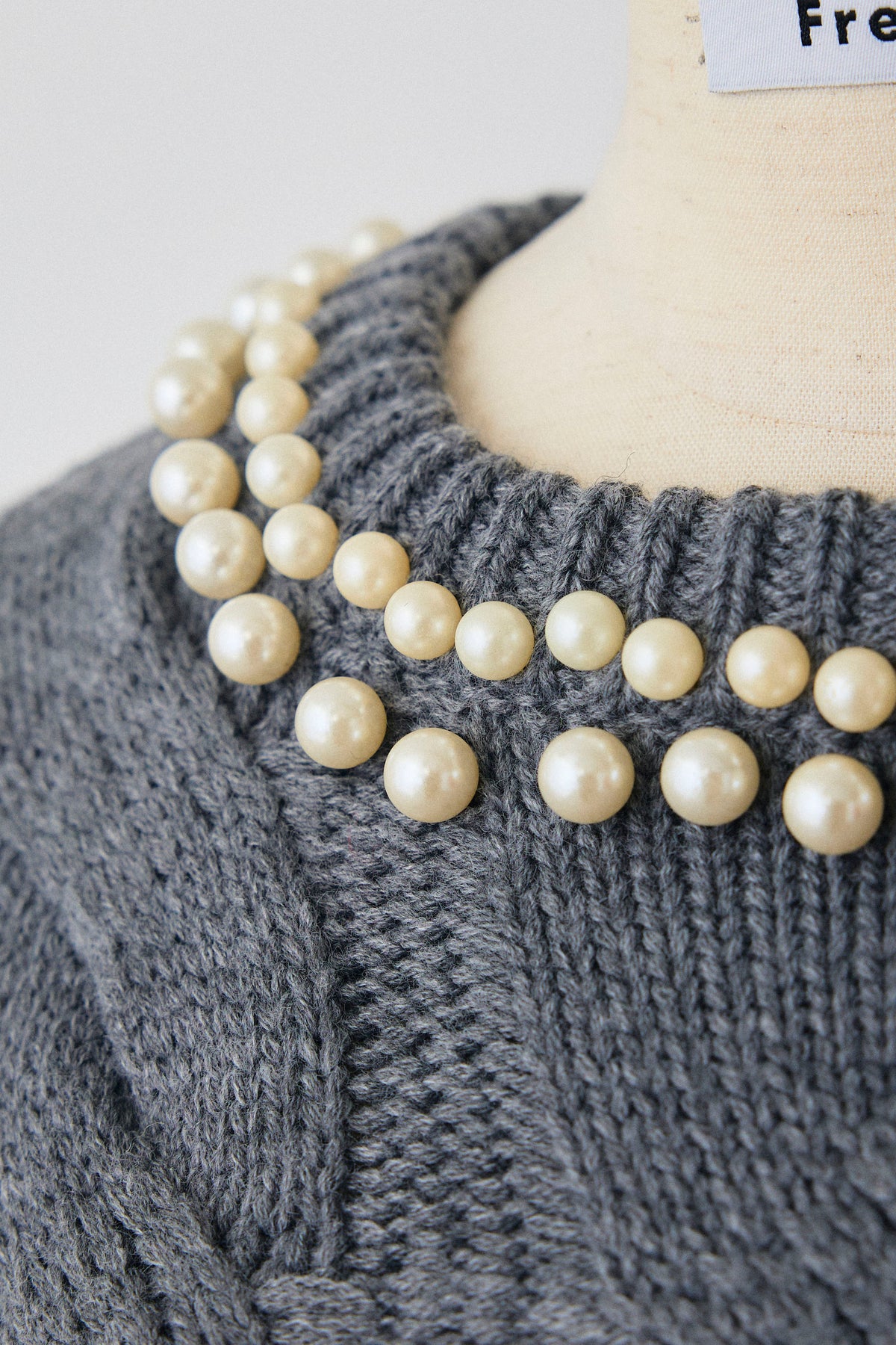 首元のパールがアクセントのケーブル編みニット。立体的なループが、シンプルなコーデでも自然な存在感をつくります。厚みのある編み地であたたかく、デニムやスカートともバランス良くまとまる一枚。甘さのあるディテールをほどよく効かせつつ、着こなしに動きをプラスしてくれるニットです。