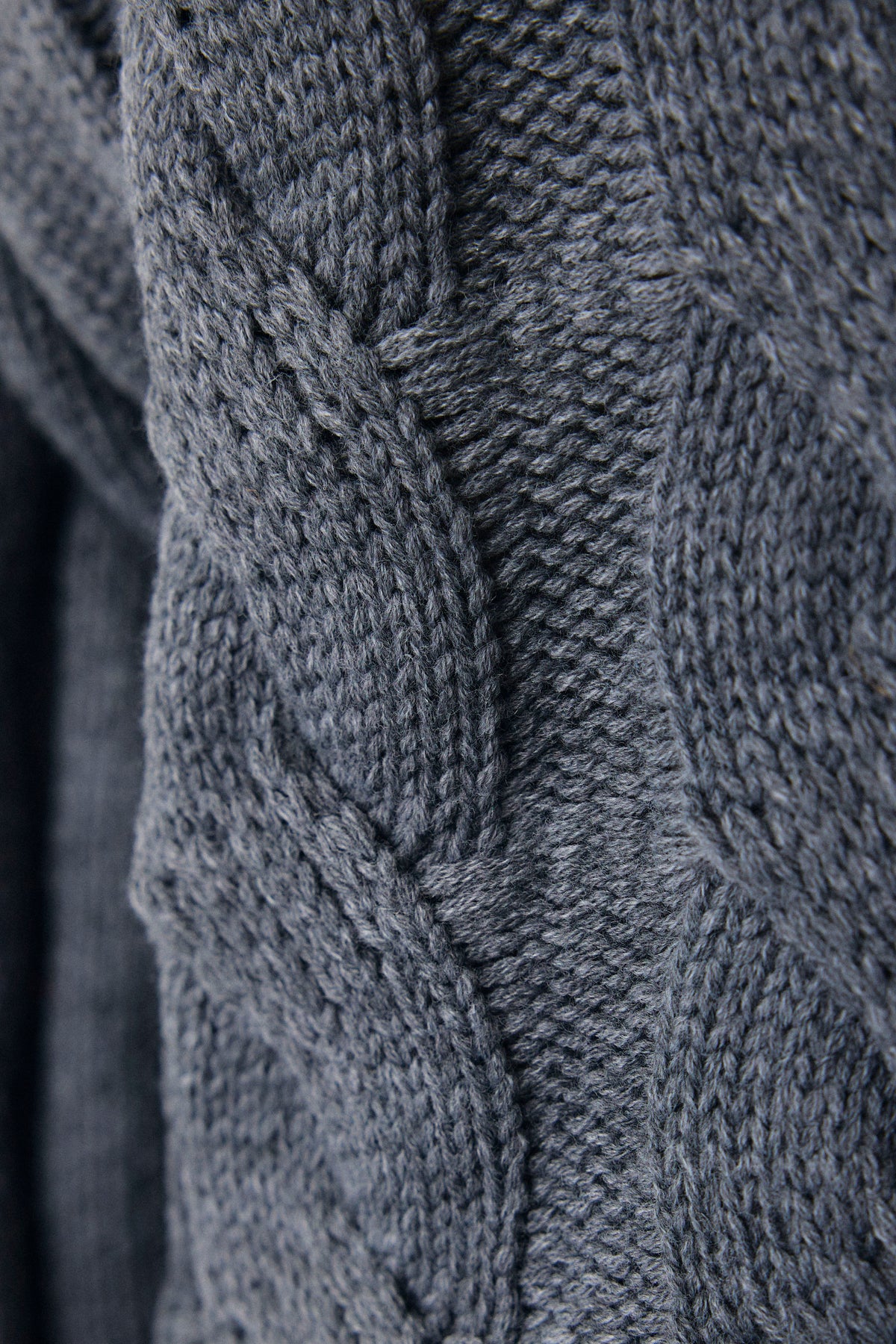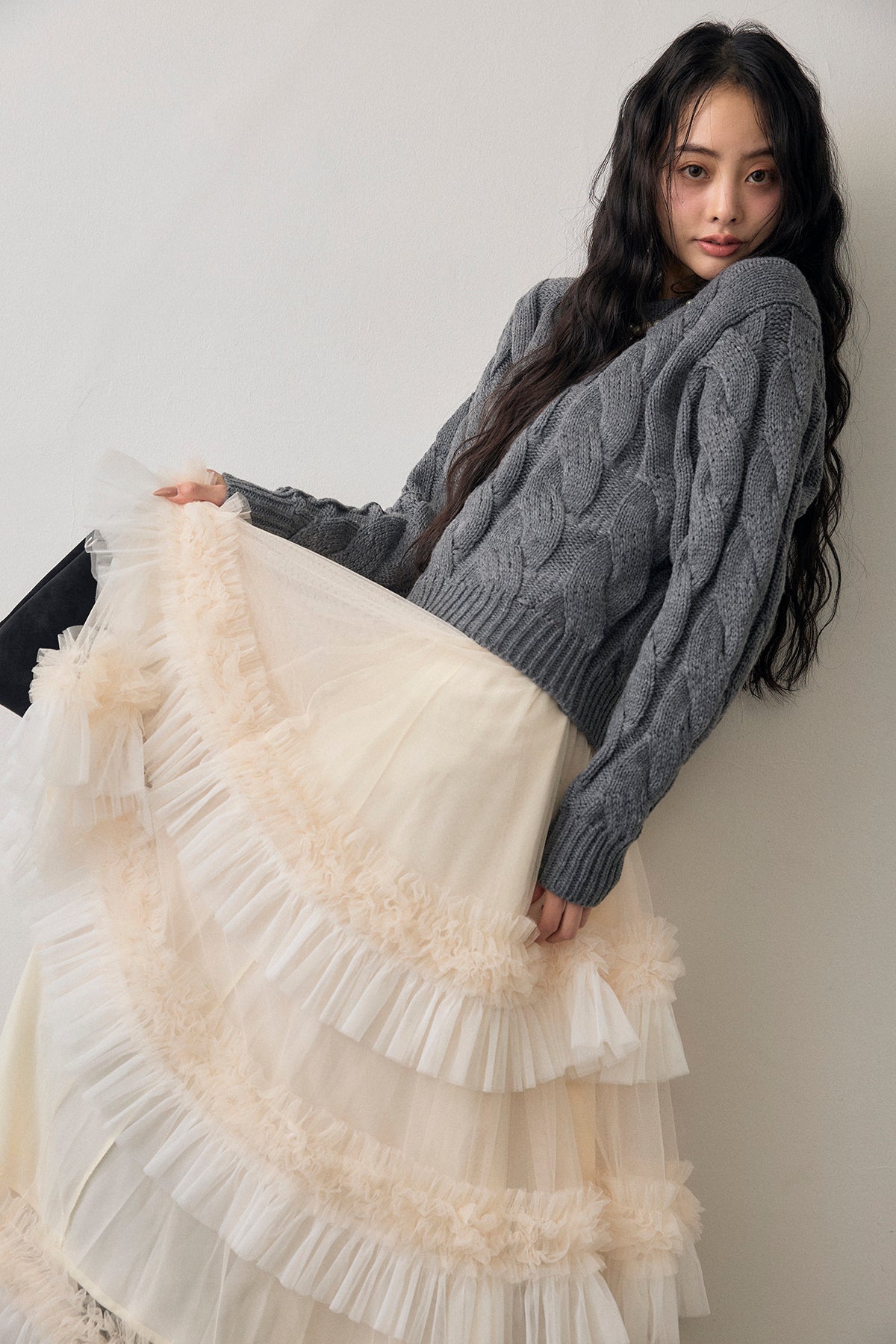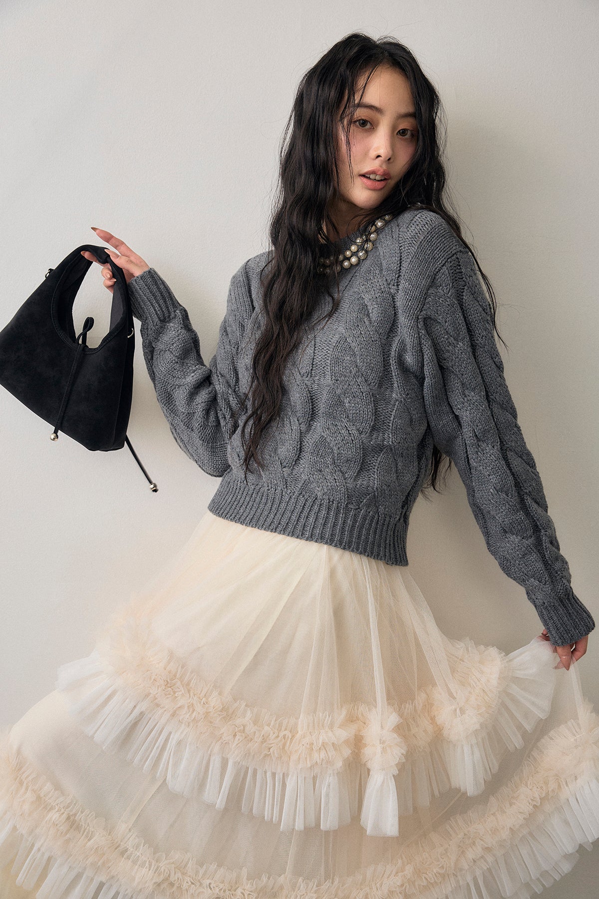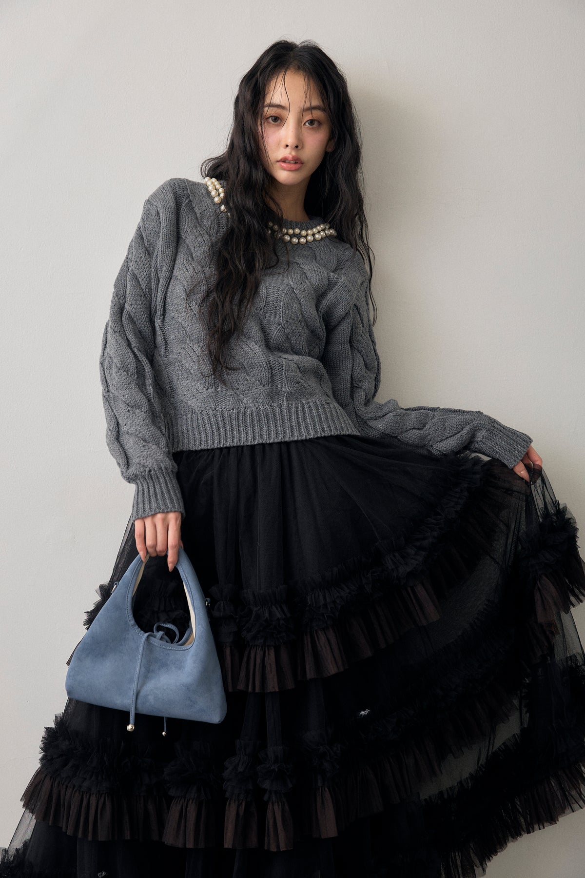 首元のパールがアクセントのケーブル編みニット。立体的なループが、シンプルなコーデでも自然な存在感をつくります。厚みのある編み地であたたかく、デニムやスカートともバランス良くまとまる一枚。甘さのあるディテールをほどよく効かせつつ、着こなしに動きをプラスしてくれるニットです。