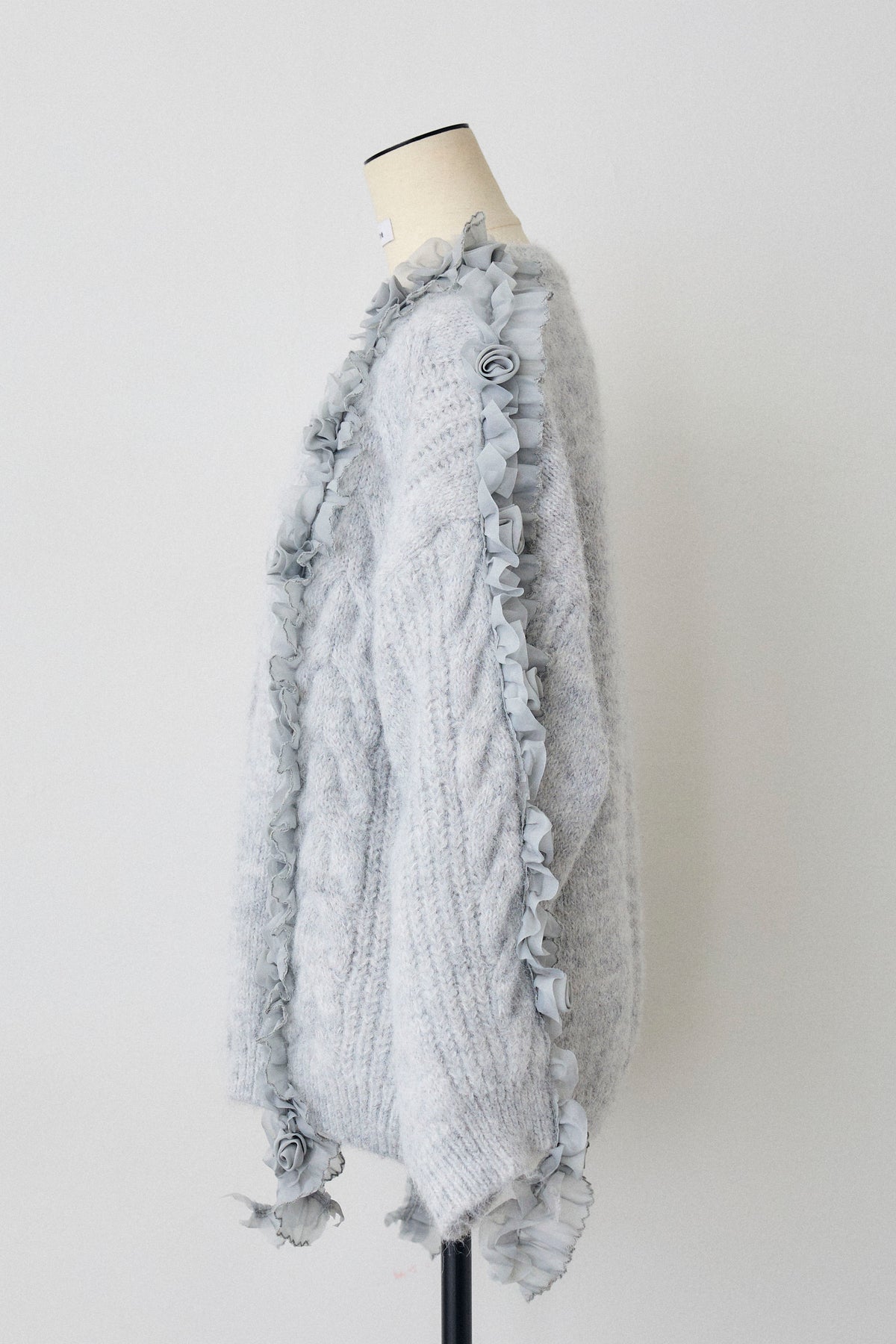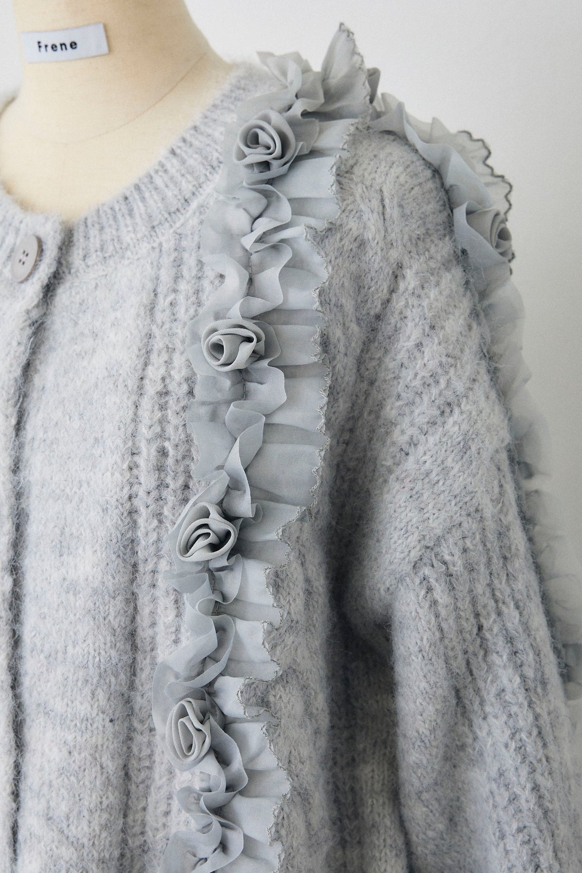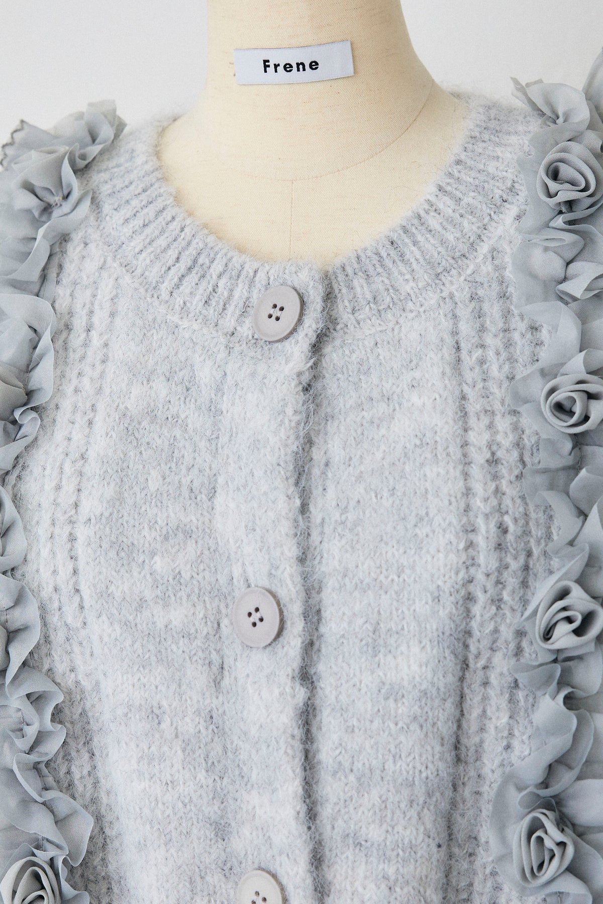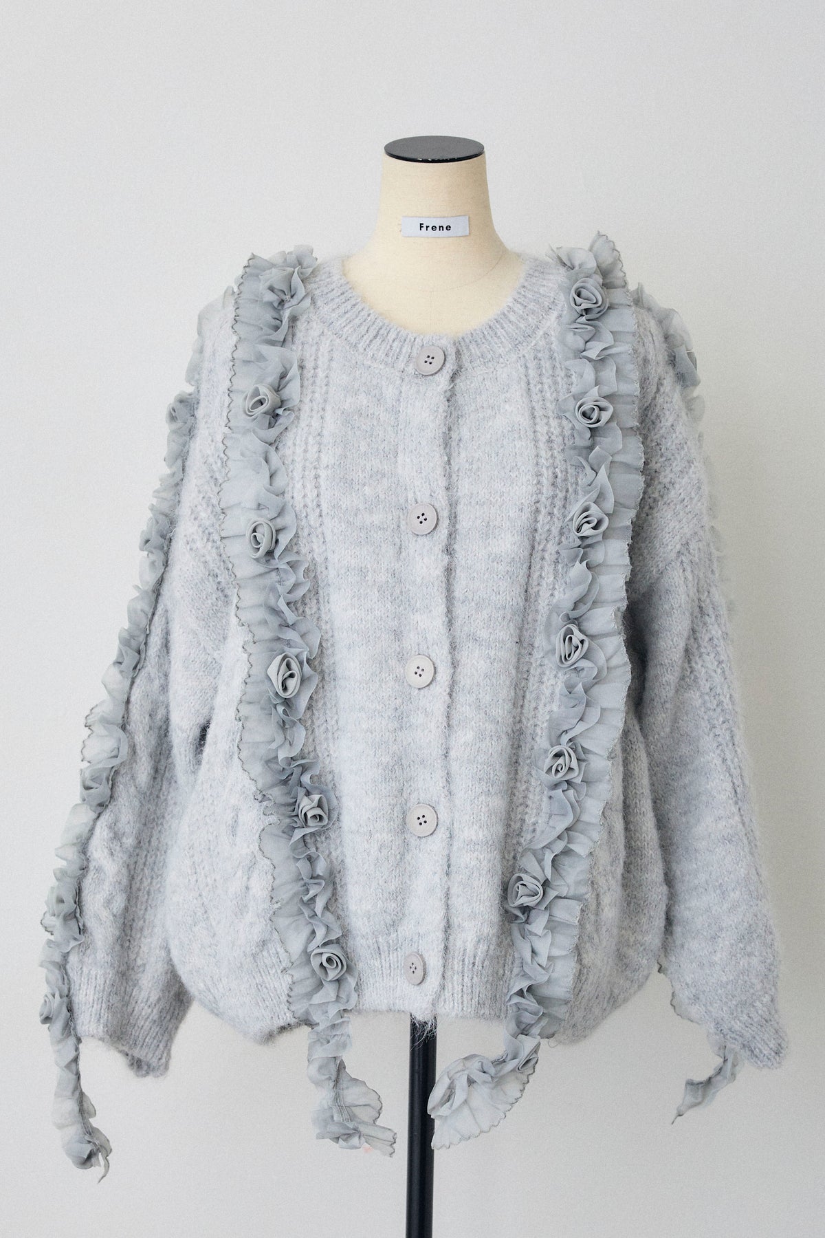 立体フリルとローズモチーフをドッキングしたニットカーデ。やわらかな編み地に、揺れ感のあるディテールが重なり、甘さと存在感が同居します。シンプルなボトムでもコーデが決まりやすく、羽織るだけで動きのある印象に。ニットの温かさをキープしつつ、装いに奥行きをつくる一枚です。