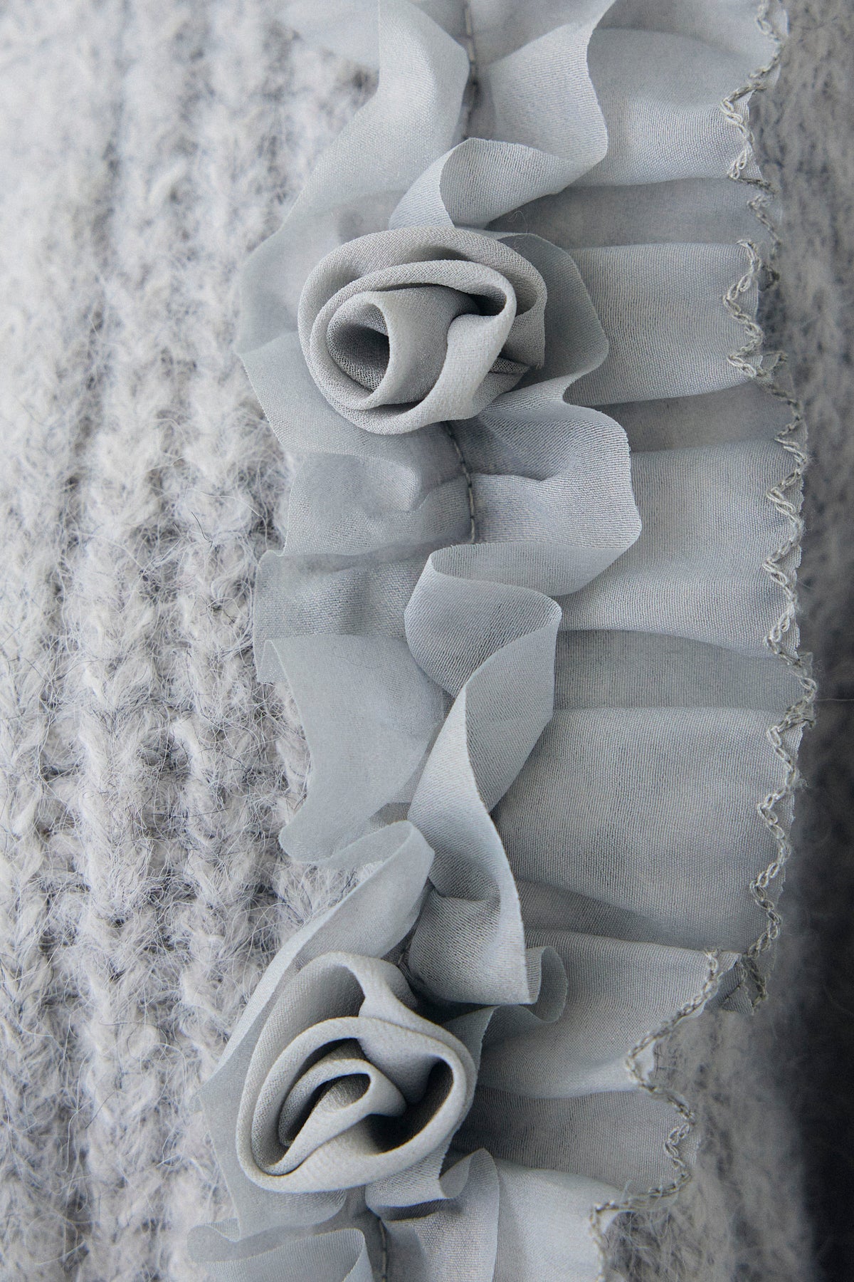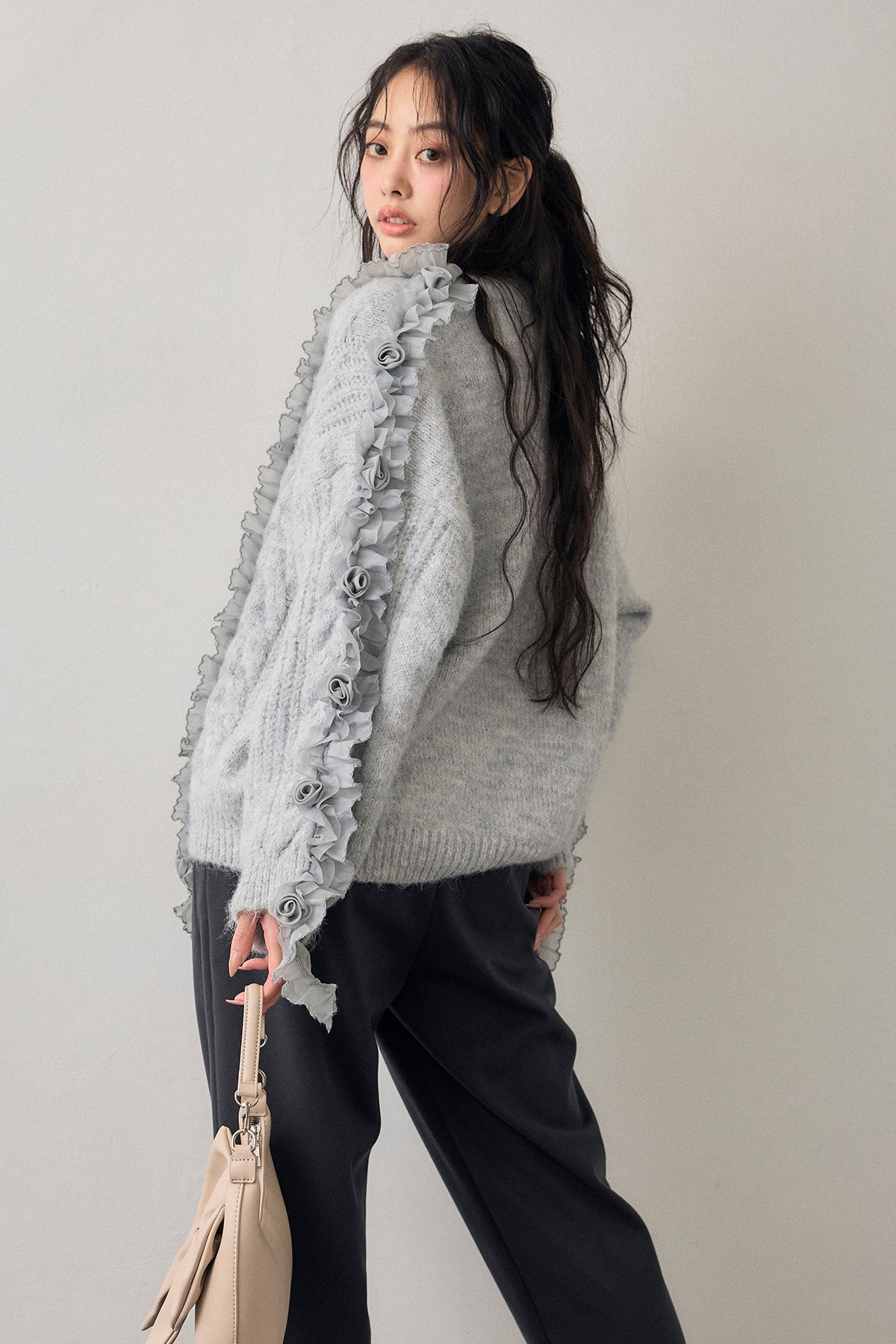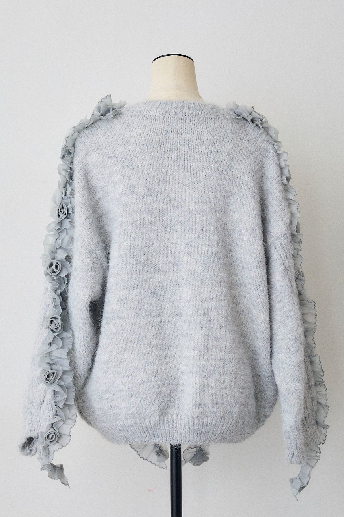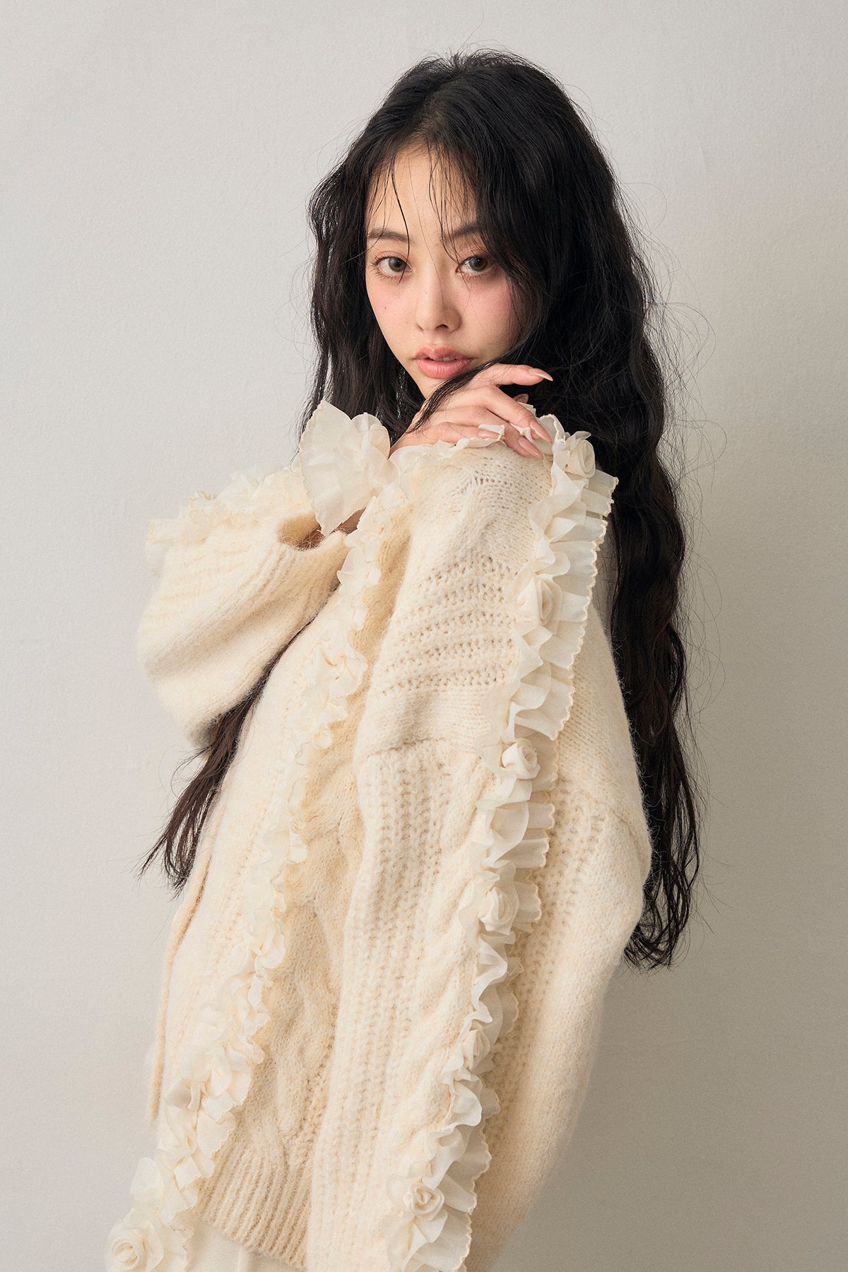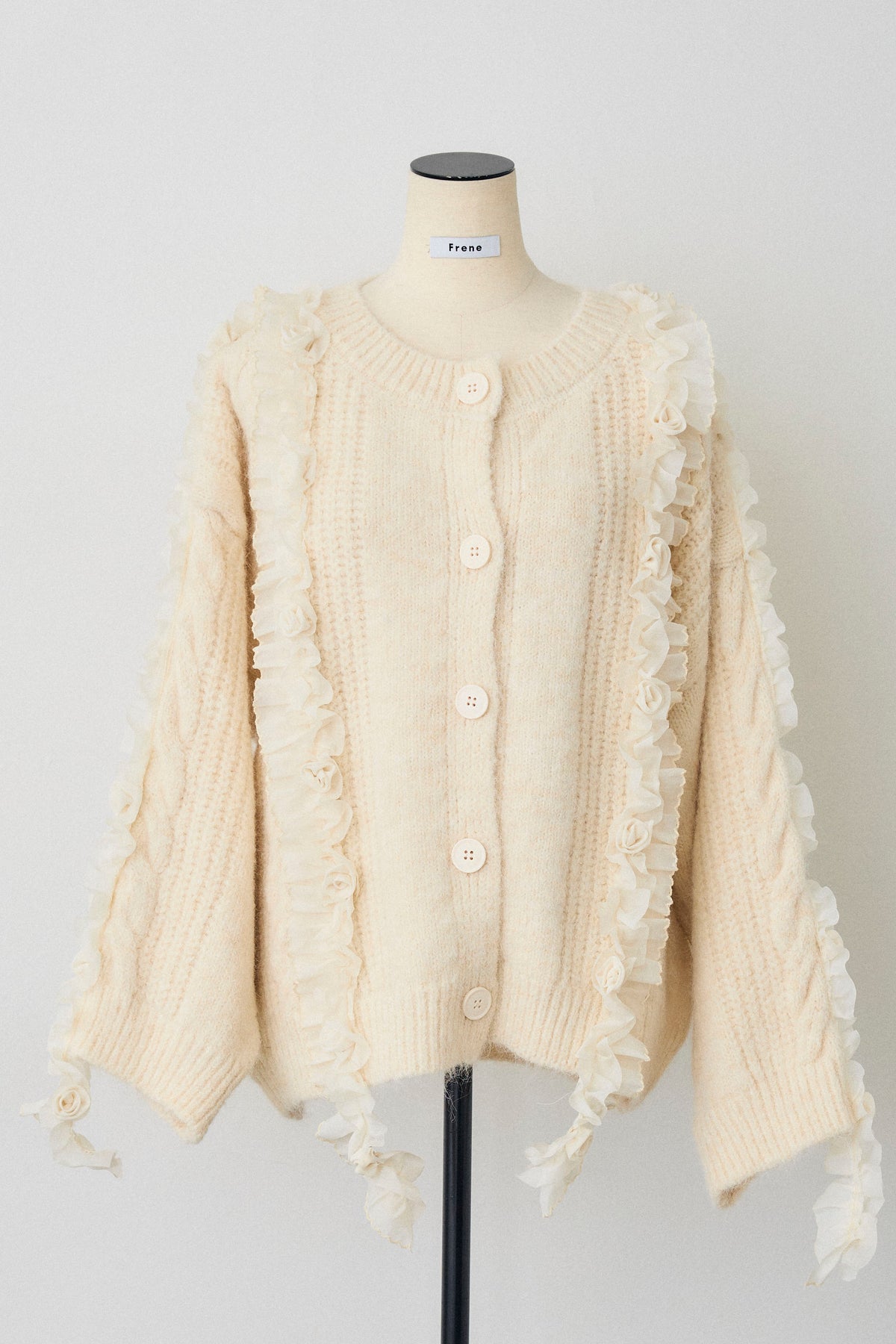 立体フリルとローズモチーフをドッキングしたニットカーデ。やわらかな編み地に、揺れ感のあるディテールが重なり、甘さと存在感が同居します。シンプルなボトムでもコーデが決まりやすく、羽織るだけで動きのある印象に。ニットの温かさをキープしつつ、装いに奥行きをつくる一枚です。