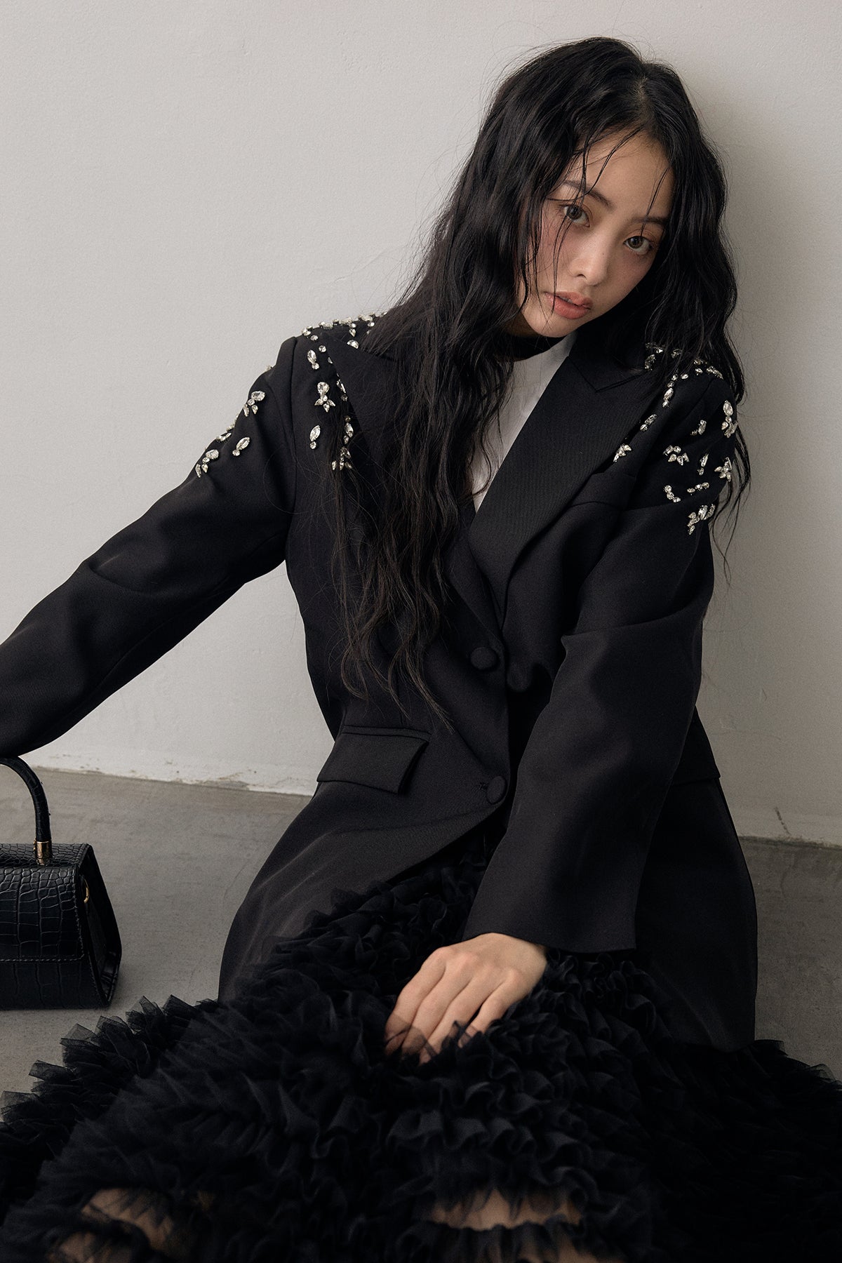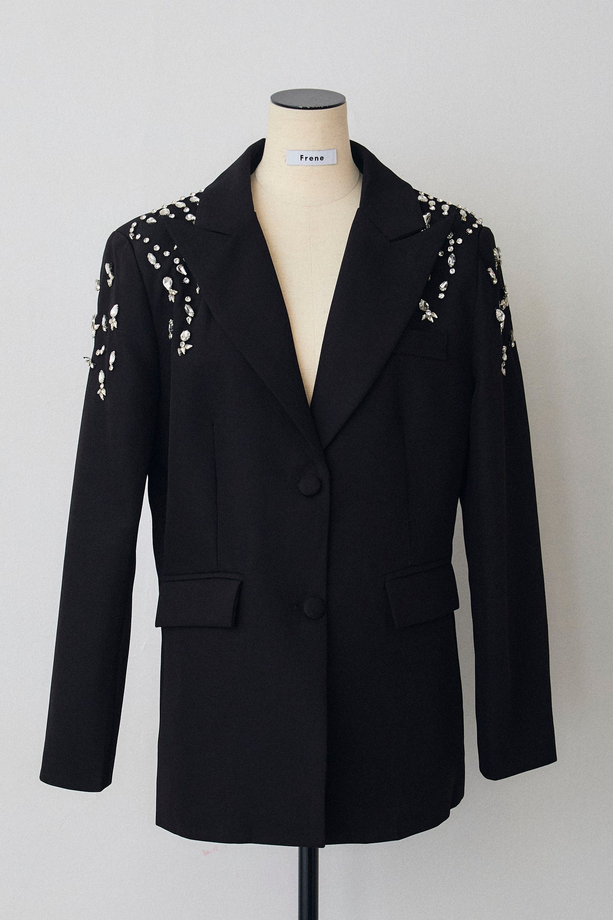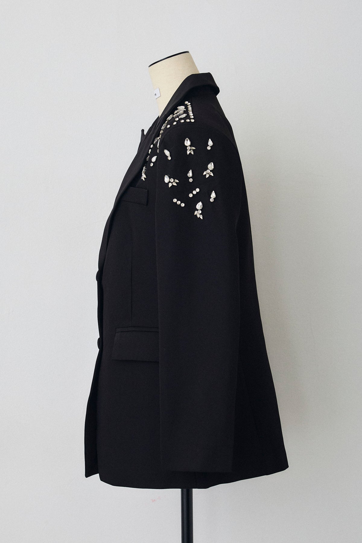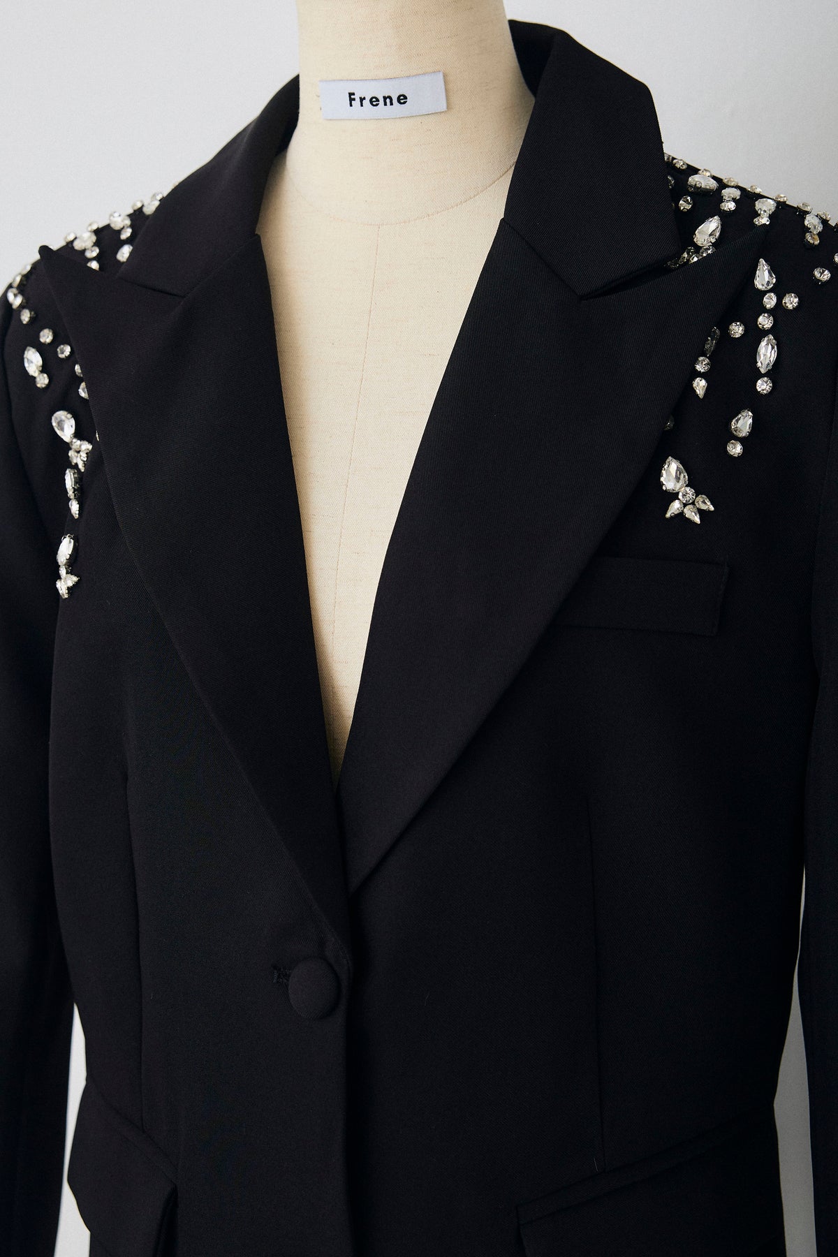 肩まわりを中心に散りばめられたビジューがほどよい華やぎを添えるマニッシュジャケット。端正な テーラードシルエットにより甘さ控えめで、大人の女性が取り入れやすいデザインです。ボトムスを選ばないバランスの良い丈感で、デニムやスラックス、ボリュームスカートやワンピースとのミックスコーデもおすすめ。羽織るだけで着こなしにアクセントをもたらす一枚です。