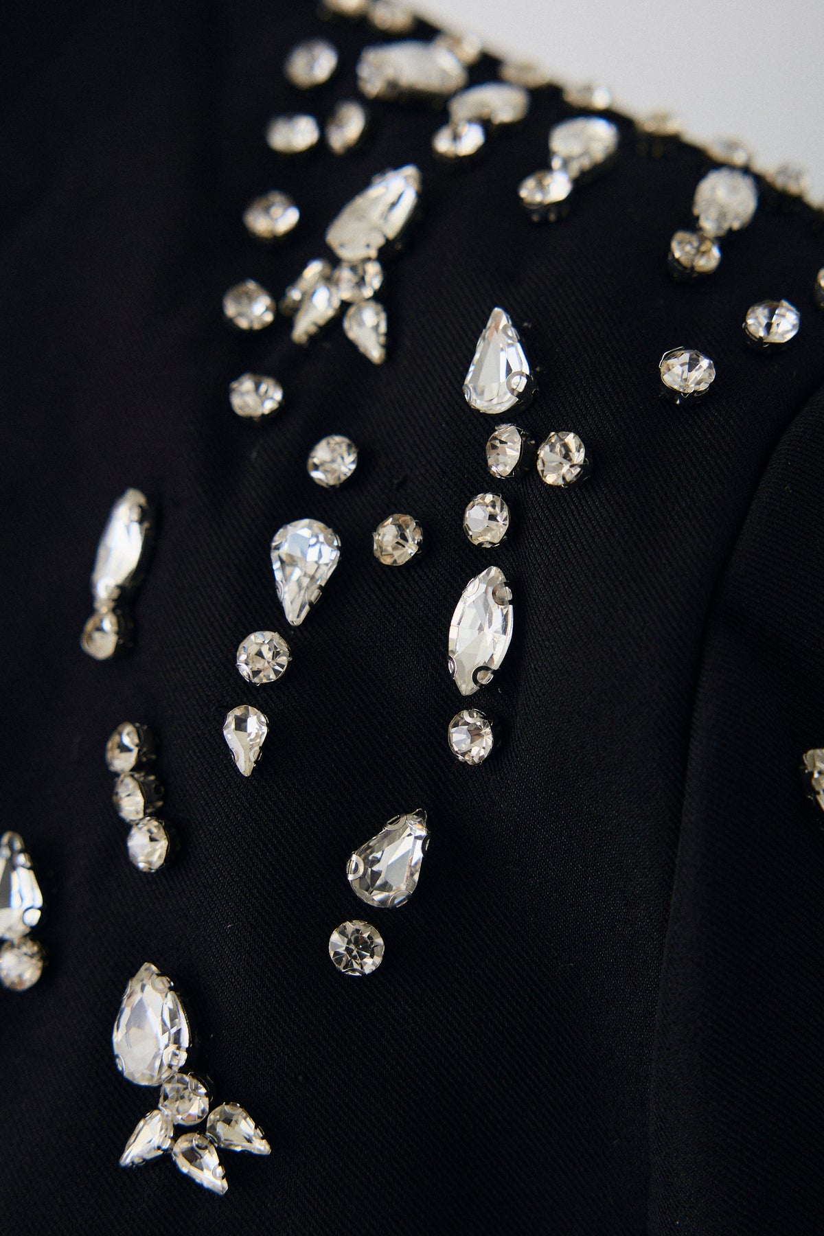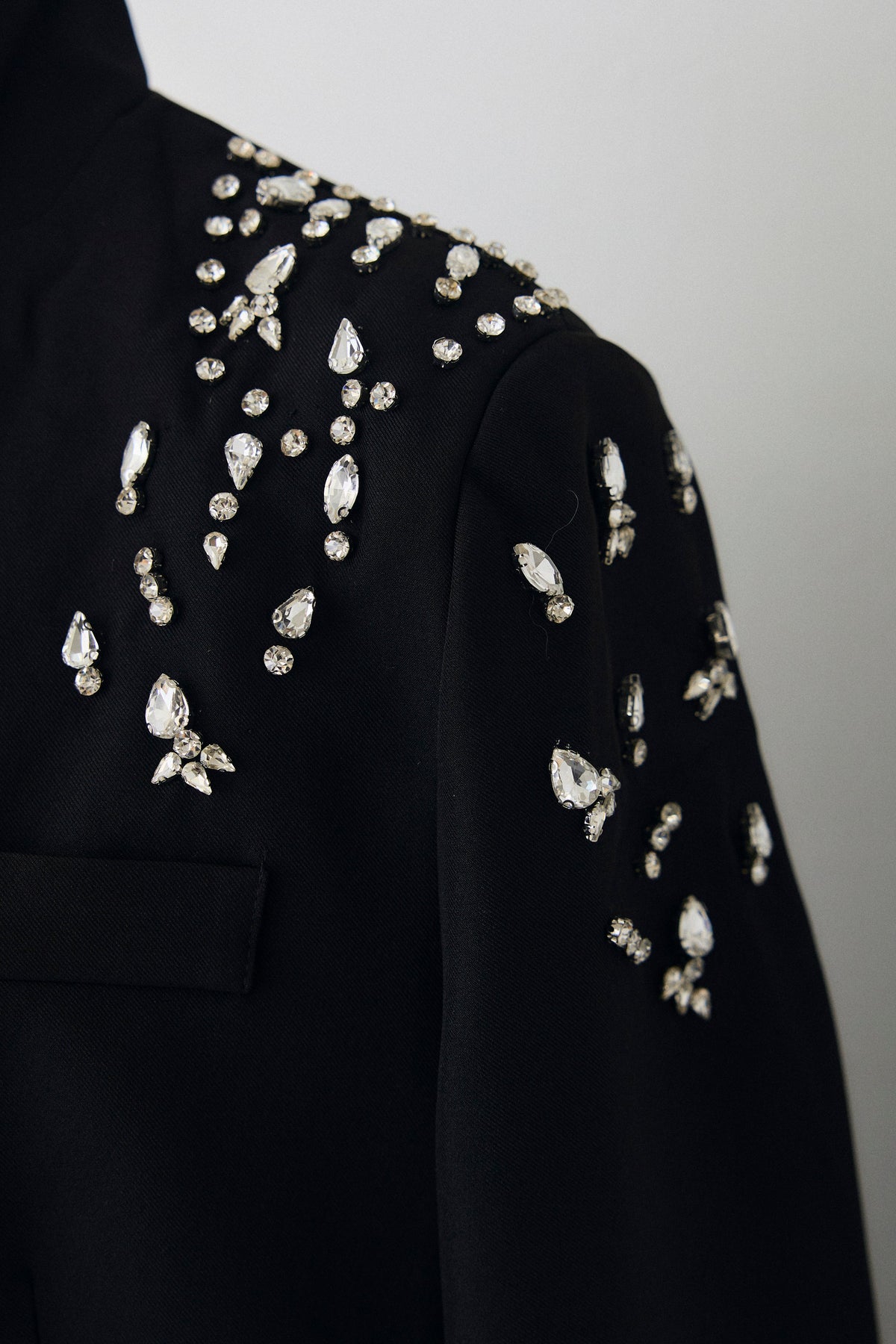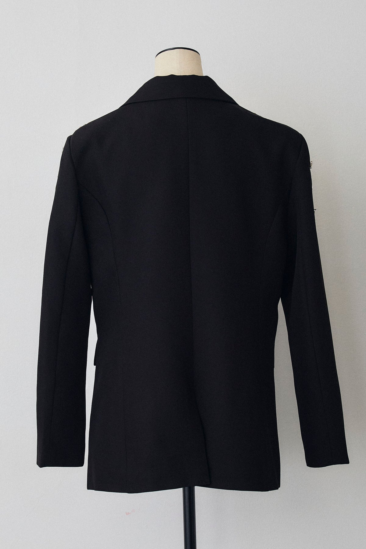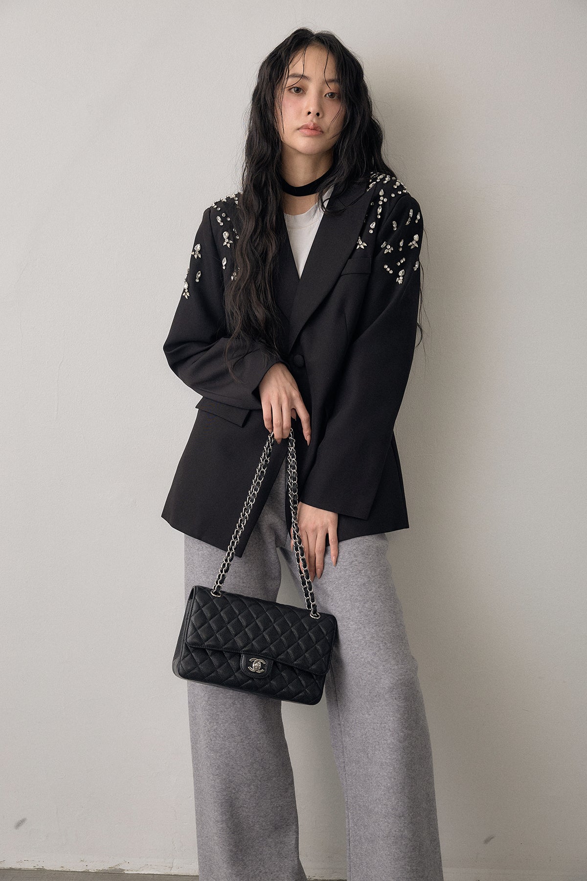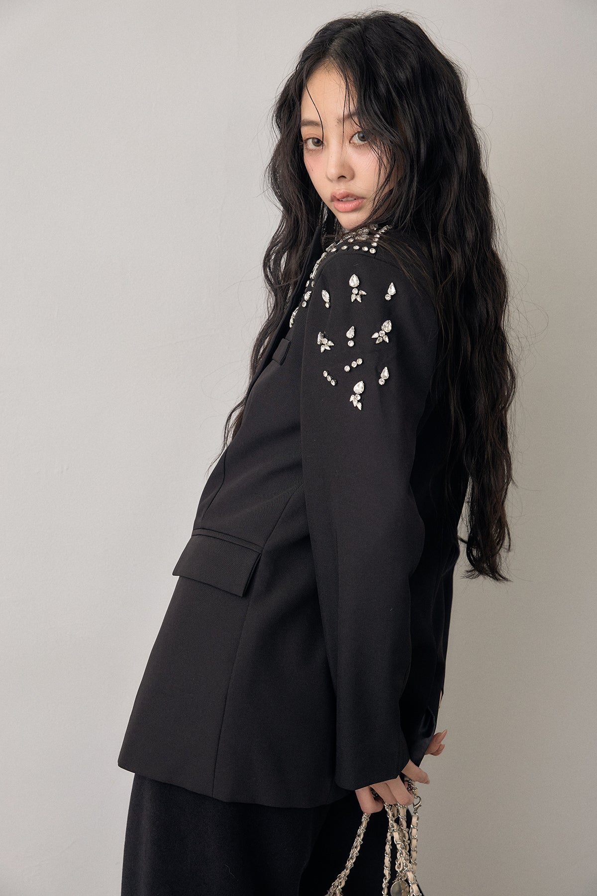 肩まわりを中心に散りばめられたビジューがほどよい華やぎを添えるマニッシュジャケット。端正な テーラードシルエットにより甘さ控えめで、大人の女性が取り入れやすいデザインです。ボトムスを選ばないバランスの良い丈感で、デニムやスラックス、ボリュームスカートやワンピースとのミックスコーデもおすすめ。羽織るだけで着こなしにアクセントをもたらす一枚です。