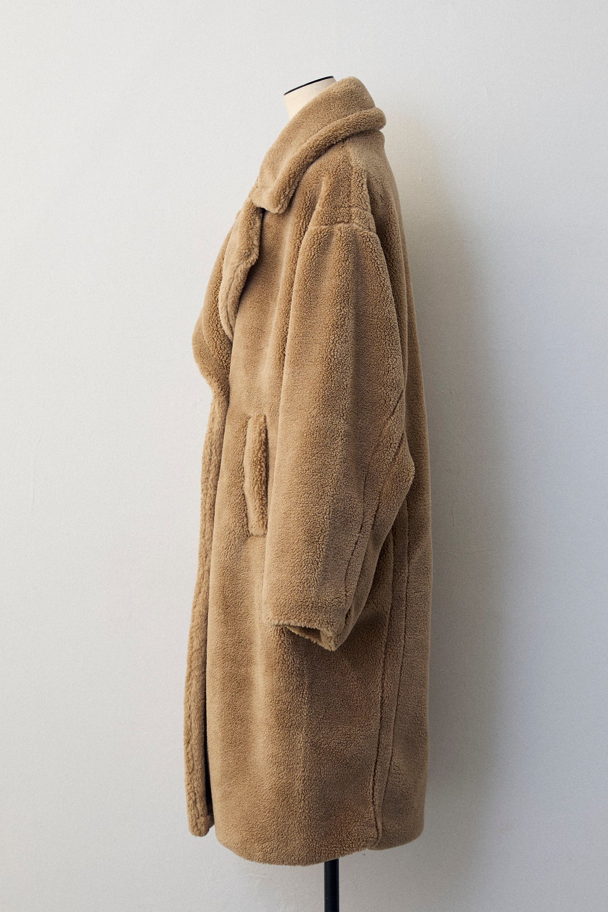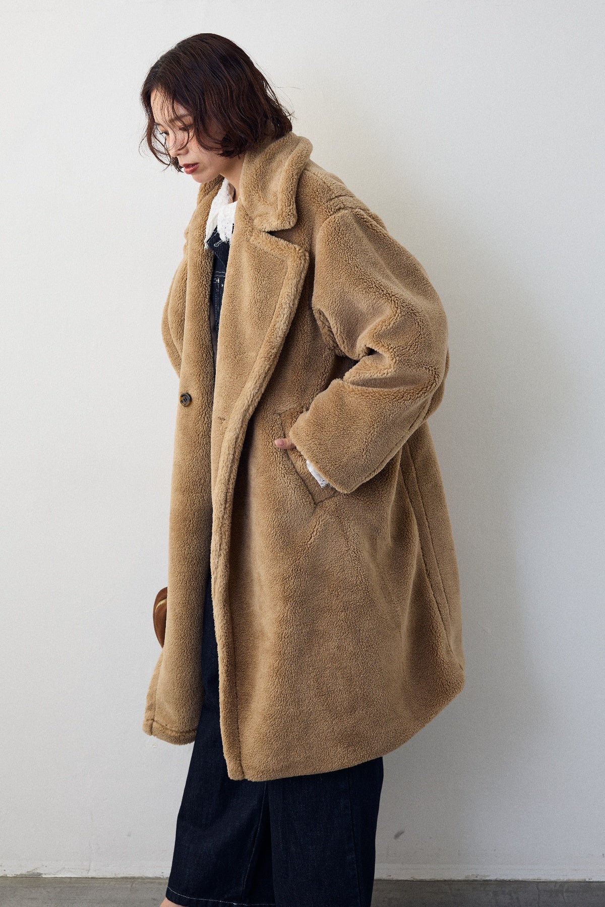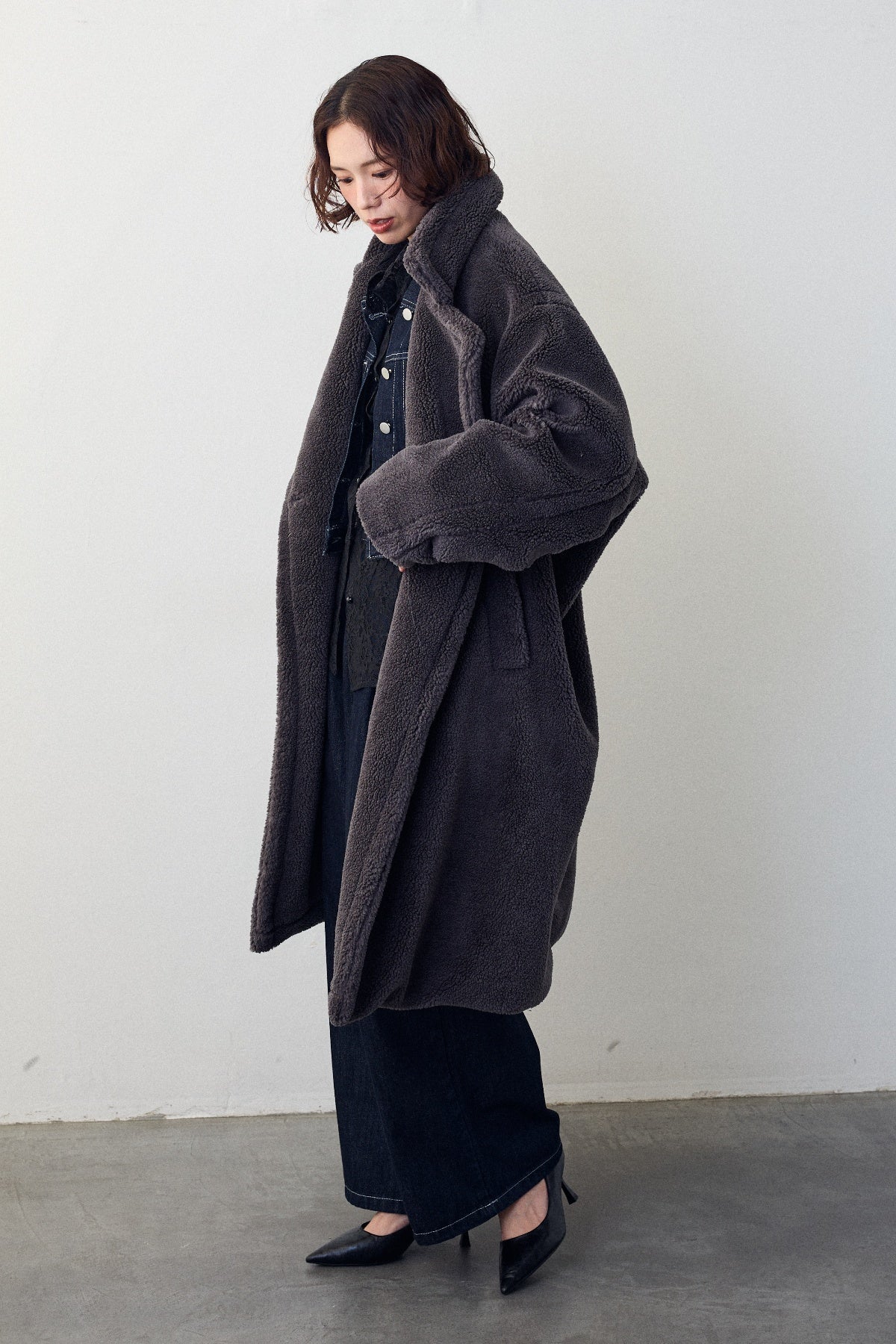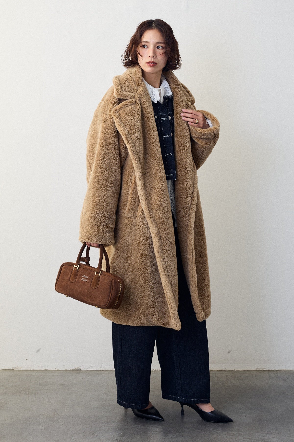 ふんわりとした質感が魅力のテディボアを贅沢に使ったロングコート。包まれるような柔らかさがありながら、落ち感のあるシルエットで大人らしく着こなせる一枚です。大きめの襟が顔まわりにニュアンスをつくり、羽織るだけで季節感のあるスタイルに。デニムにもきれいめパンツにも合わせやすく、デイリーからお出かけまで幅広く活躍します。ゆったりとしたフォルムながら、重たく見えないバランスに仕上げたロングコートです。