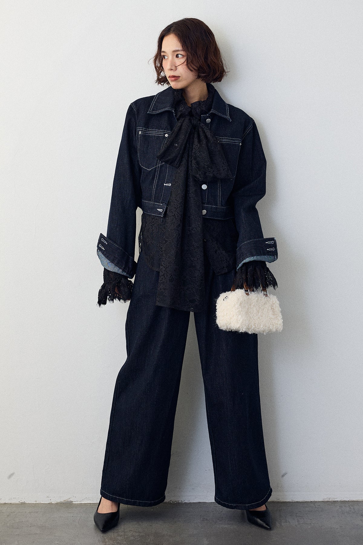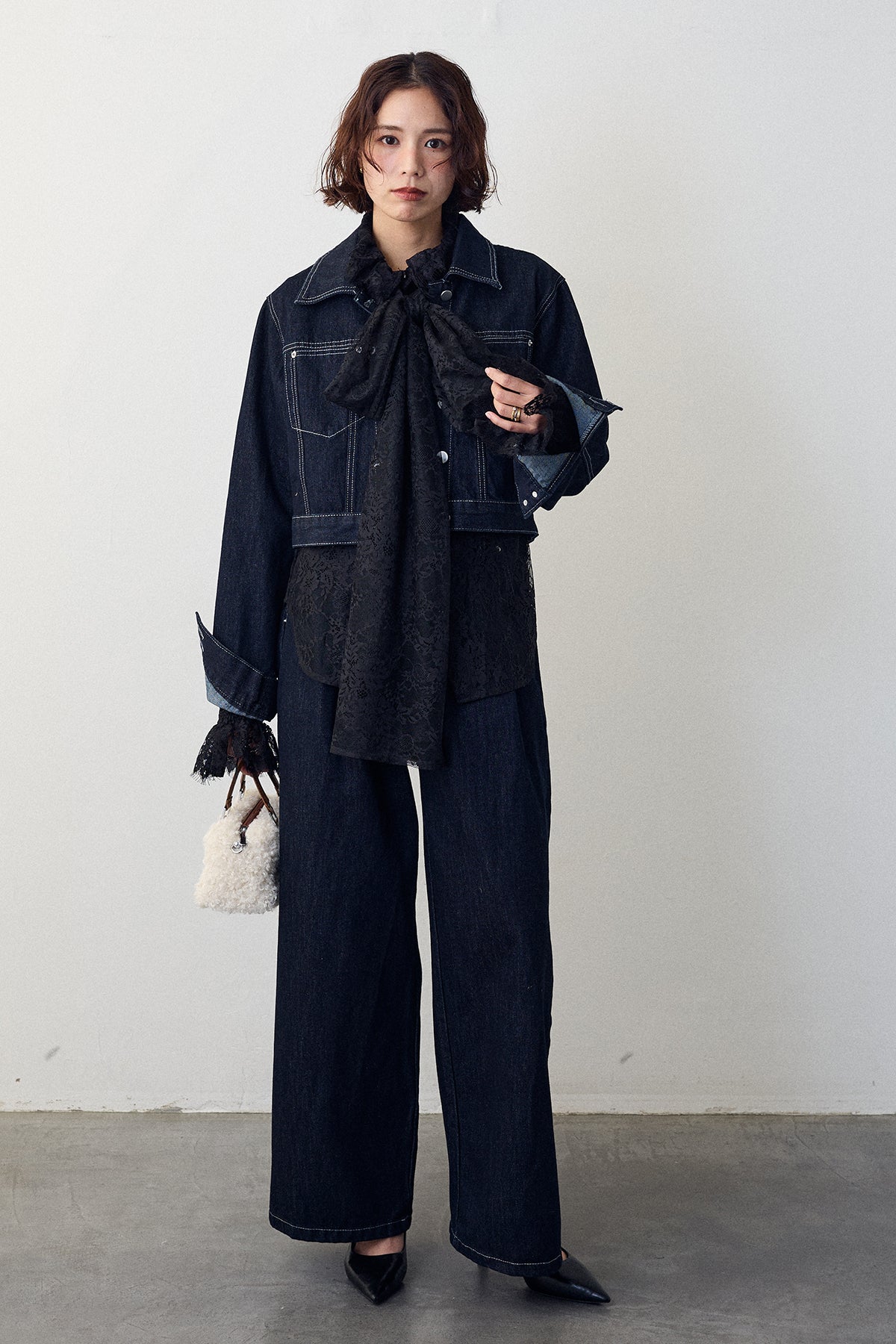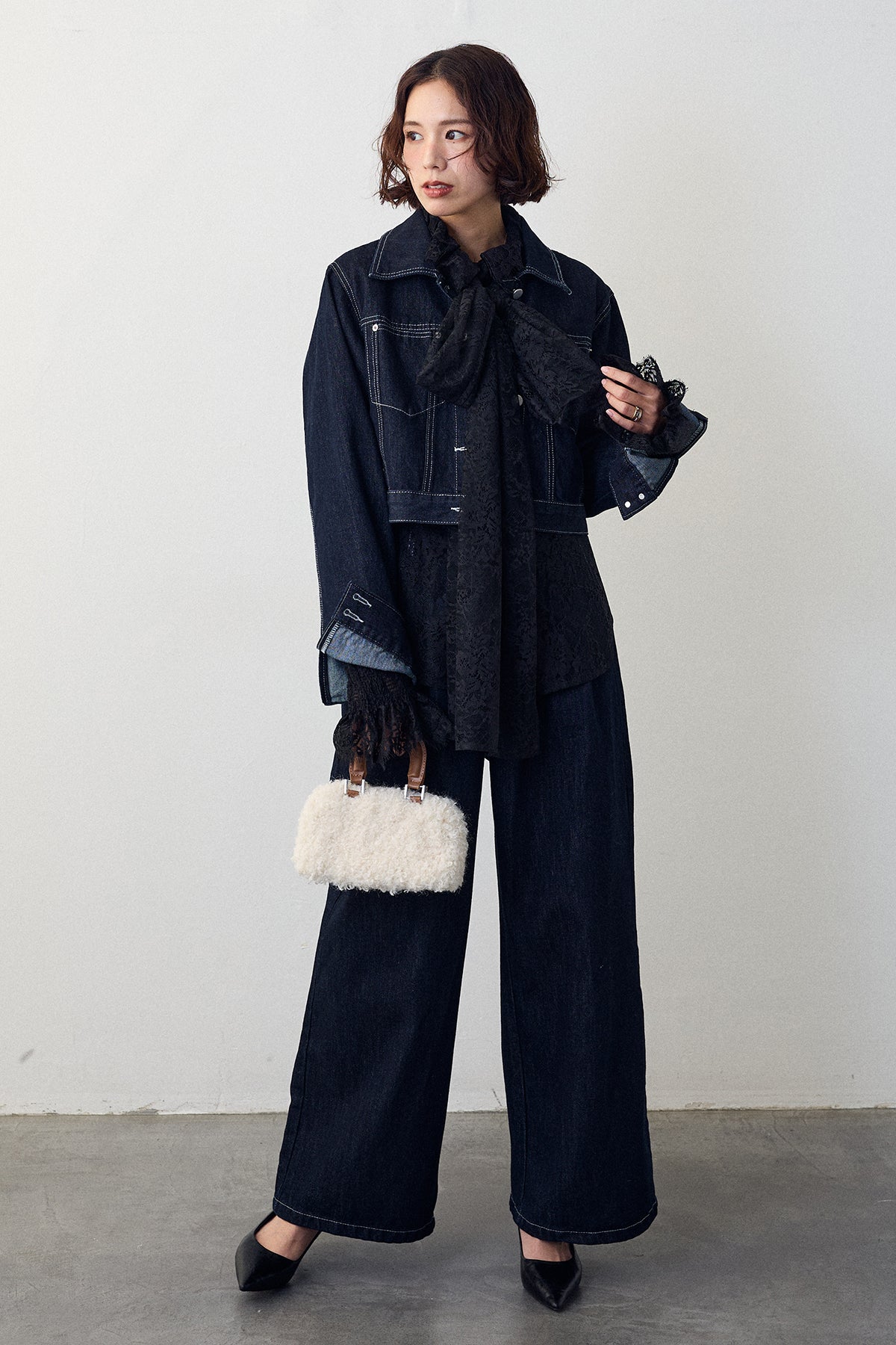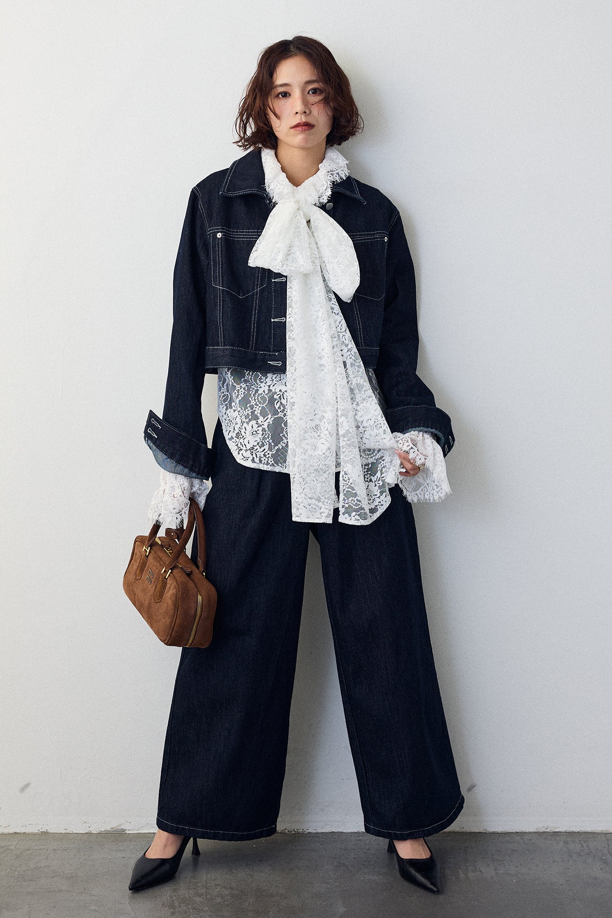 クラシックなデニムにモードなエッセンスを加えたクロップドデニムセットアップ。ショート丈のジャケットは、ステッチがアクセントとなり、レースブラウスのようなフェミニンなインナーとも好相性。ボトムはゆったりとしたワイドシルエットで動きやすく、ウエストのバックゴムで心地よくフィットします。セットで着れば統一感のあるスタイルに、単体使いでも幅広いコーディネートに活躍し、カジュアルながら洗練された印象を楽しめる一着です。
