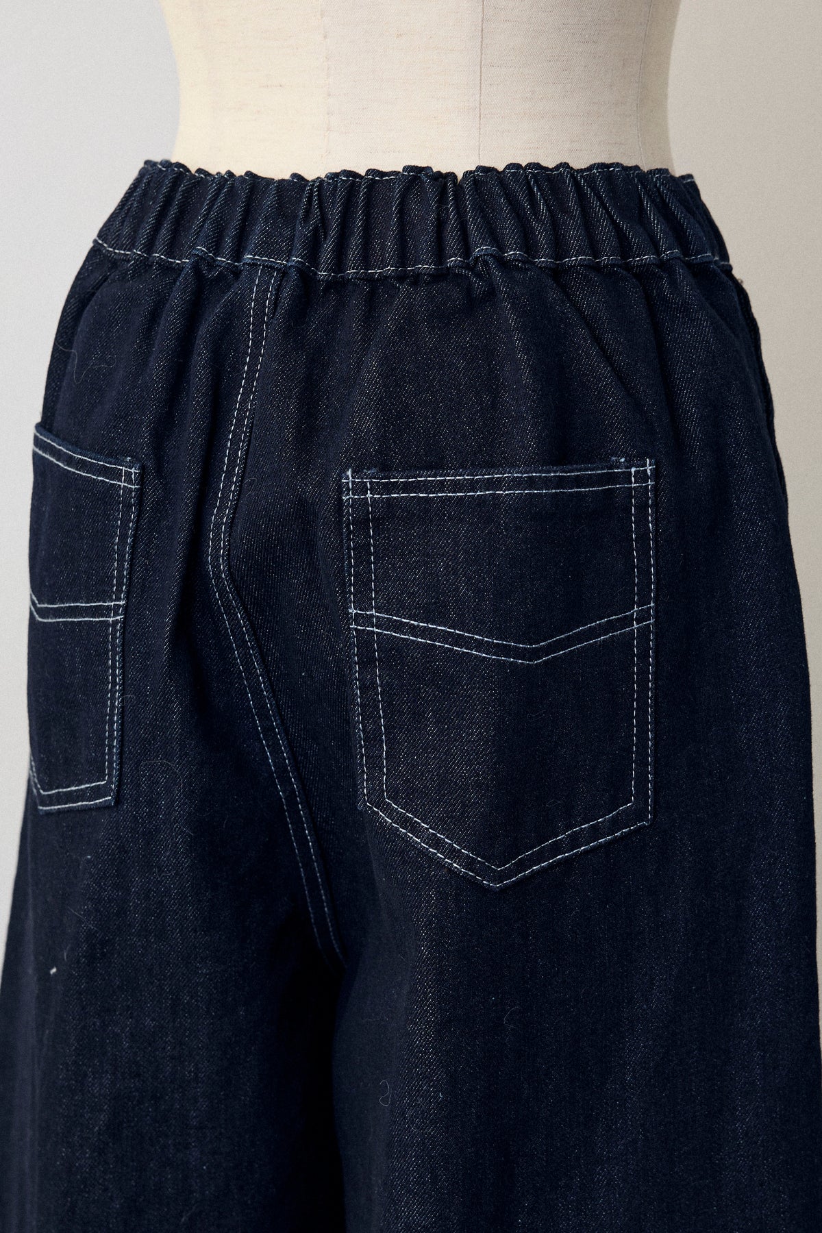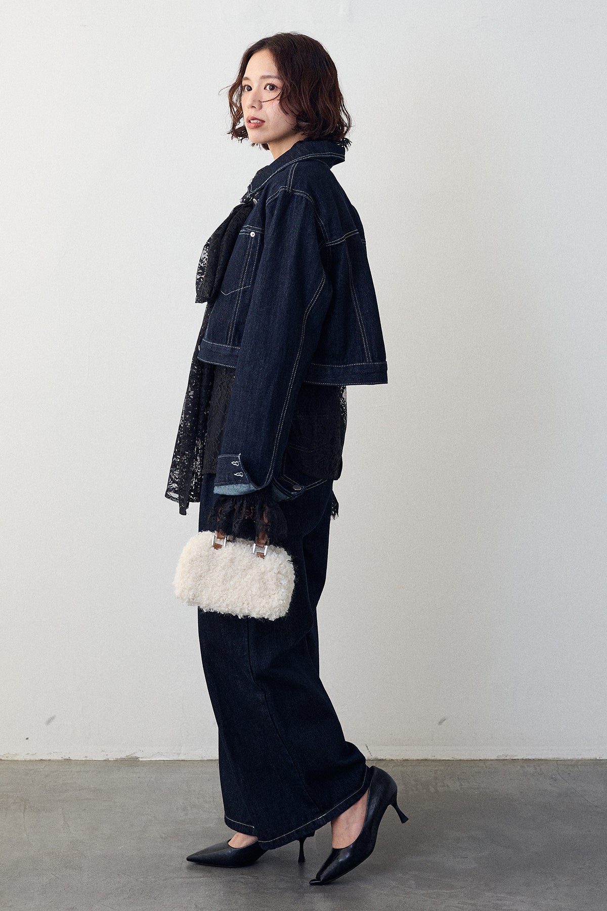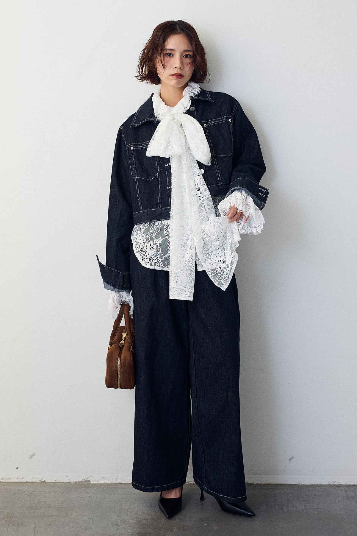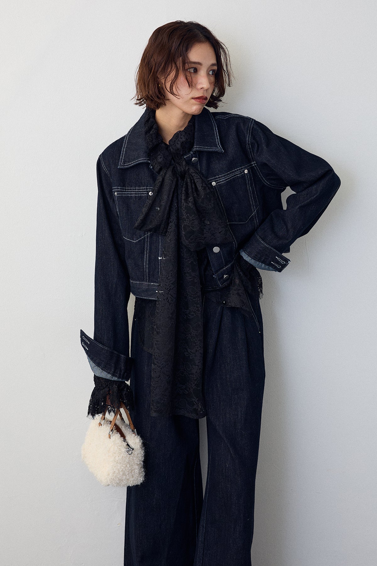 クラシックなデニムにモードなエッセンスを加えたクロップドデニムセットアップ。ショート丈のジャケットは、ステッチがアクセントとなり、レースブラウスのようなフェミニンなインナーとも好相性。ボトムはゆったりとしたワイドシルエットで動きやすく、ウエストのバックゴムで心地よくフィットします。セットで着れば統一感のあるスタイルに、単体使いでも幅広いコーディネートに活躍し、カジュアルながら洗練された印象を楽しめる一着です。