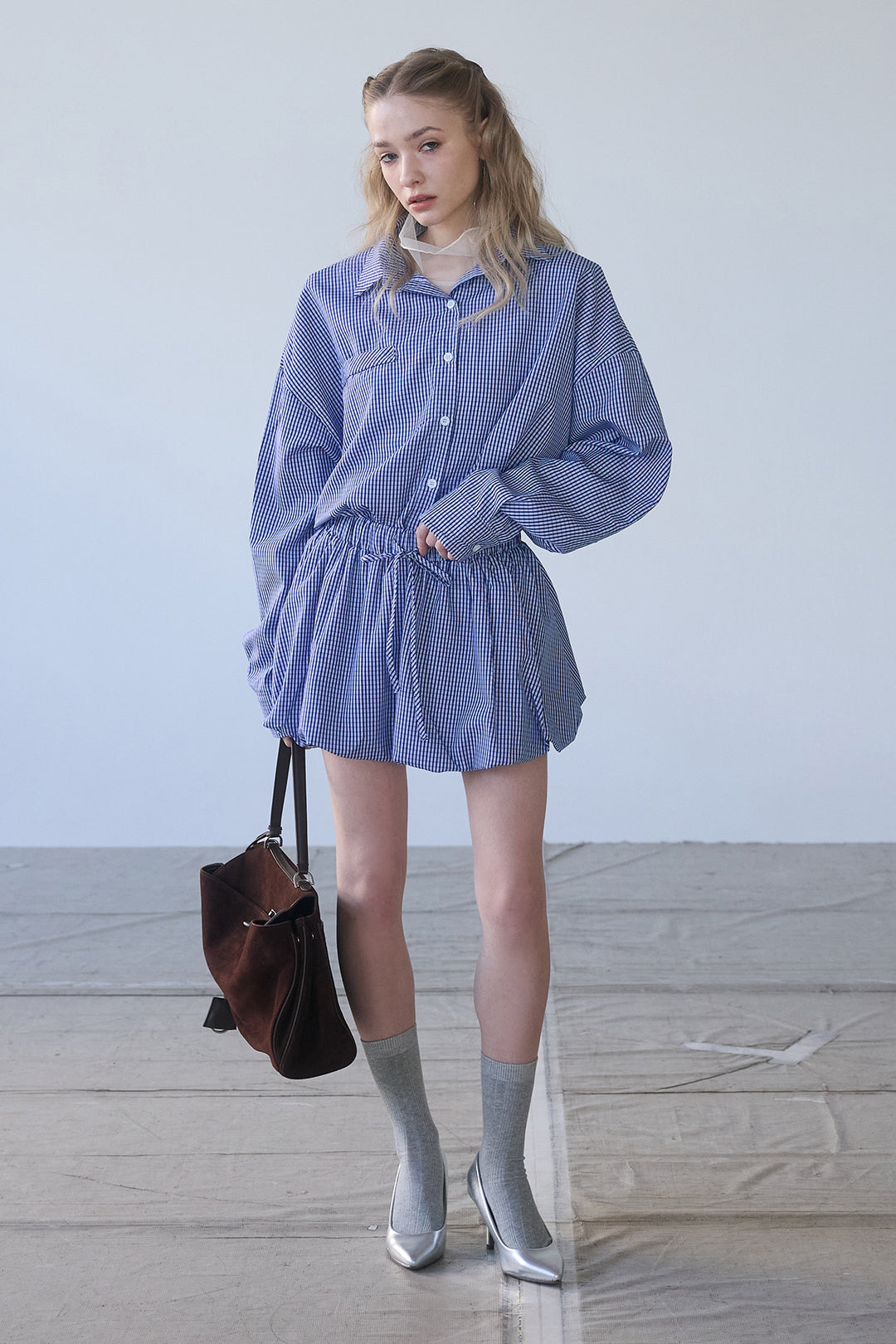 [予約/SET]ハイネックシアーフリルヘムトップス+ギンガムチェックバルーンミニボトムセットアップ(2set)