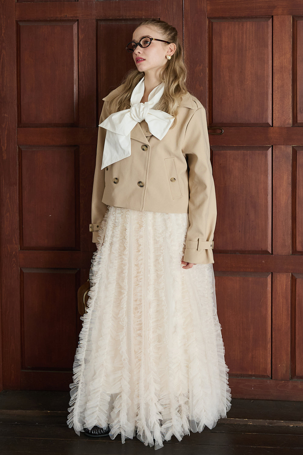 [予約/SET]BIGリボン綿ブラウス+クラシカルショートトレンチ+Iラインホイップチュールスカート(3set)