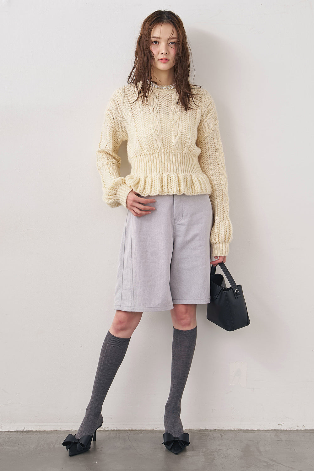 [予約/SET]ケーブル編ミニペプラムニット+デニムベーシックハーフパンツ(2set)