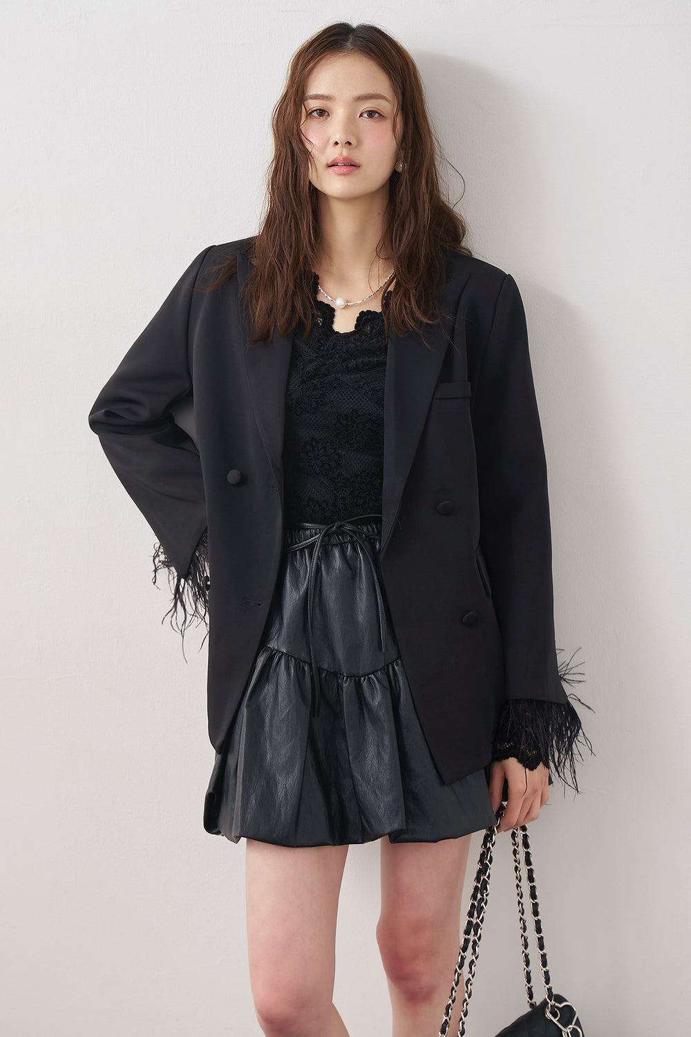 [予約/SET]クラシカルレースVネックトップス+エアリーファザーレディライクジャケット+フェイクレザーティアードバルーンミニスカート(3set)