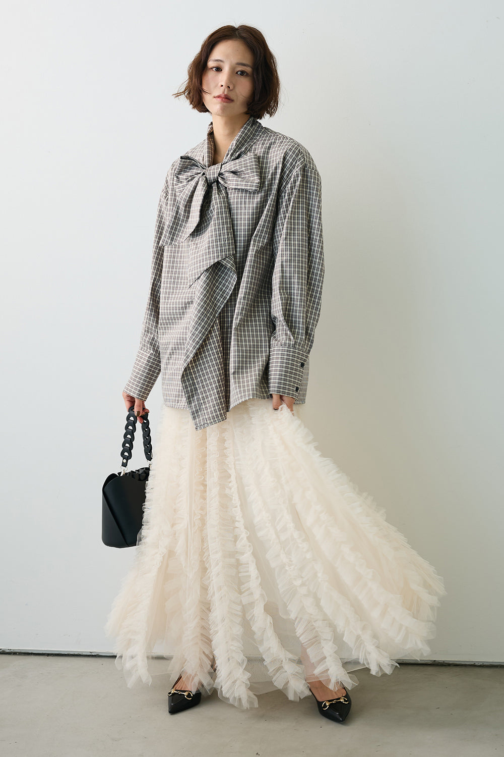 [予約/SET]マルチパターンボウタイアシメシャツ+Iラインホイップチュールスカート(2set)