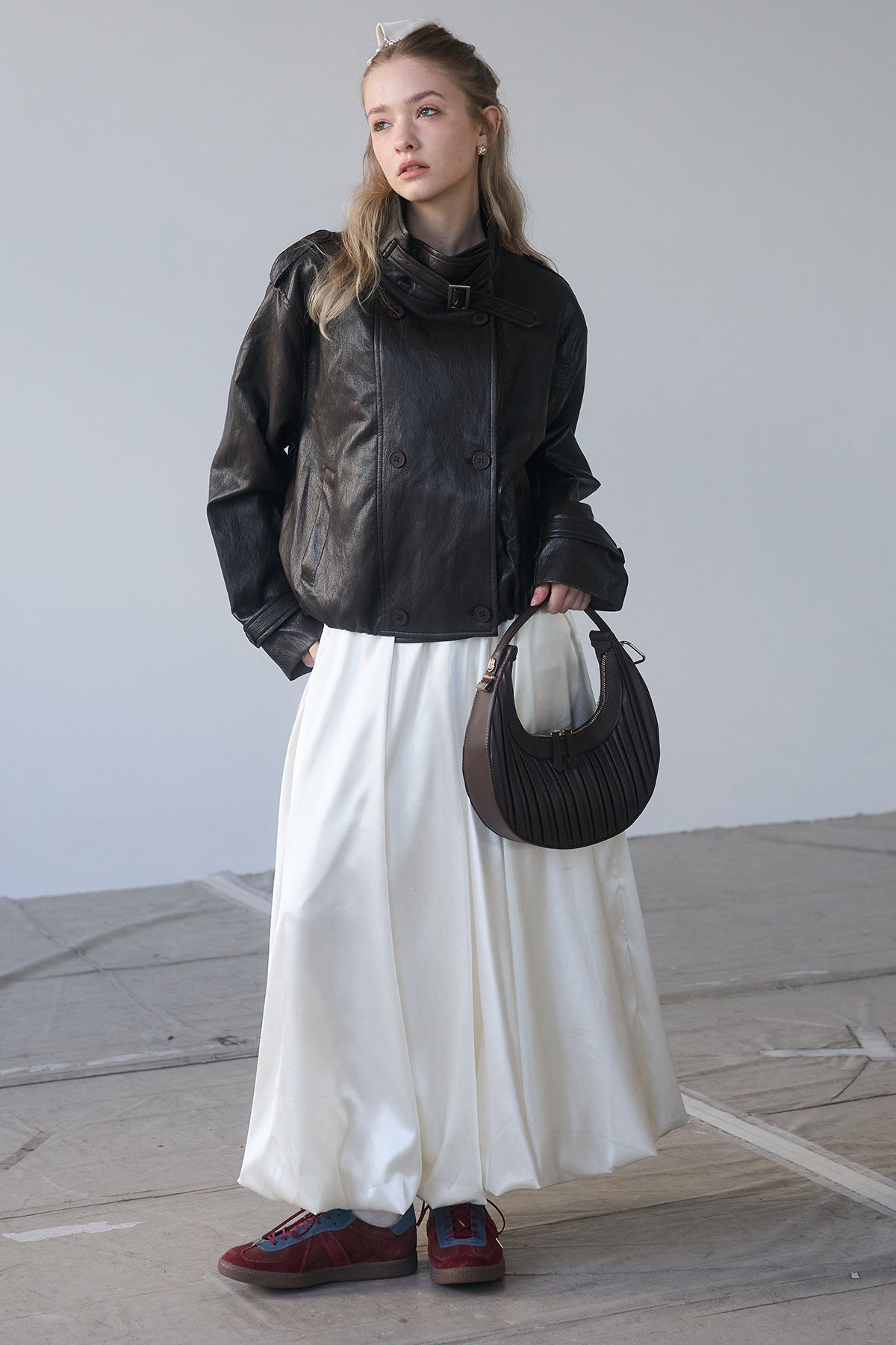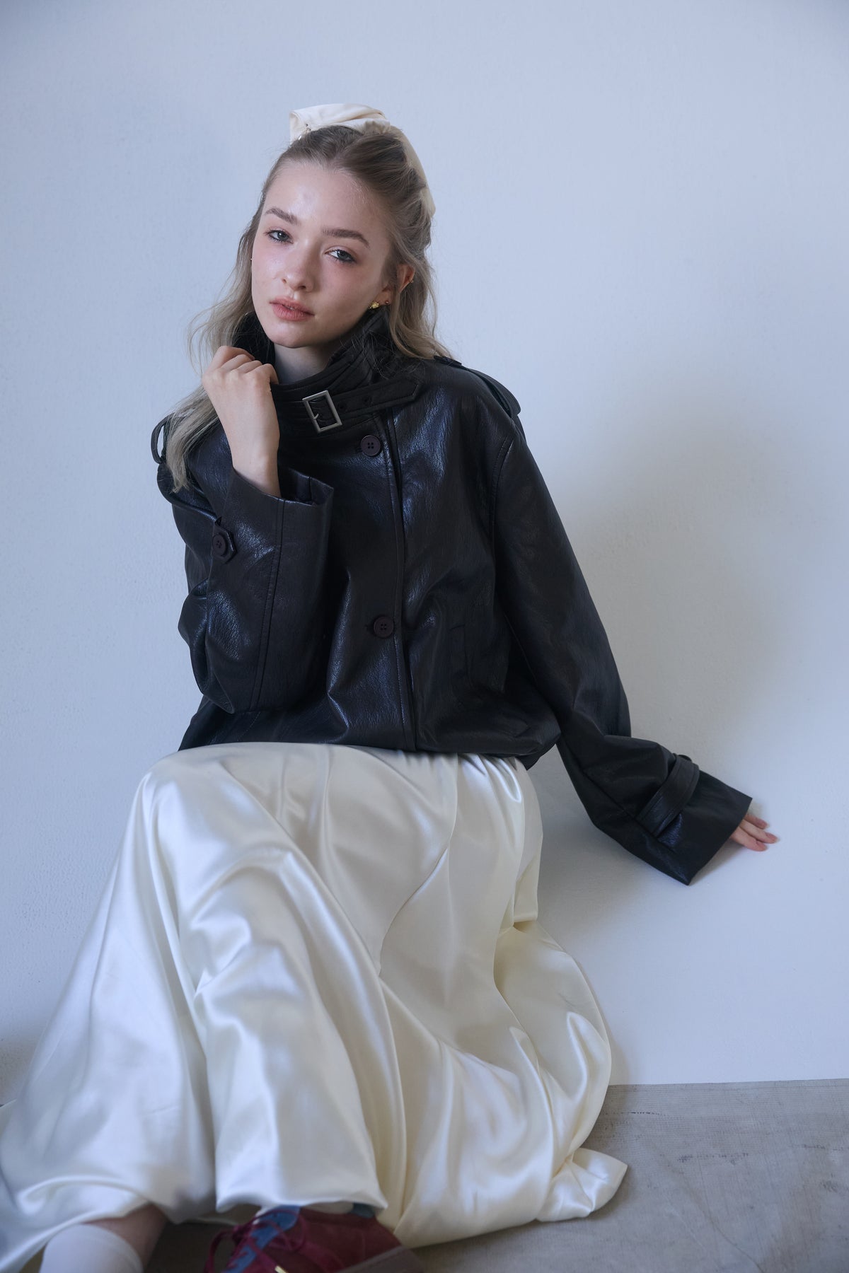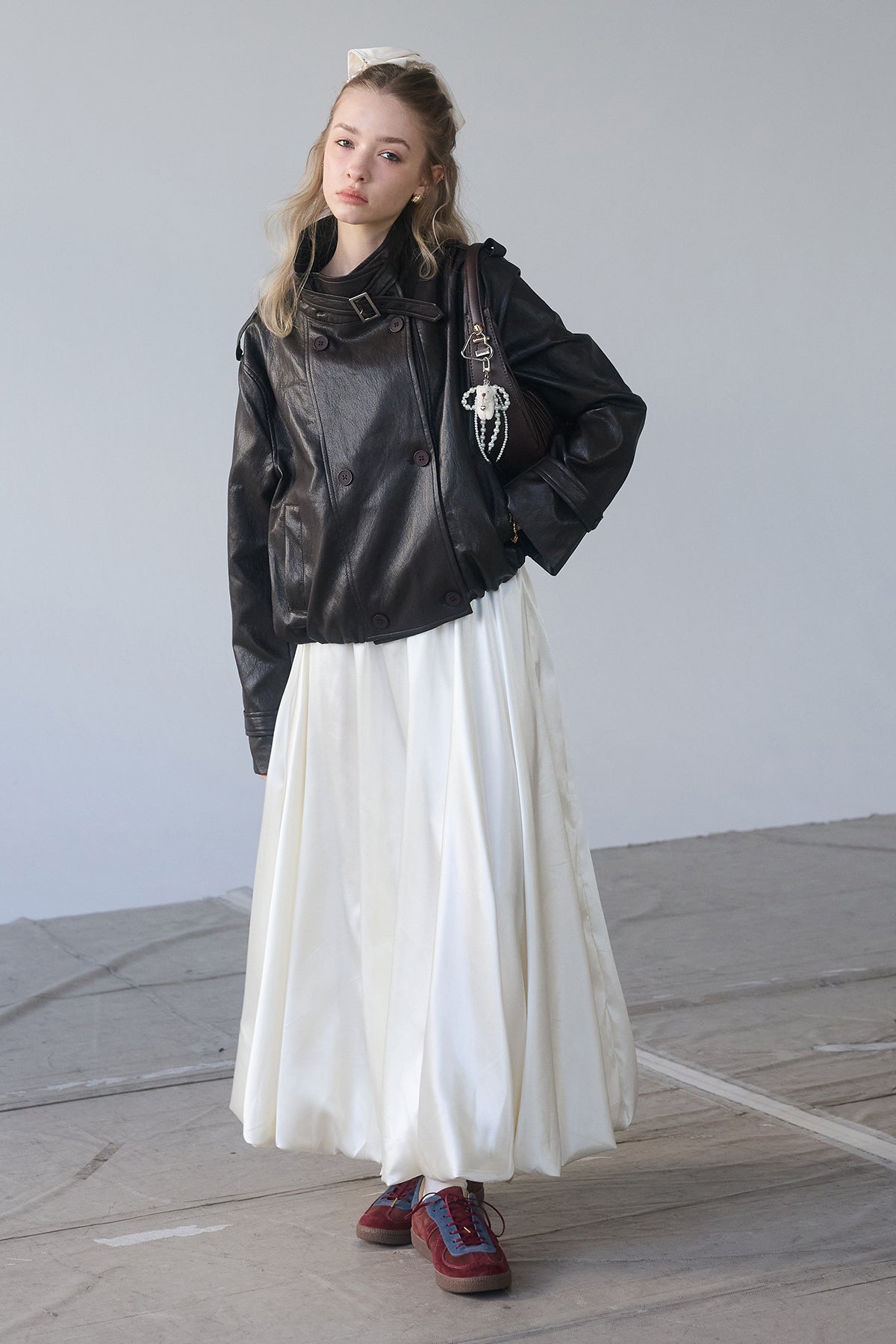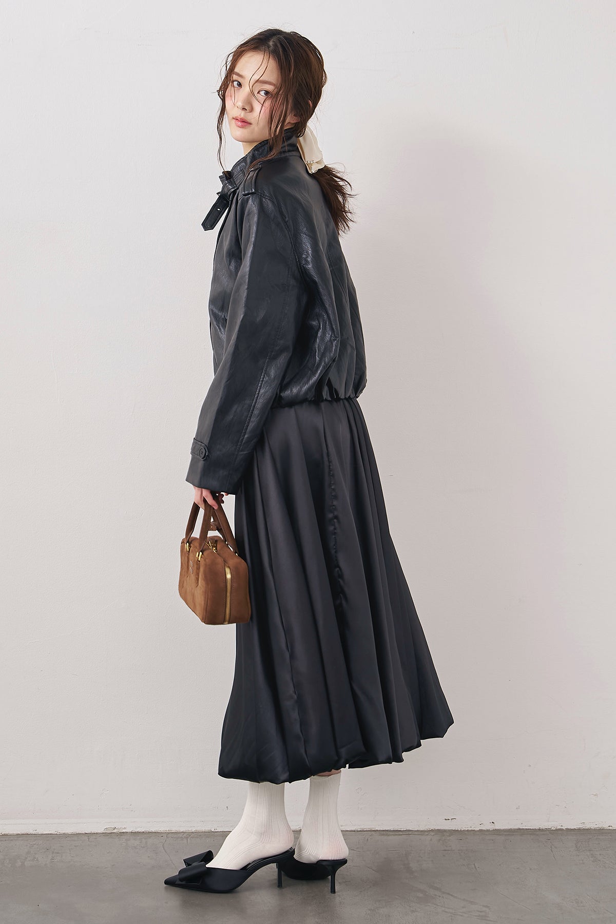 [予約/SET]レザーライククロップドジャケット+サテンシャイニーバルーンスカート(2set)