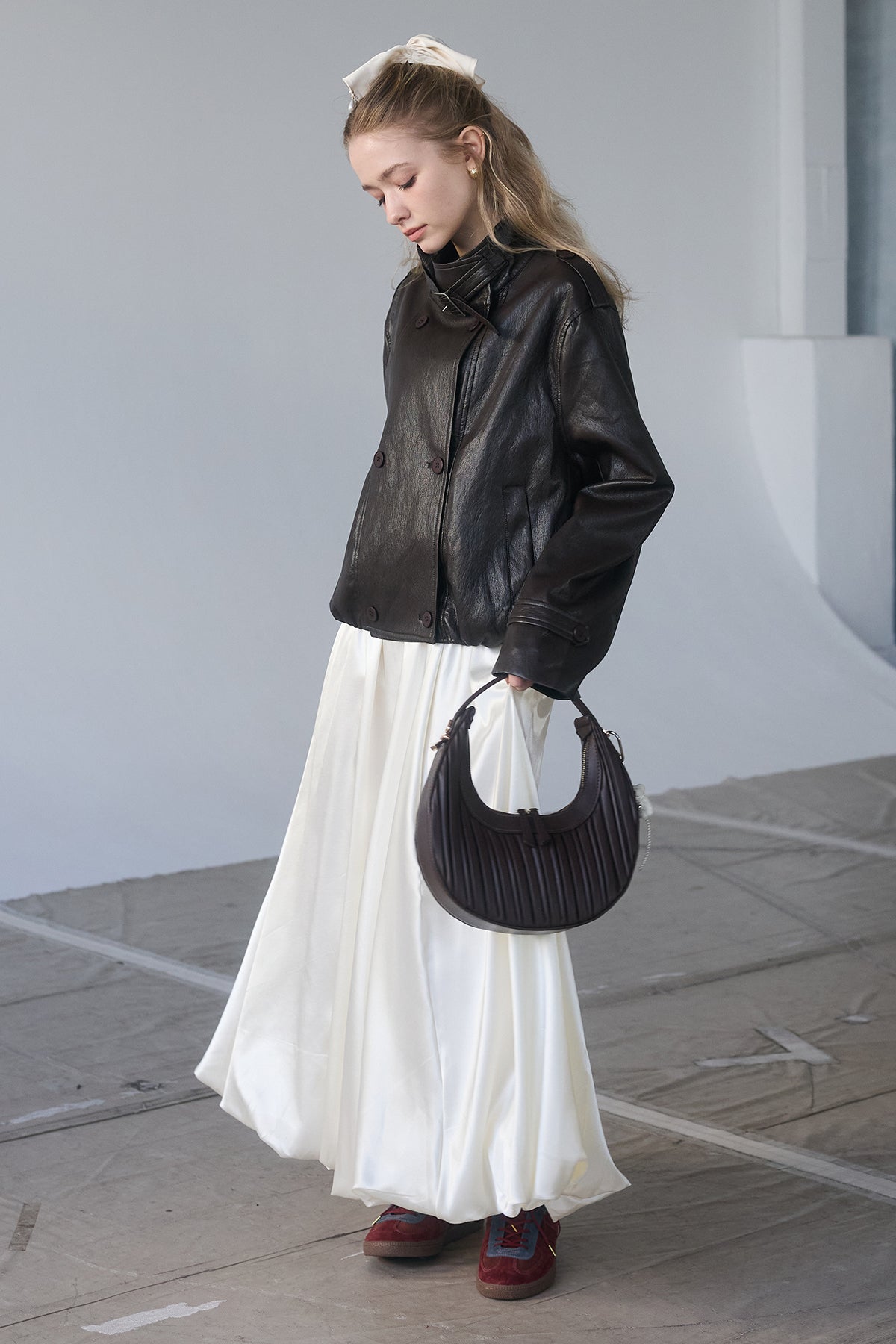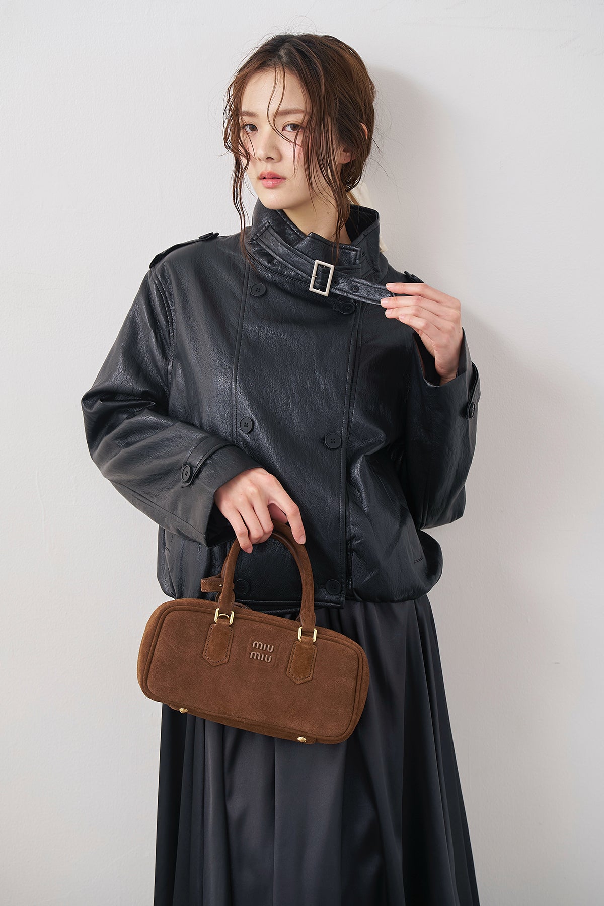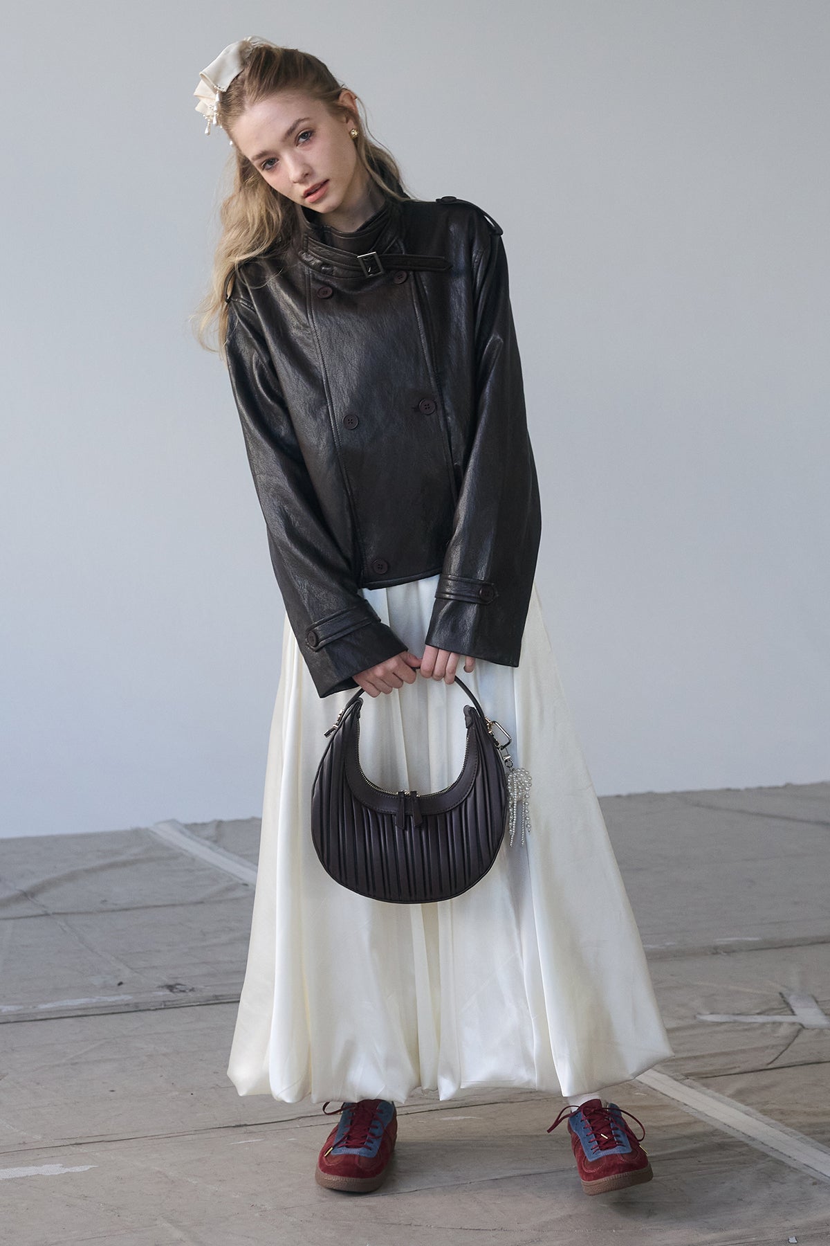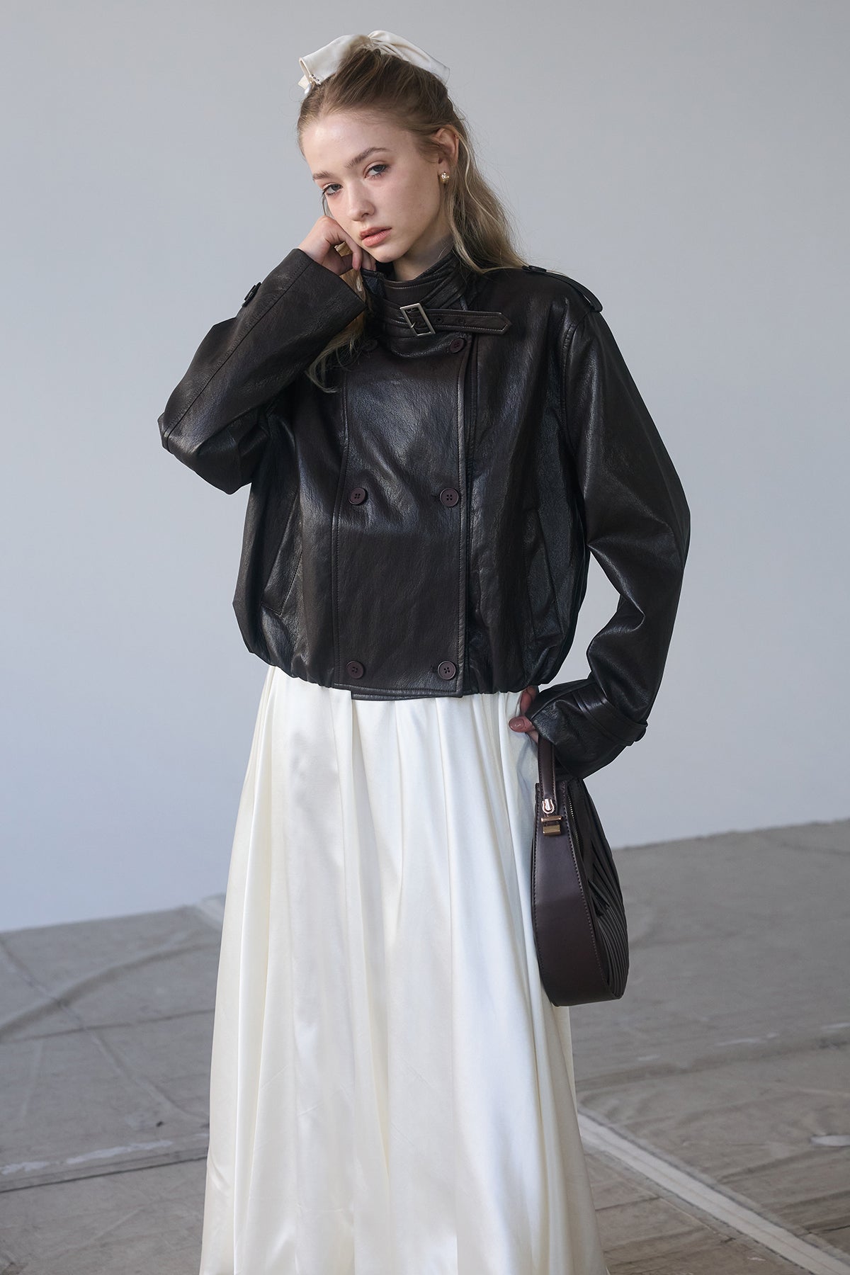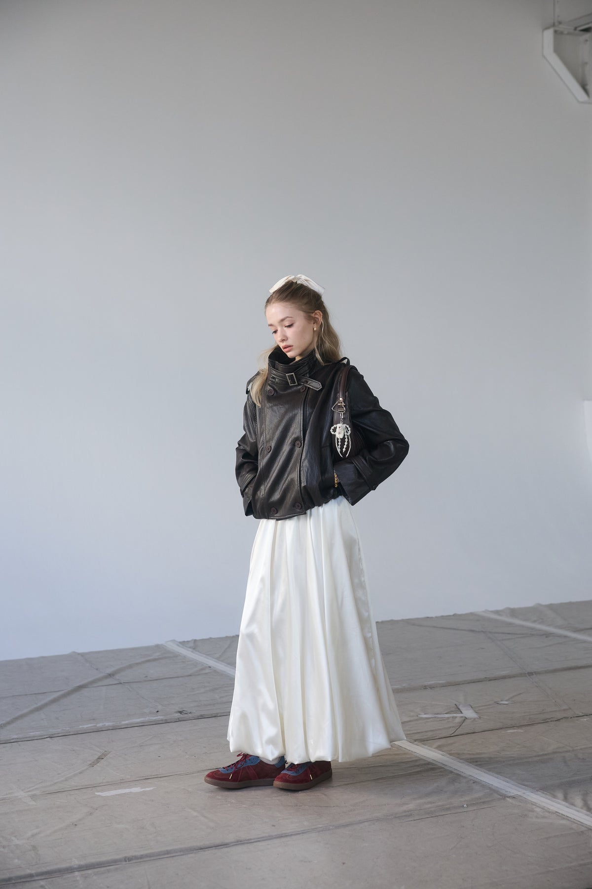 [予約/SET]レザーライククロップドジャケット+サテンシャイニーバルーンスカート(2set)