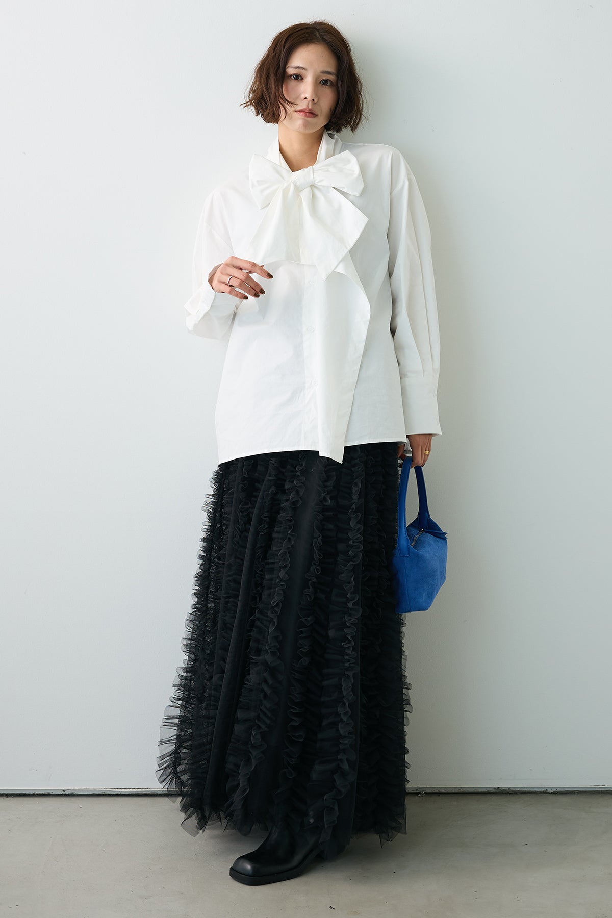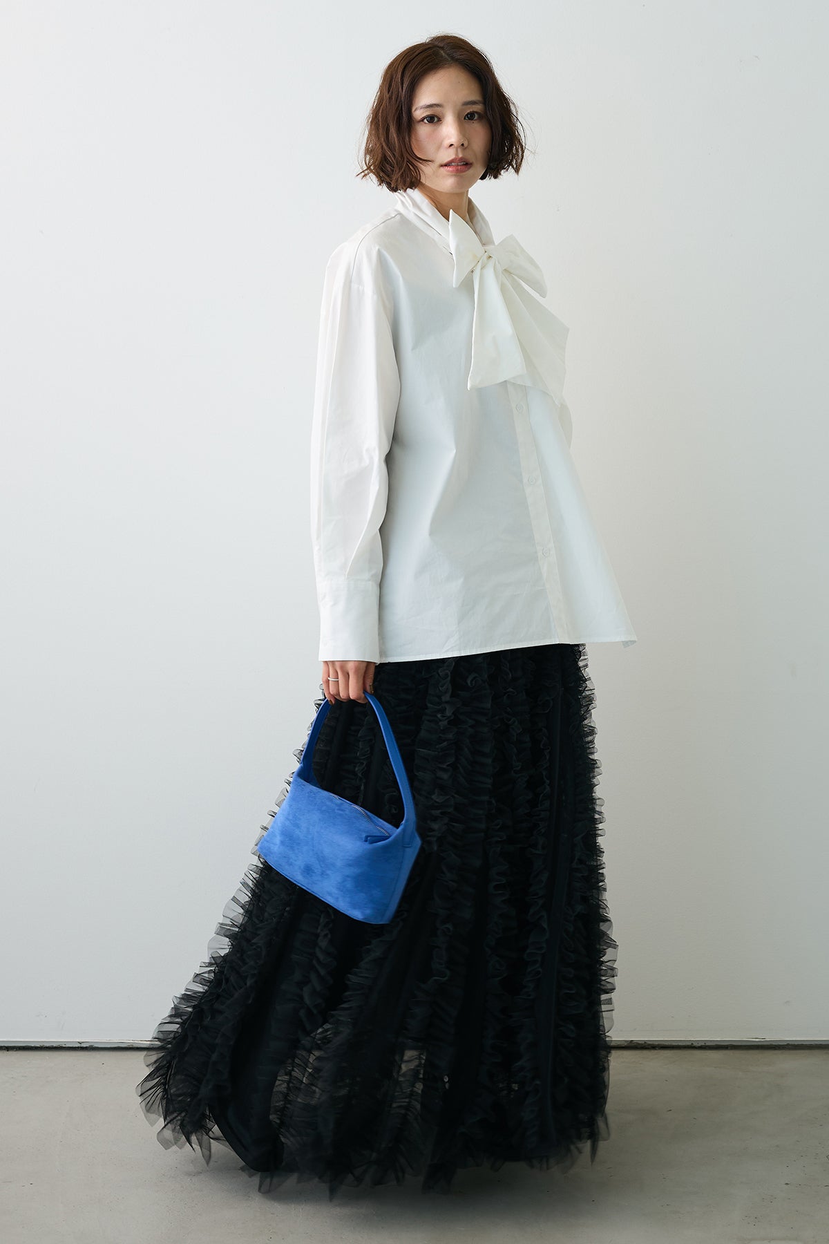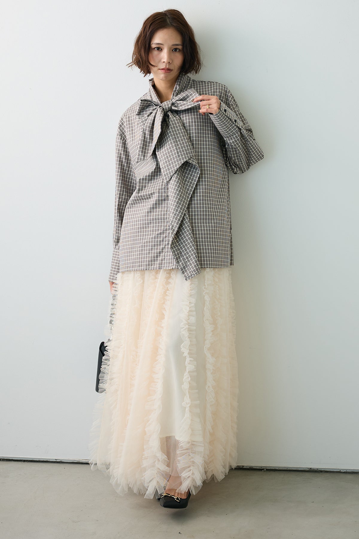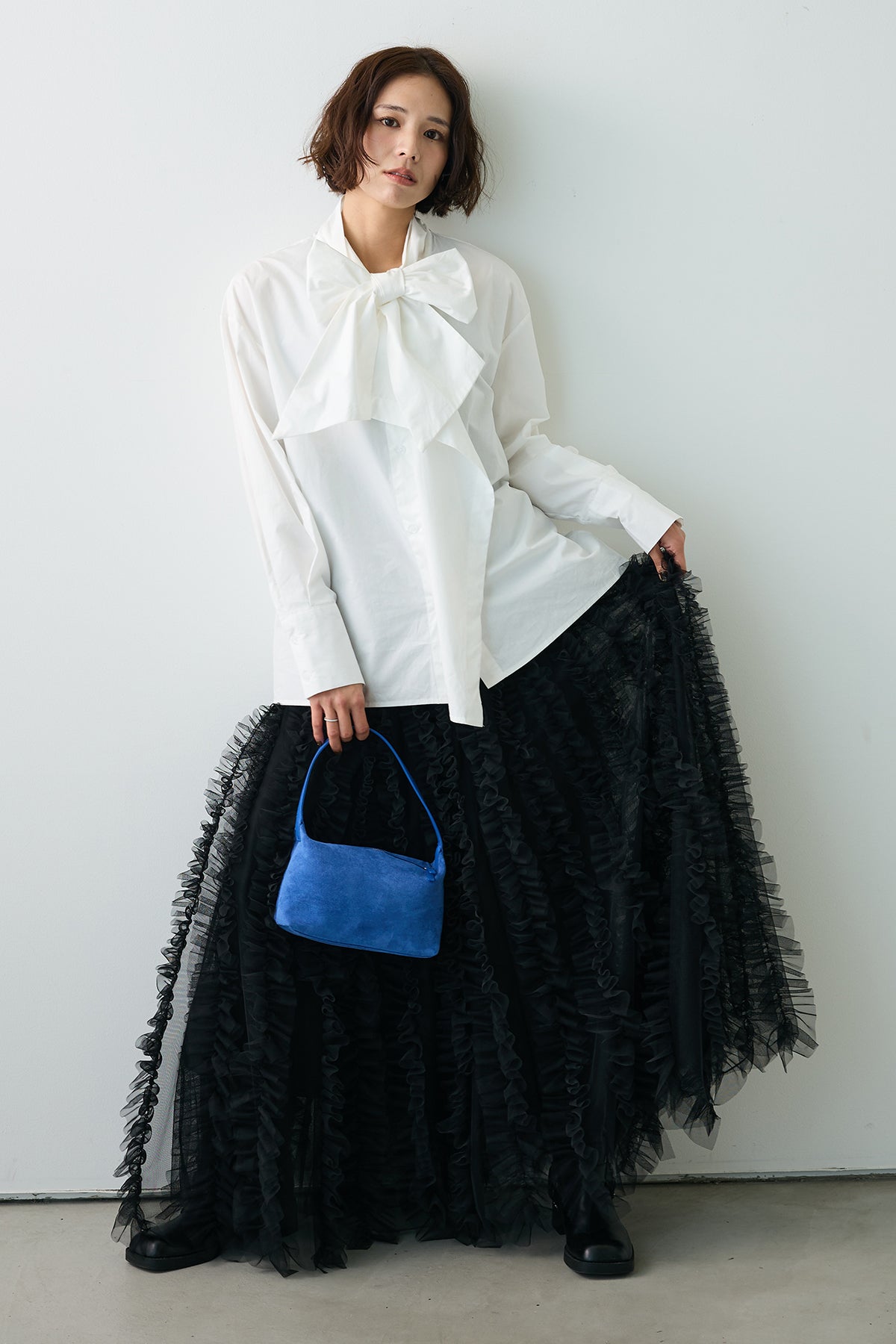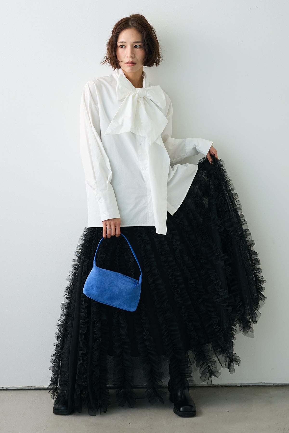 [予約/SET]マルチパターンボウタイアシメシャツ+Iラインホイップチュールスカート(2set)