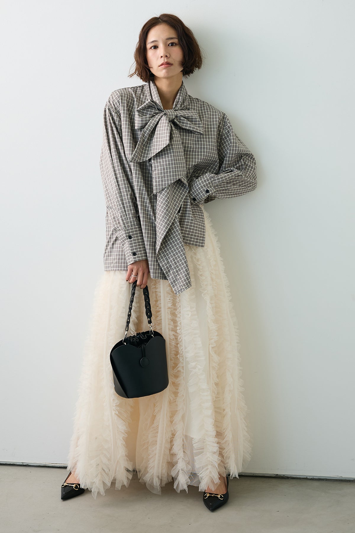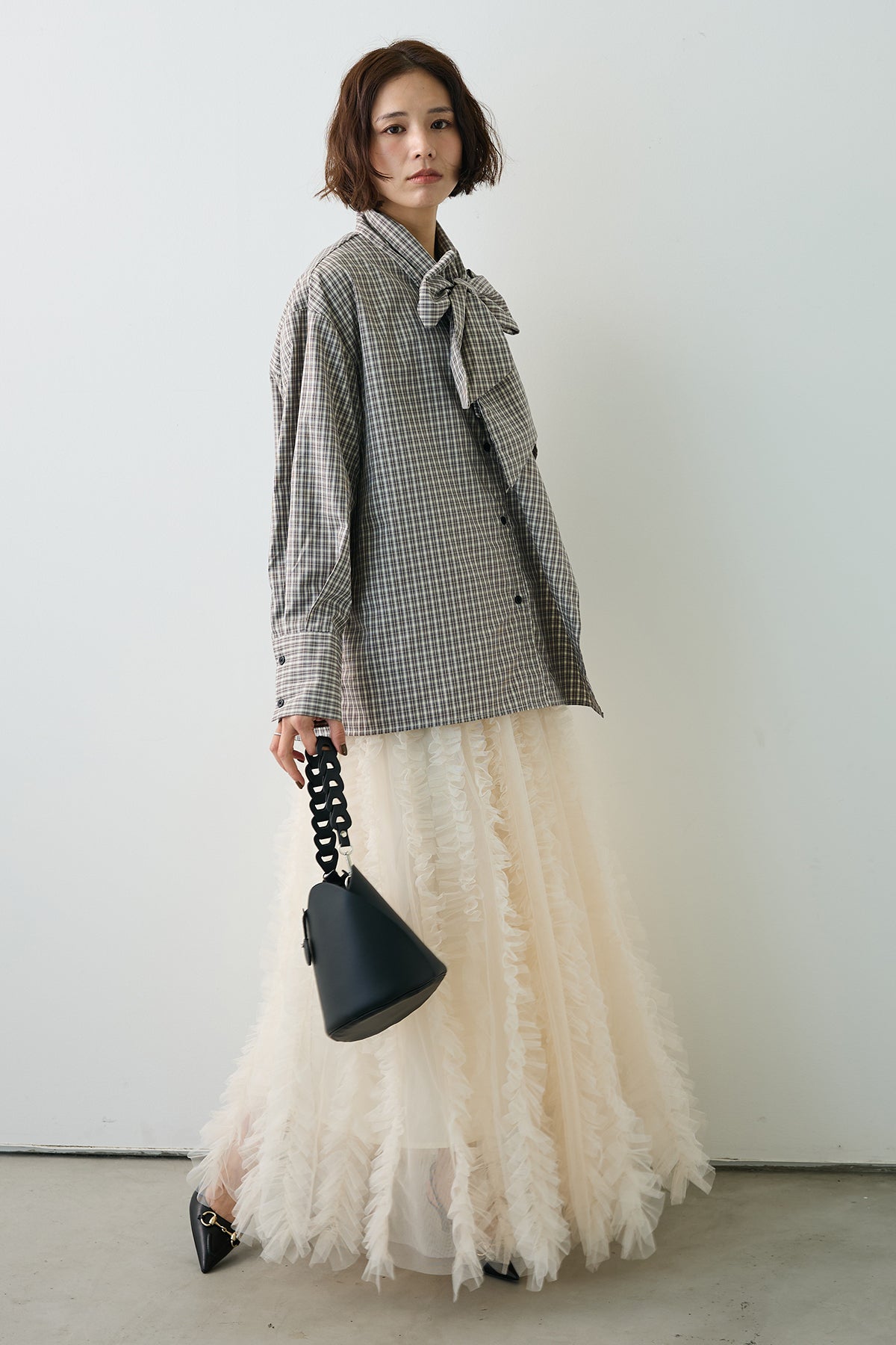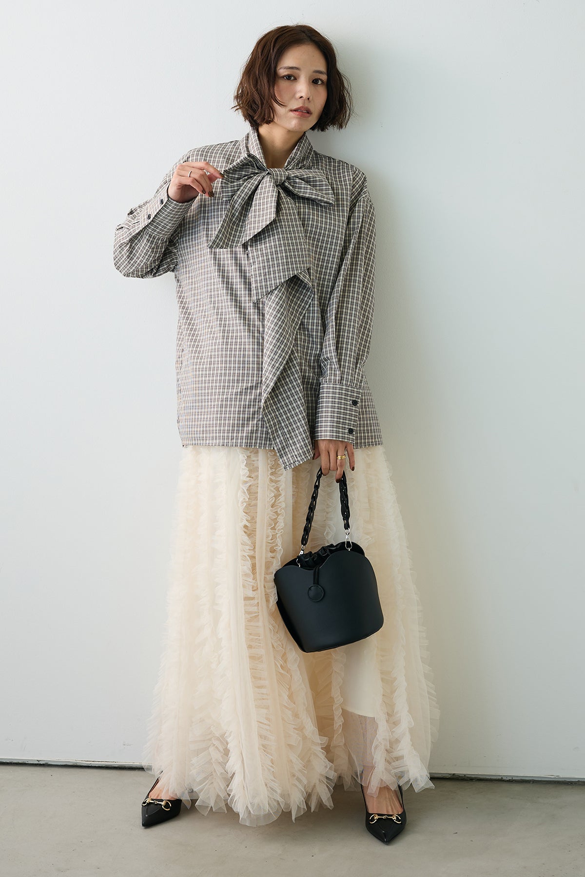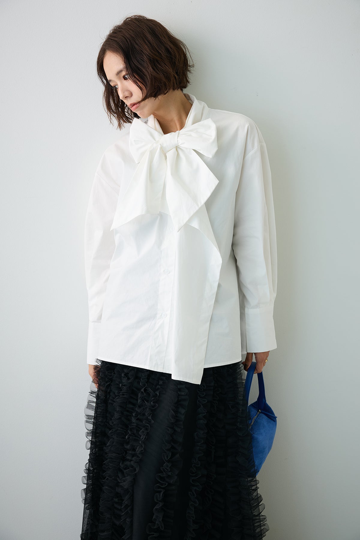 [予約/SET]マルチパターンボウタイアシメシャツ+Iラインホイップチュールスカート(2set)