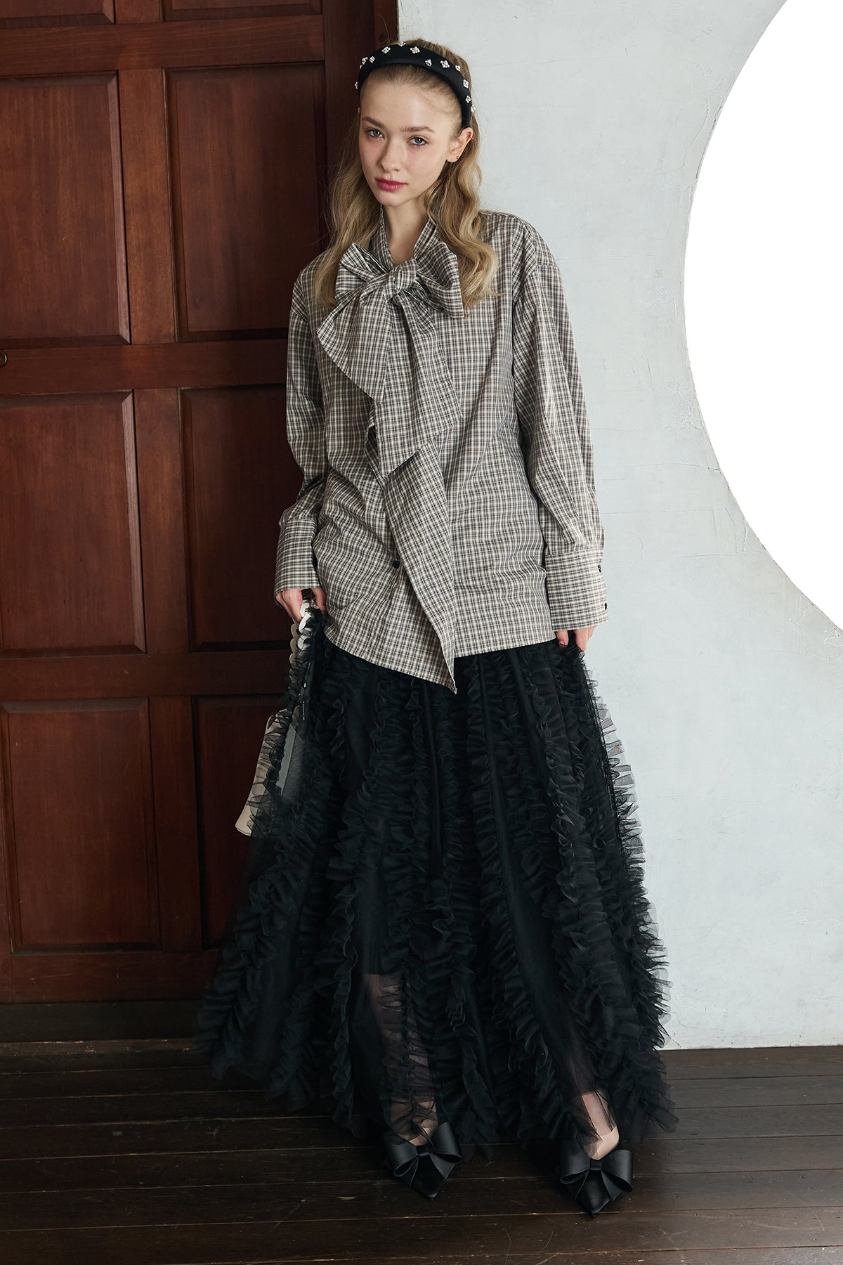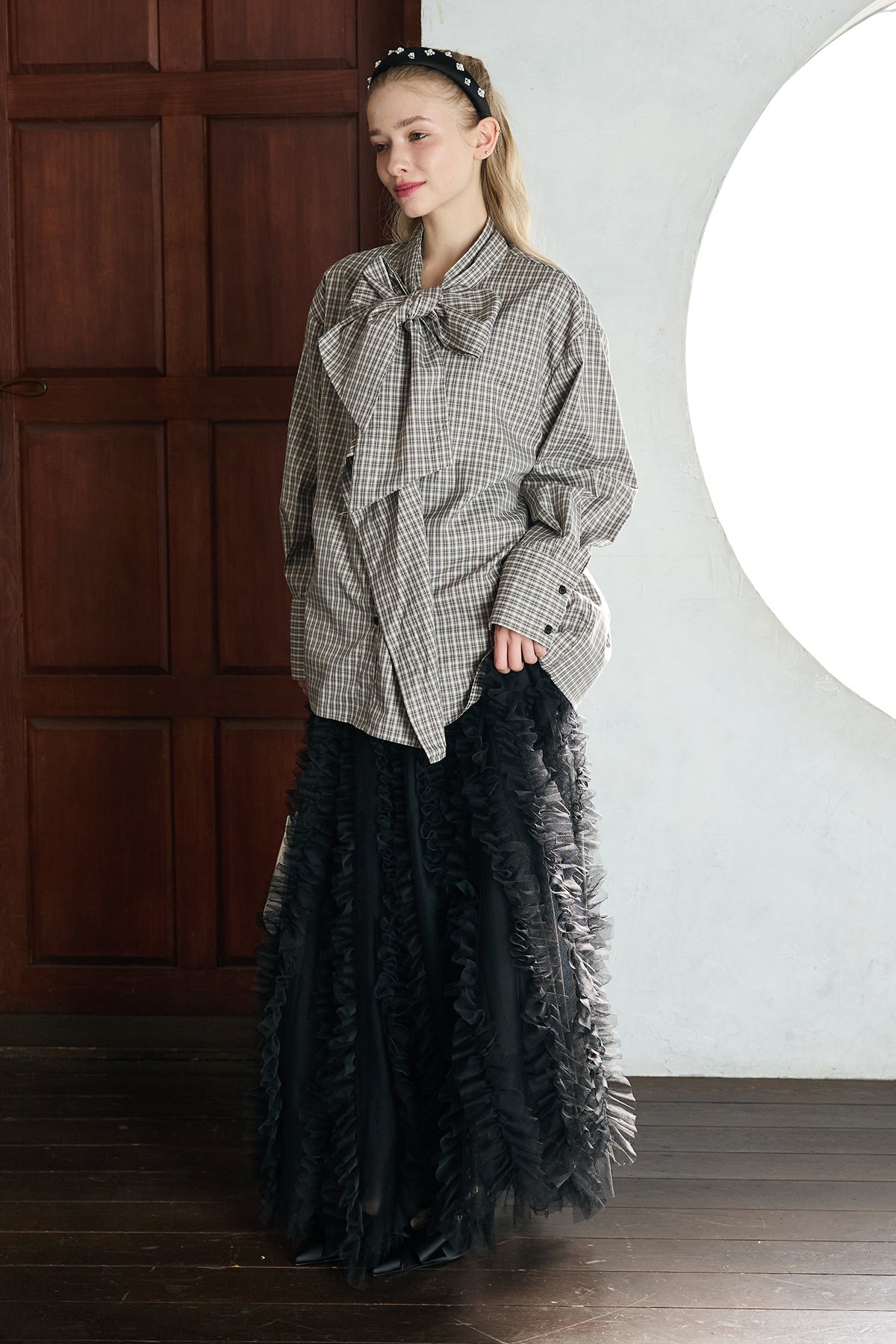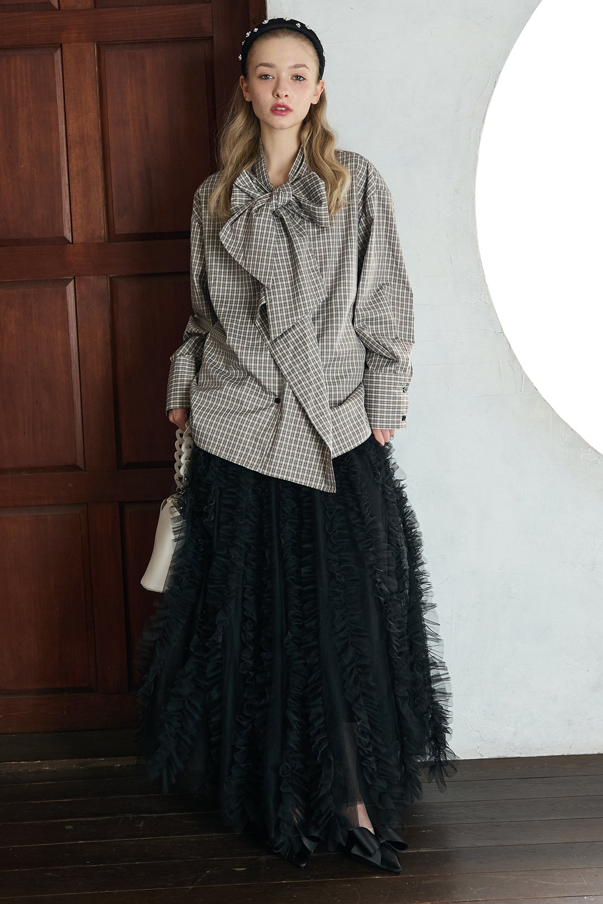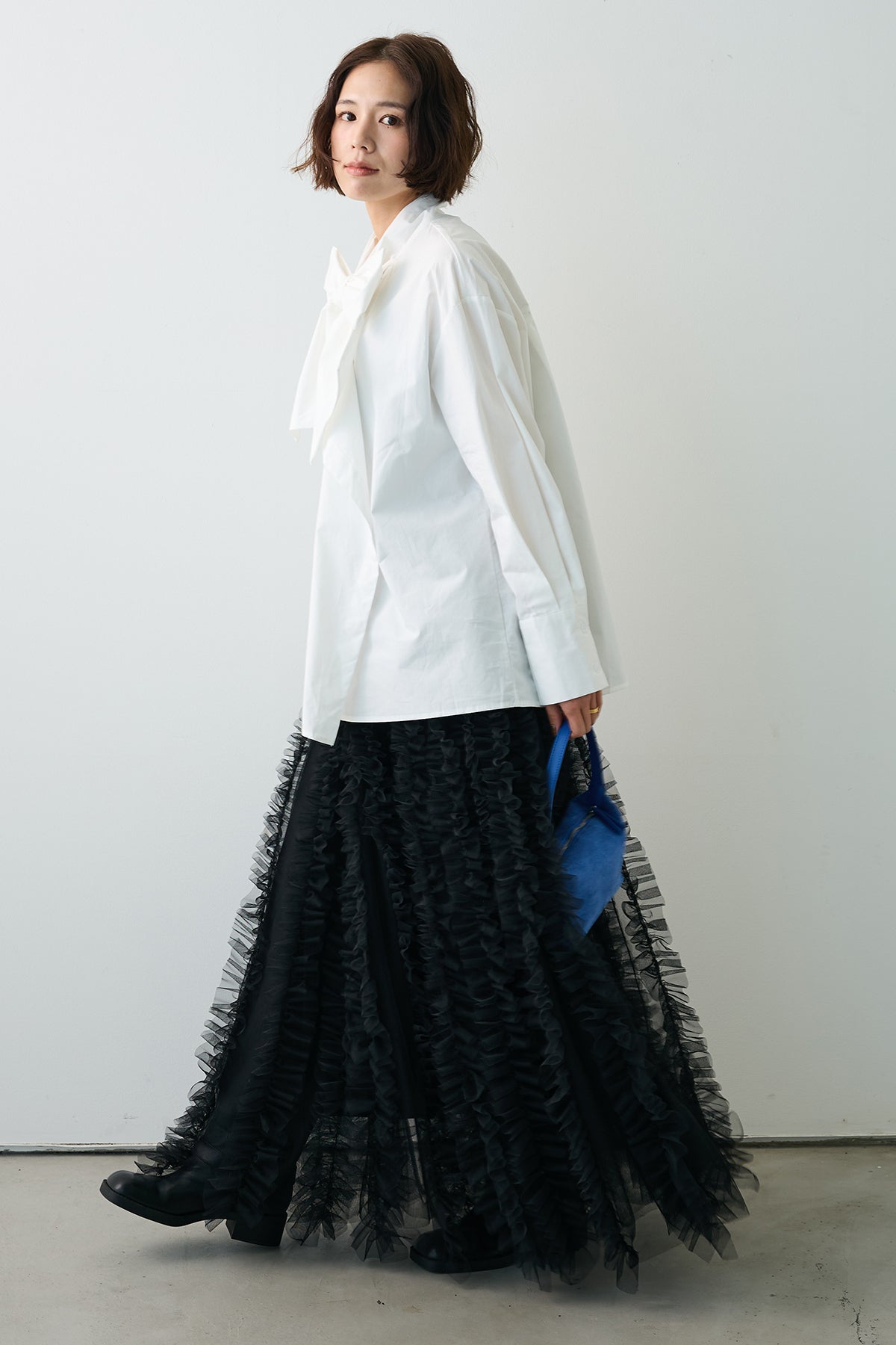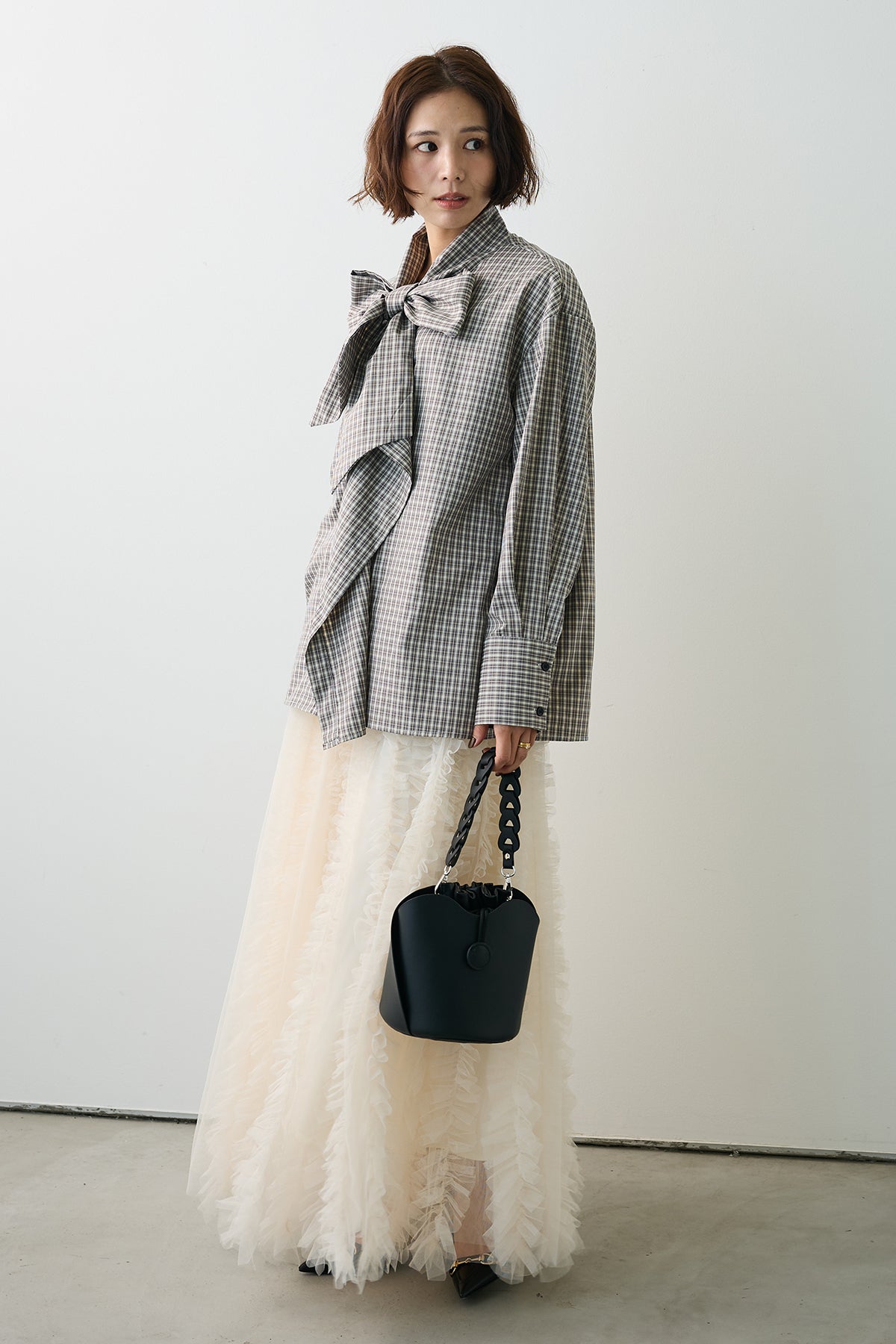 [予約/SET]マルチパターンボウタイアシメシャツ+Iラインホイップチュールスカート(2set)