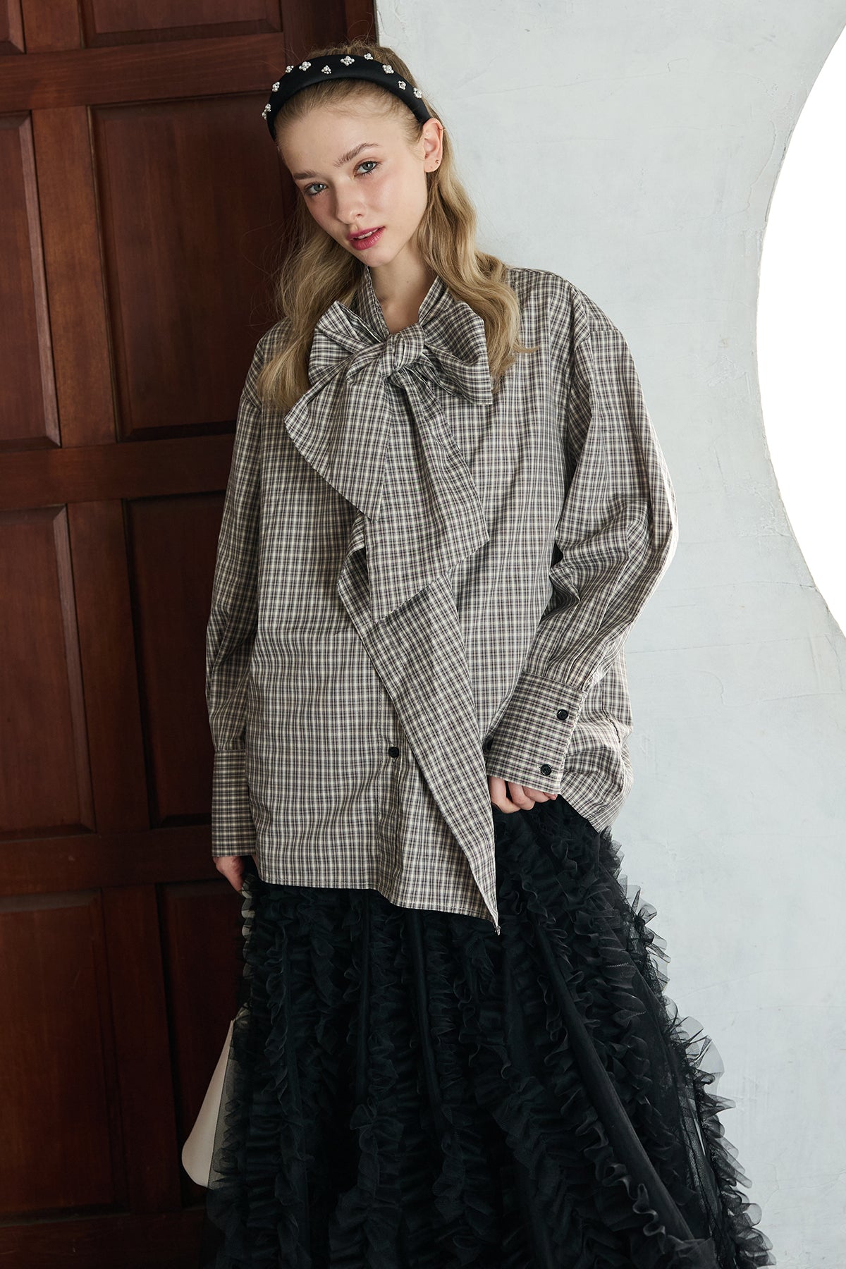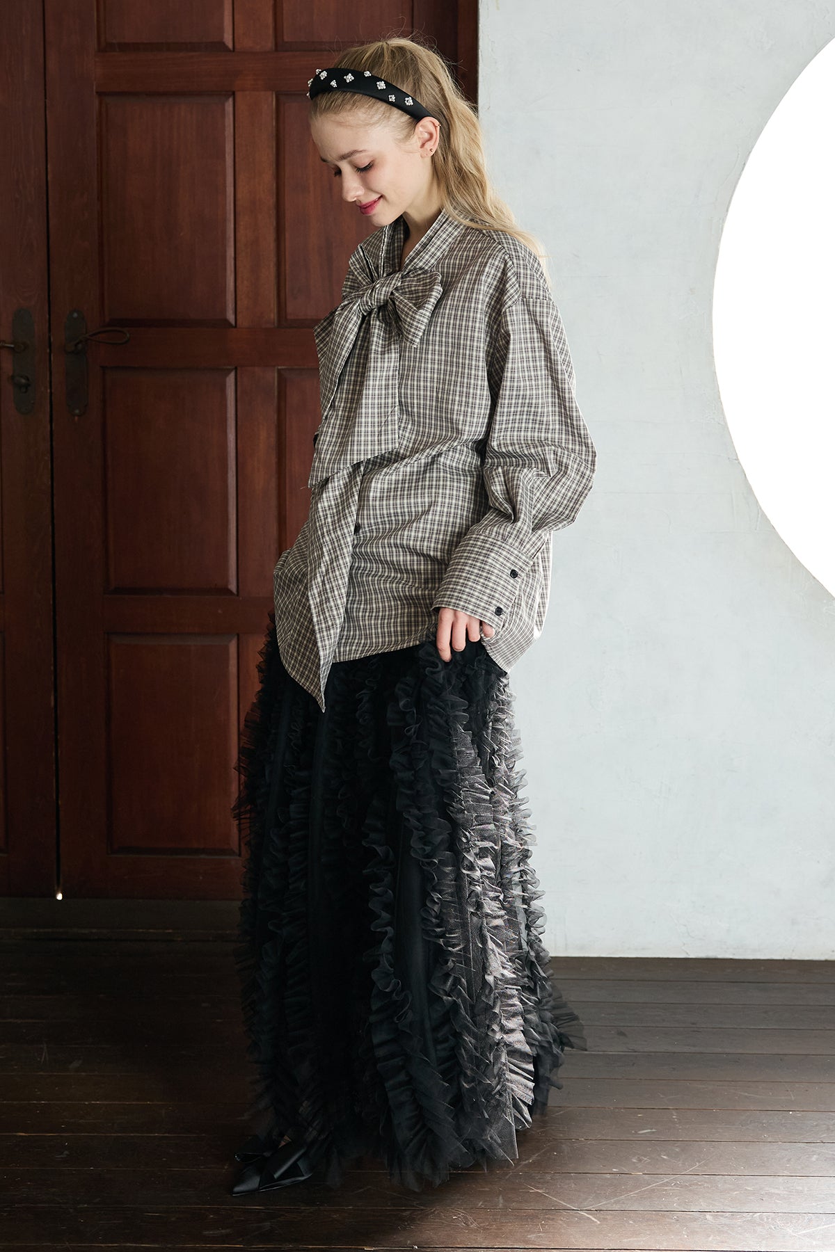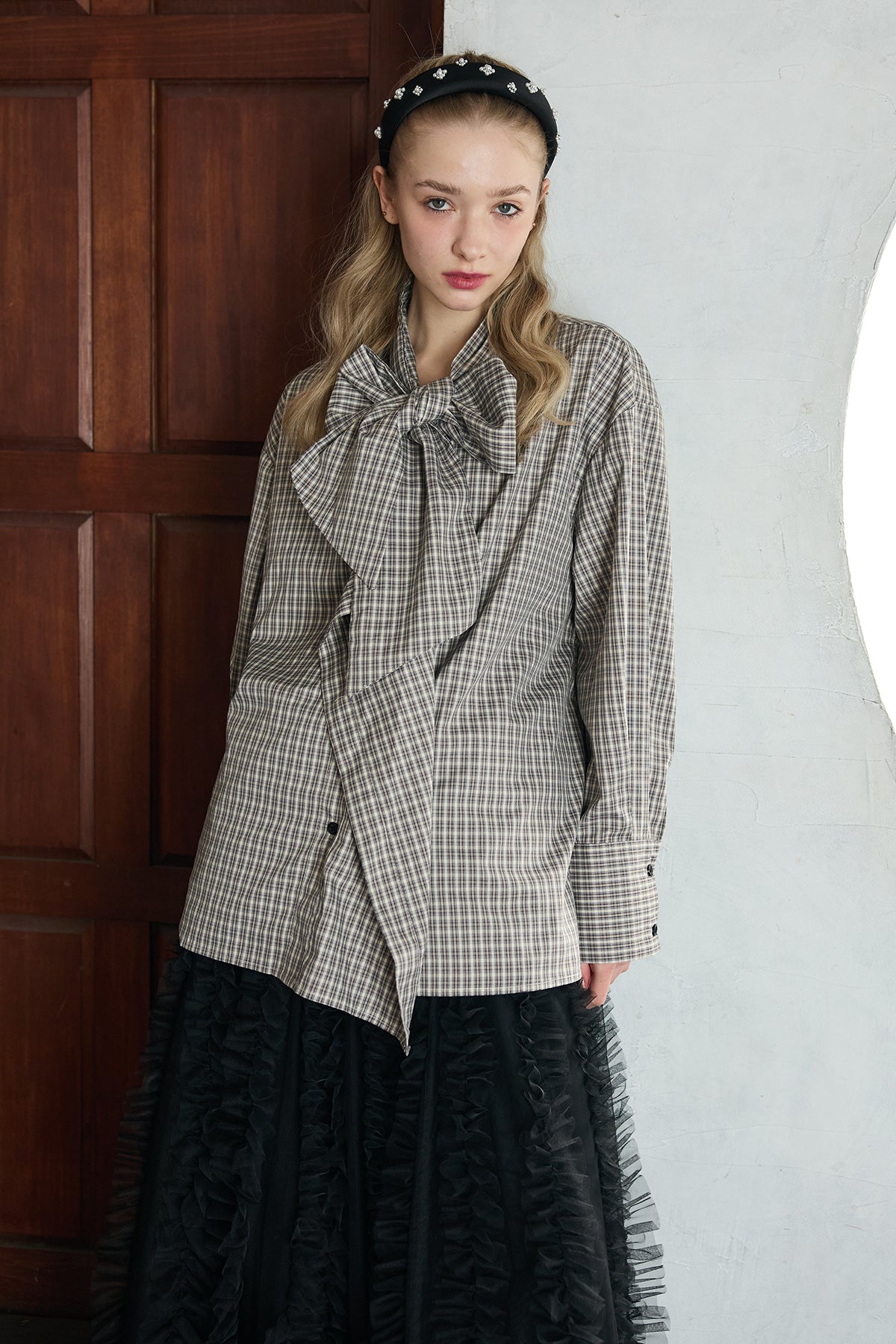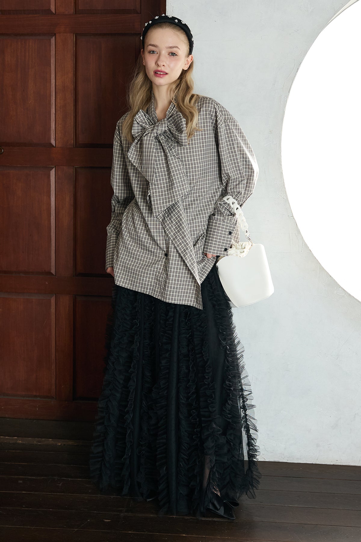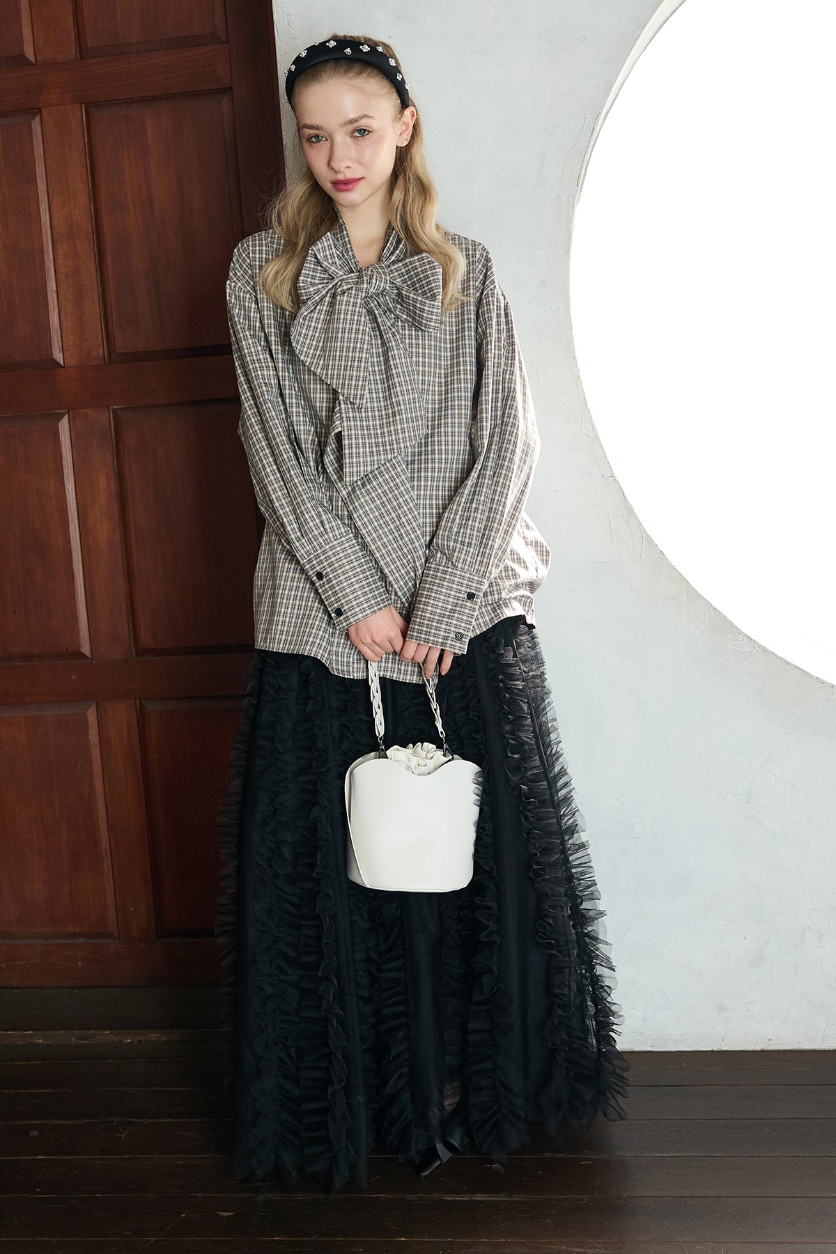 [予約/SET]マルチパターンボウタイアシメシャツ+Iラインホイップチュールスカート(2set)