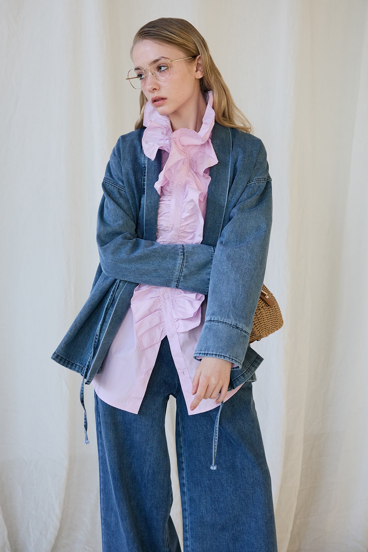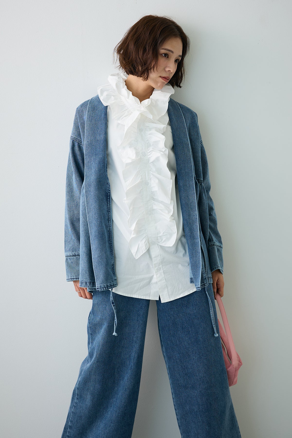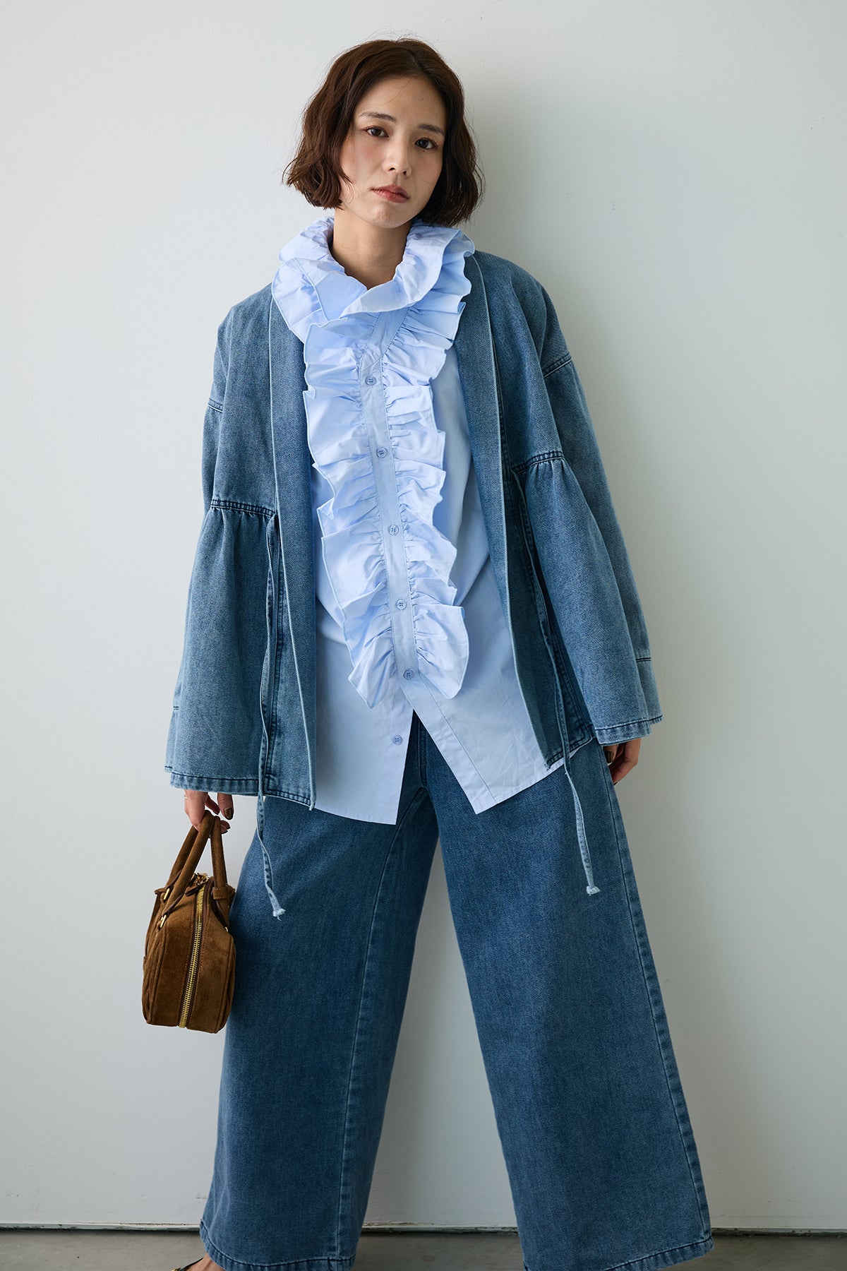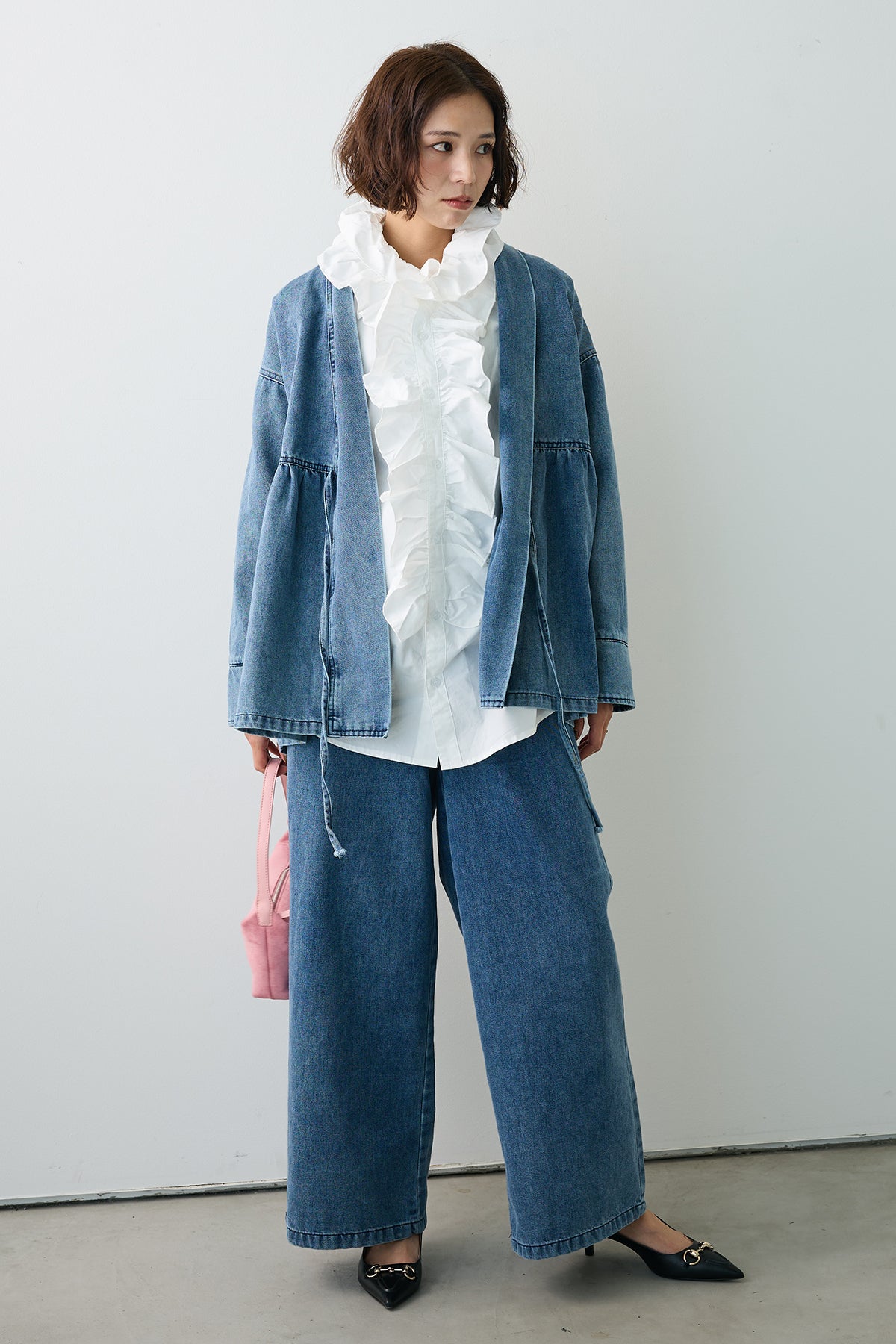 [予約/SET]ブルームカラーフリルブラウス+ノーカラーデニムルーズセットアップ(2set)