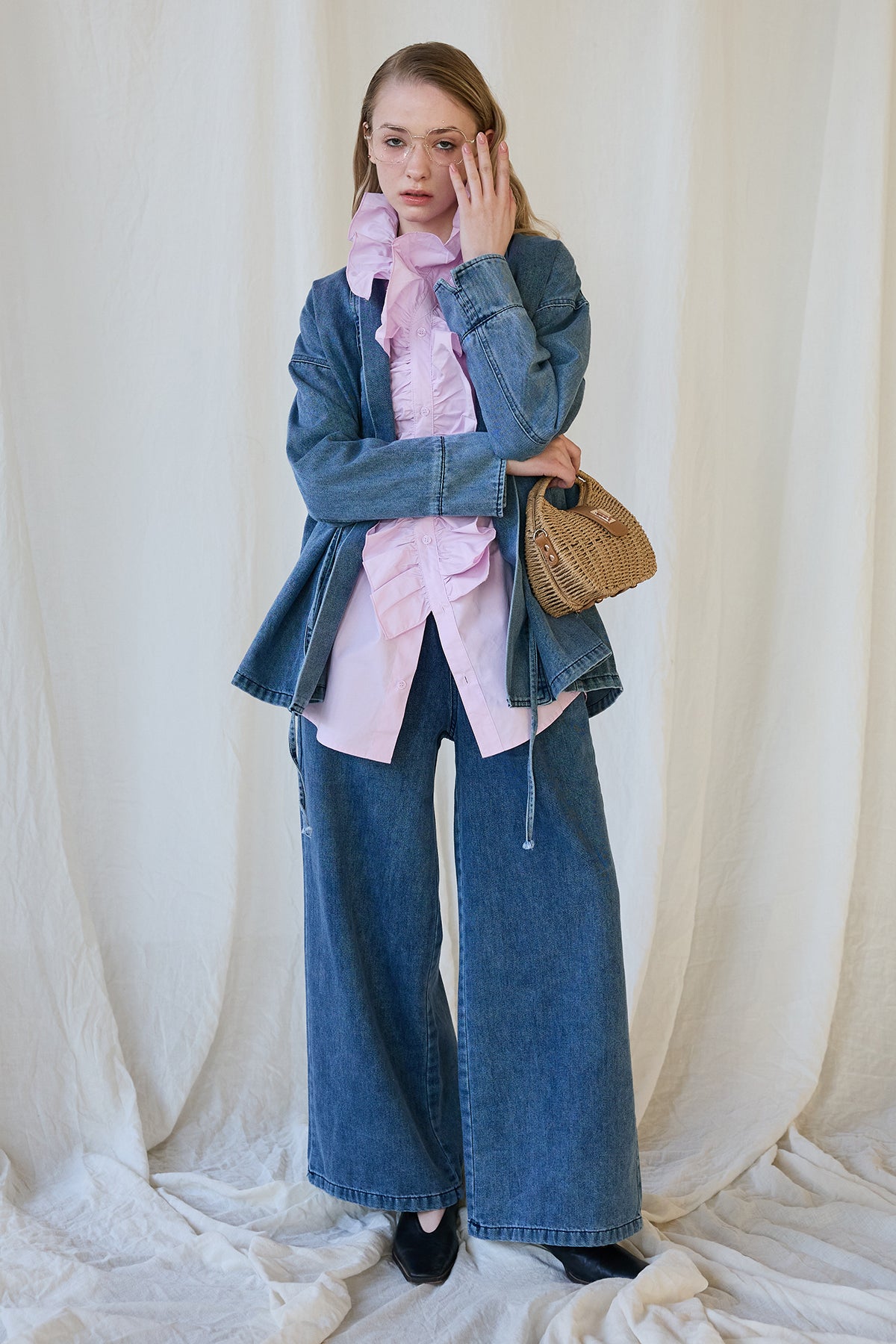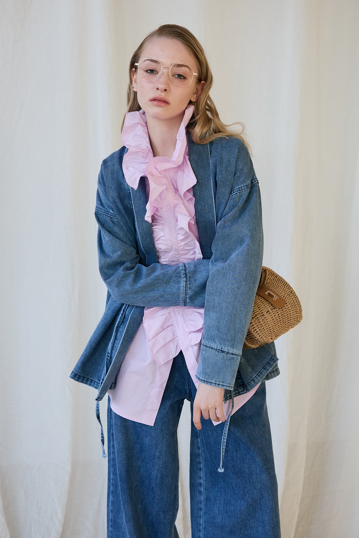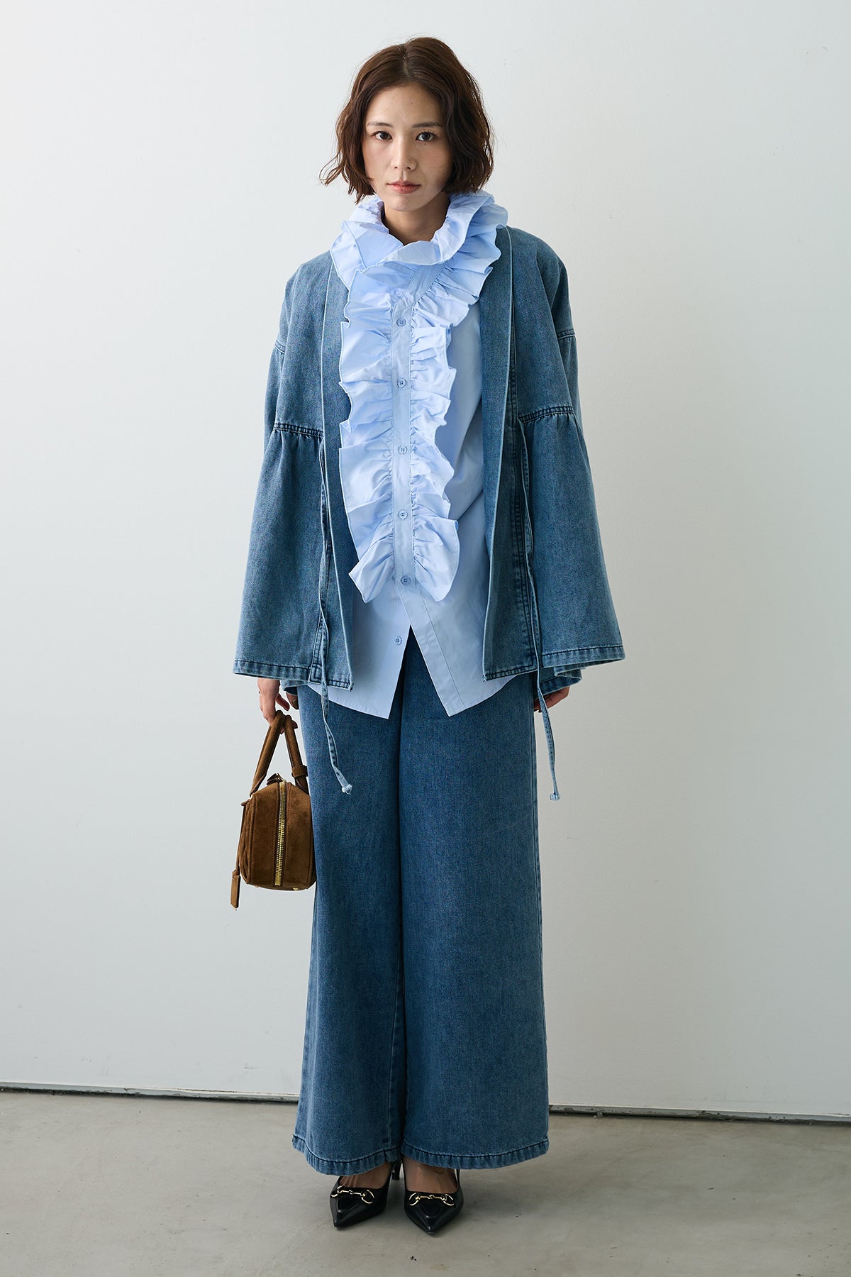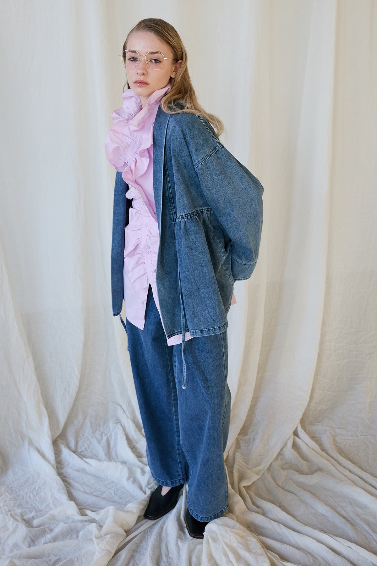 [予約/SET]ブルームカラーフリルブラウス+ノーカラーデニムルーズセットアップ(2set)