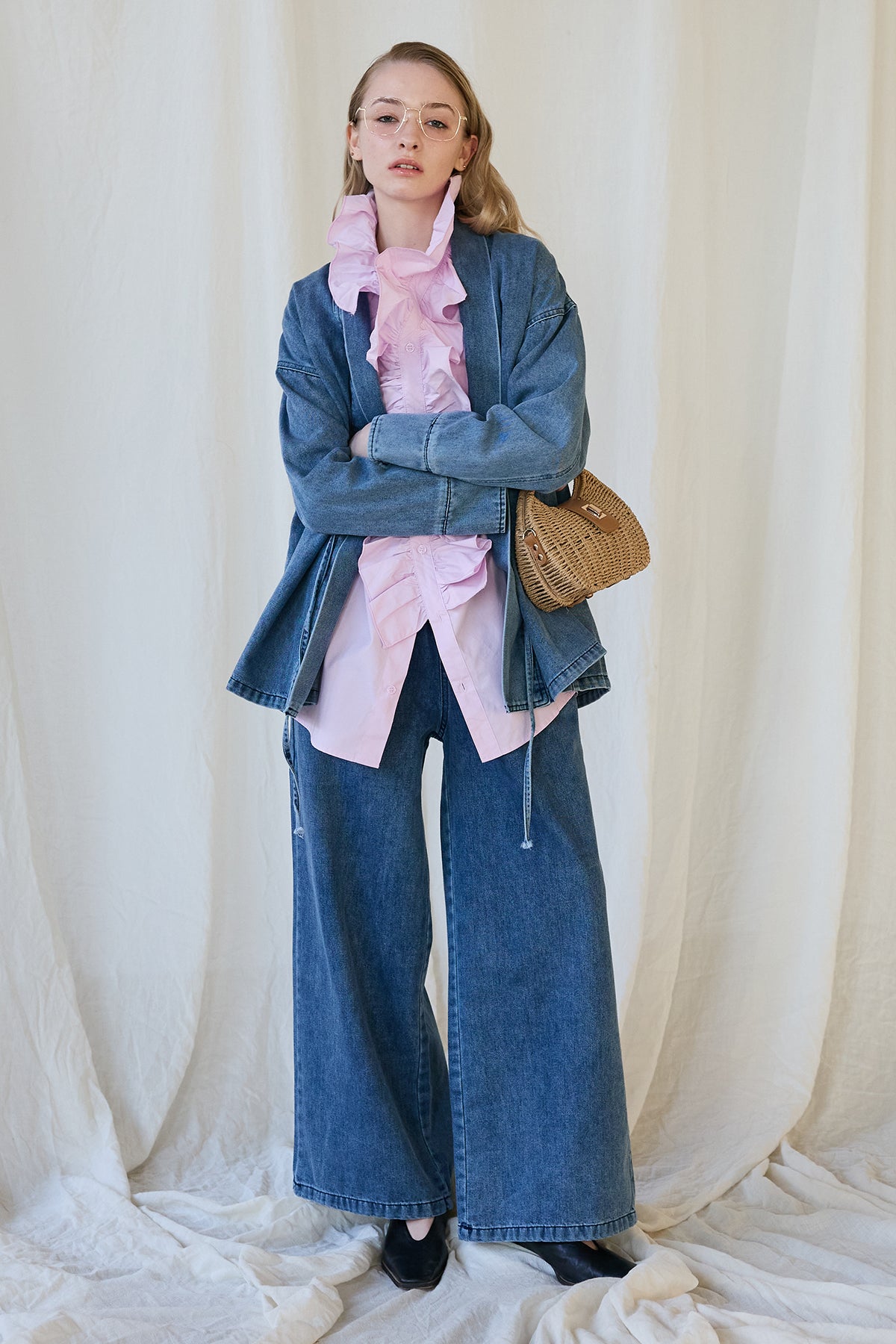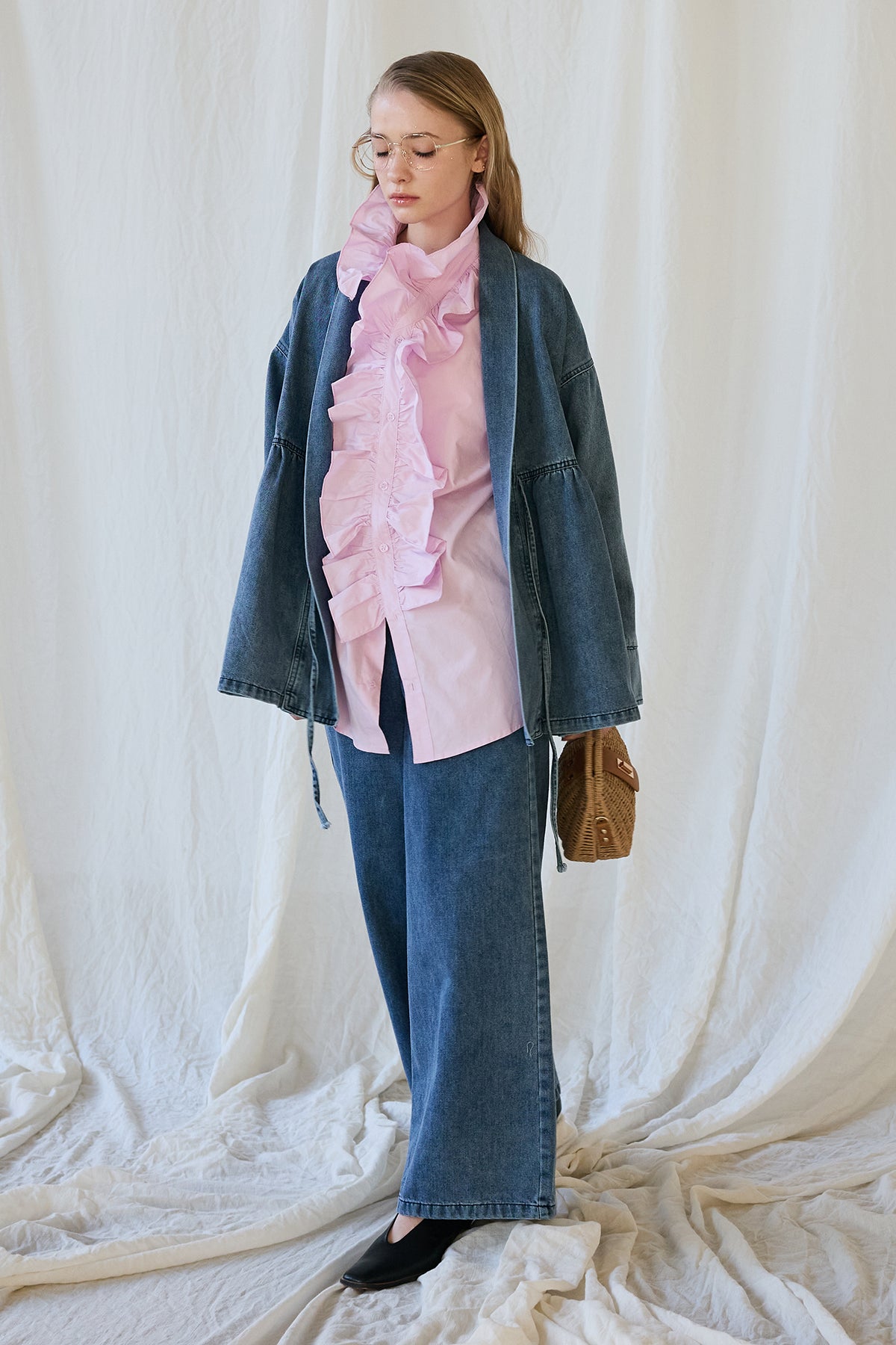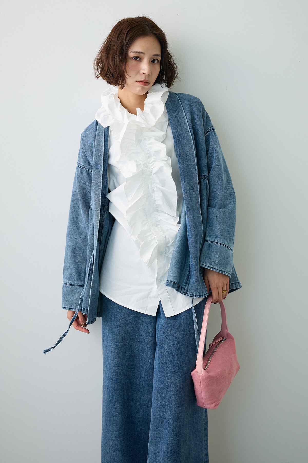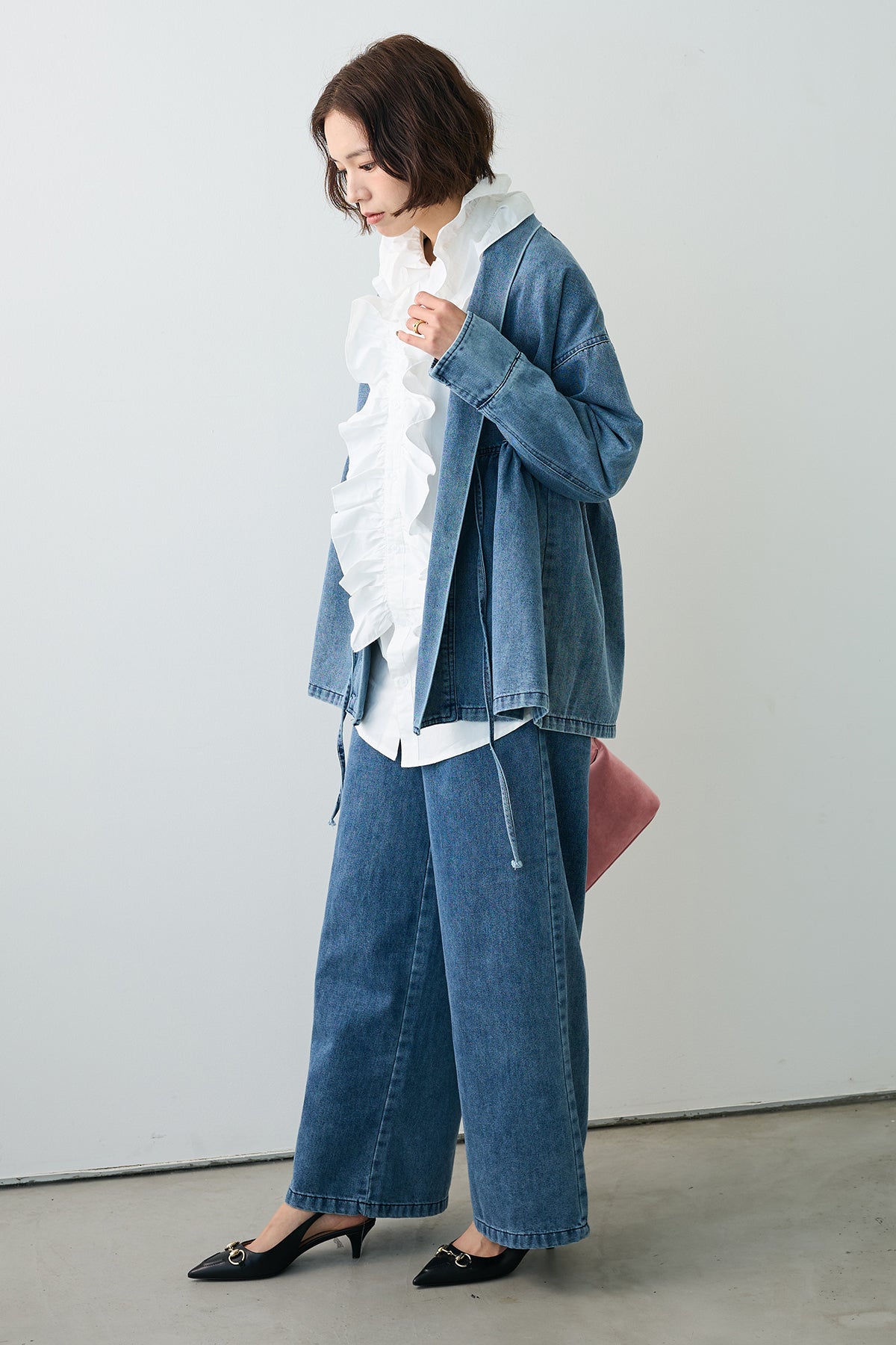 [予約/SET]ブルームカラーフリルブラウス+ノーカラーデニムルーズセットアップ(2set)