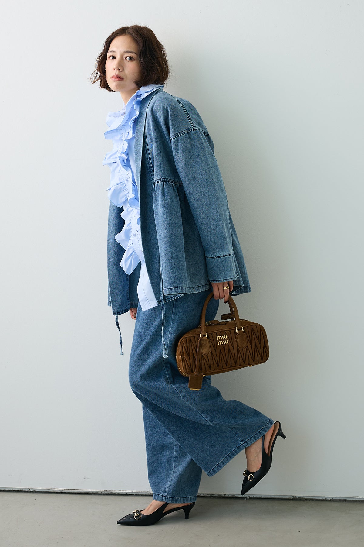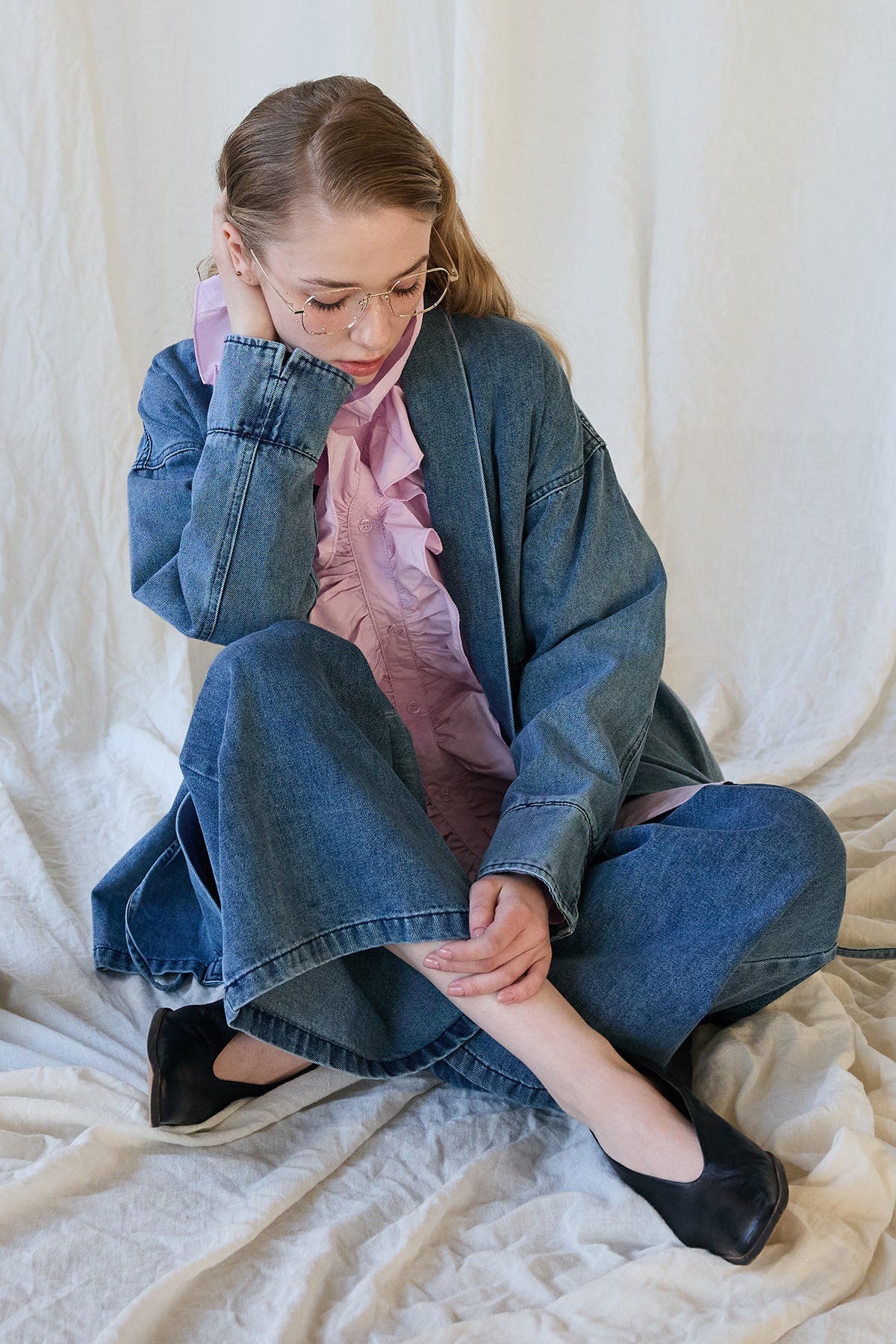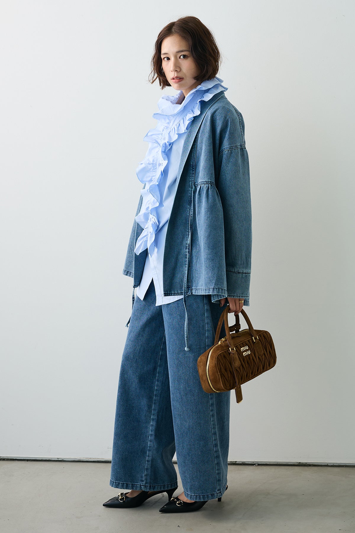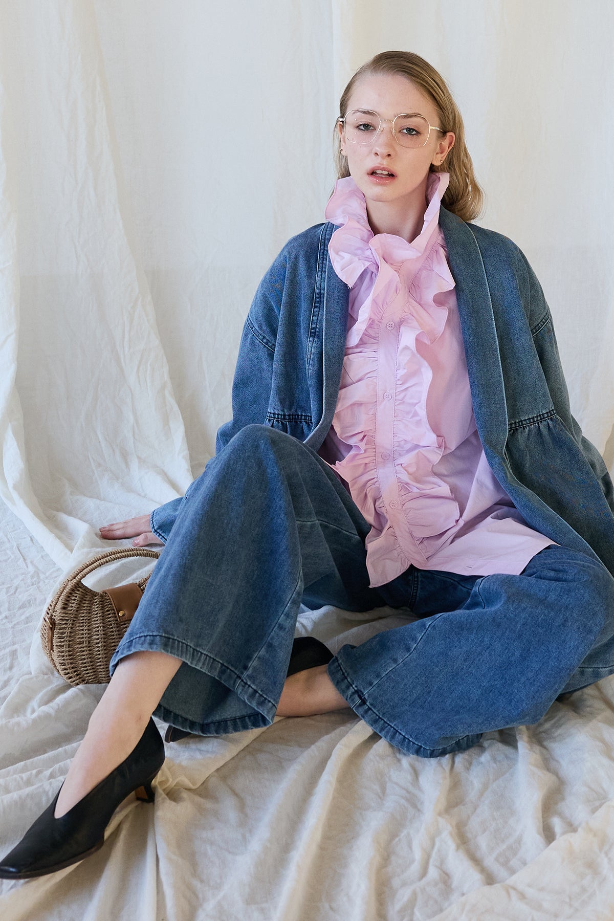 [予約/SET]ブルームカラーフリルブラウス+ノーカラーデニムルーズセットアップ(2set)