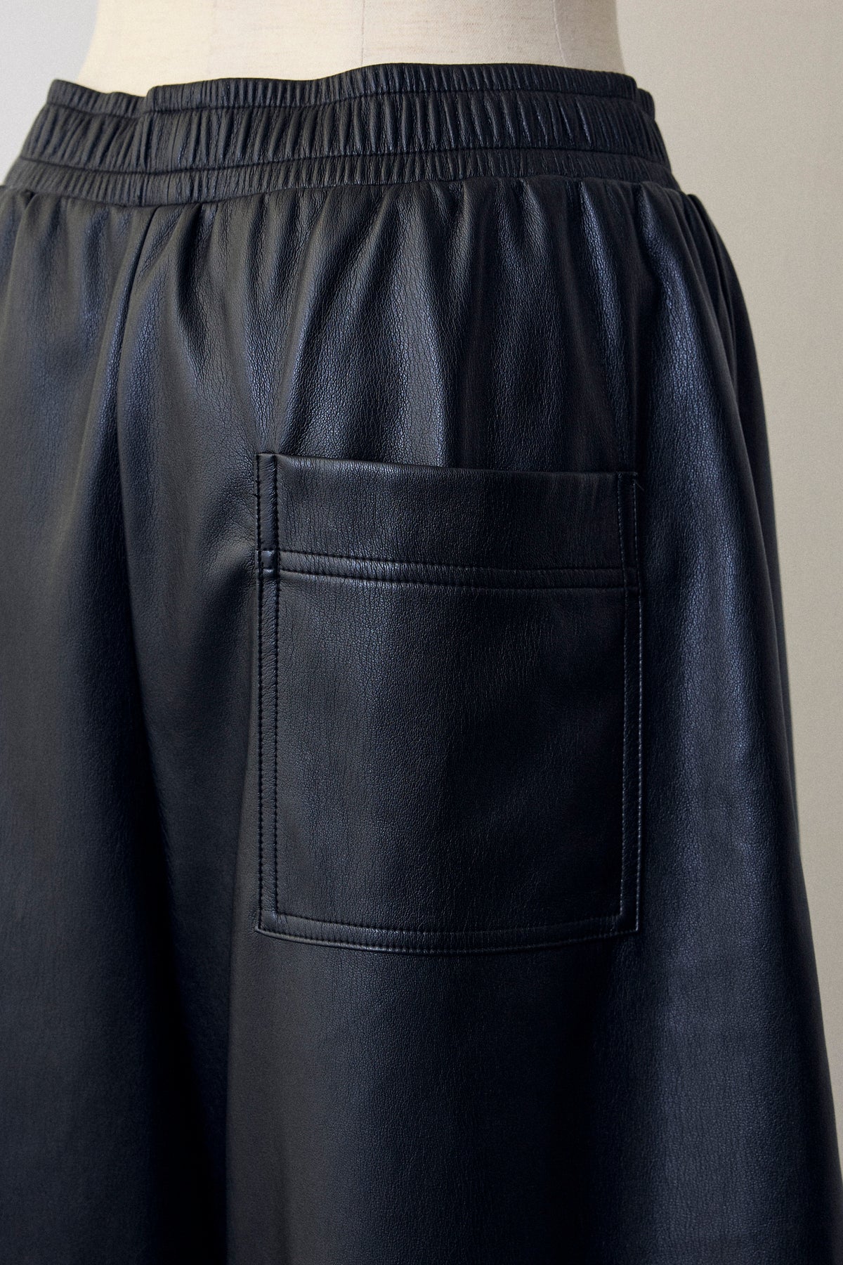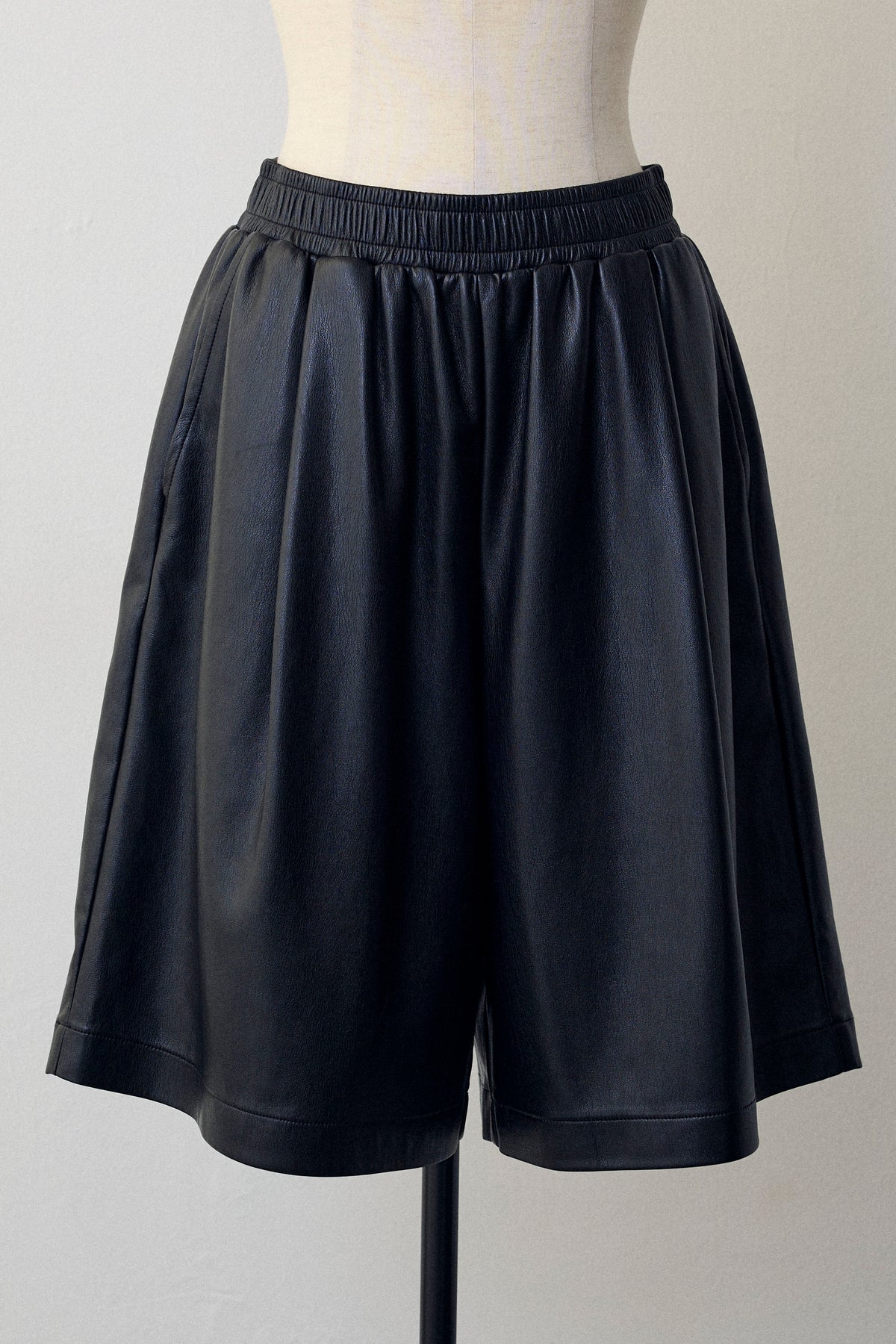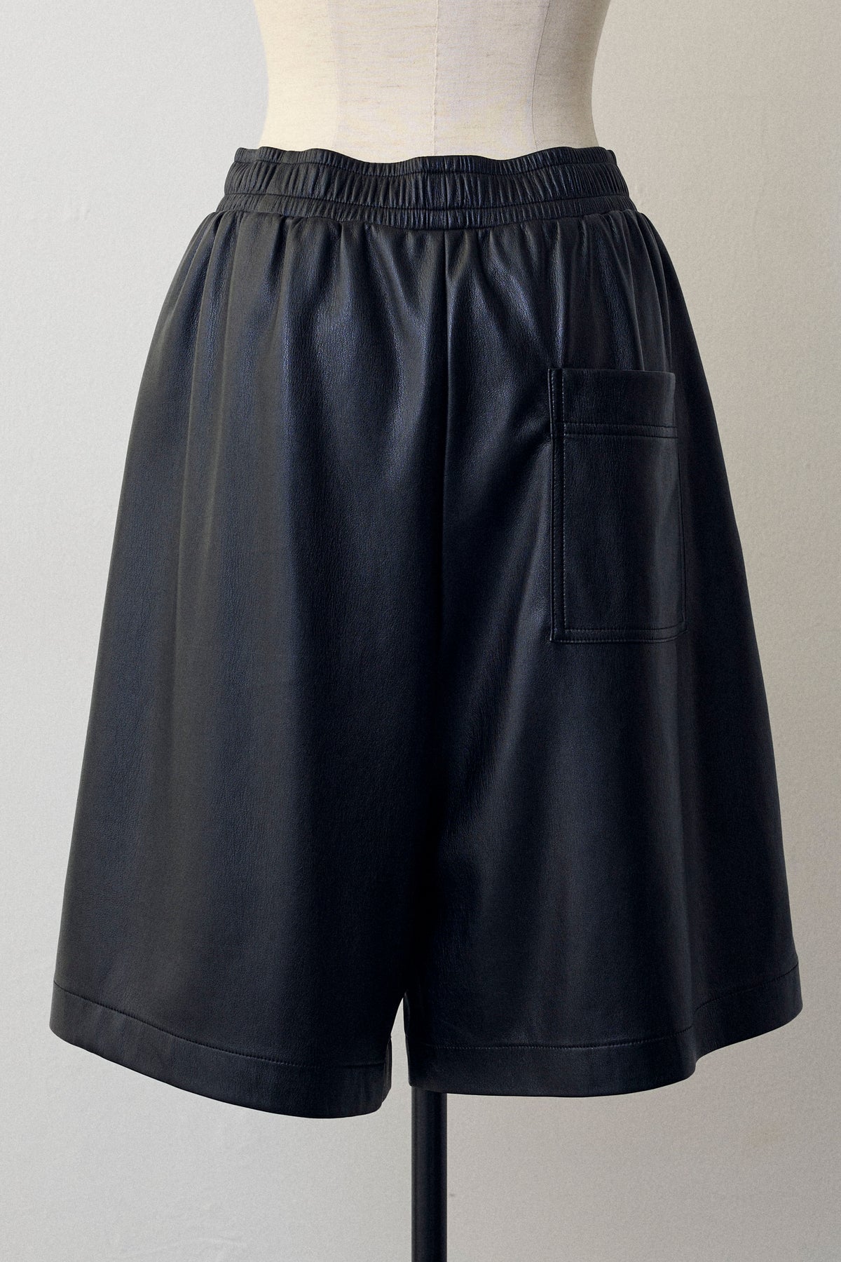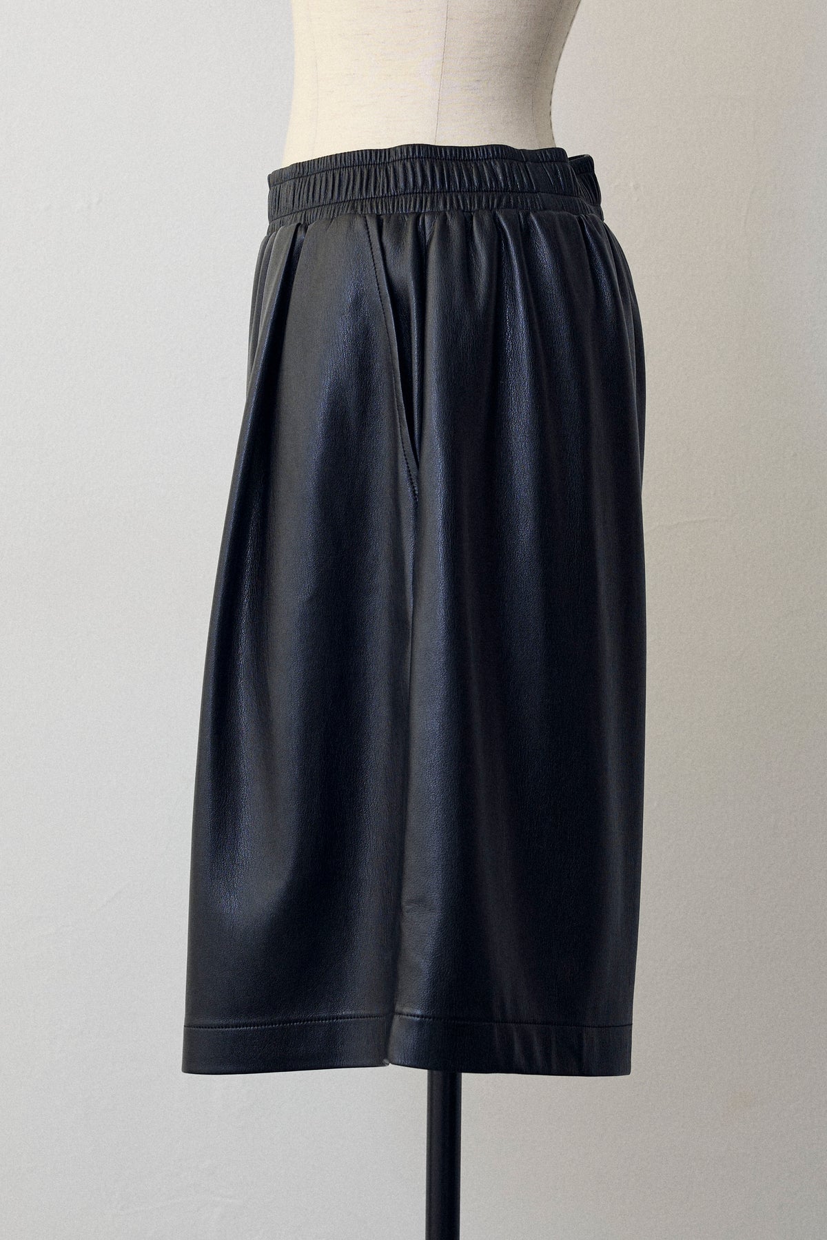 柔らかな風合いと程よいツヤ感が魅力のレザーライク素材で仕上げたハーフパンツ。広がりすぎないフレアシルエットが大人の上品さを保ちながら、コーディネートにモードなエッセンスを添えてくれます。ウエストは総ゴム仕様で着心地も快適。タイツを合わせれば季節を問わず楽しめ、フェミニンなニットとも相性抜群です。シンプルながら存在感のある一枚が、日常のスタイリングをさりげなくアップデートしてくれます。