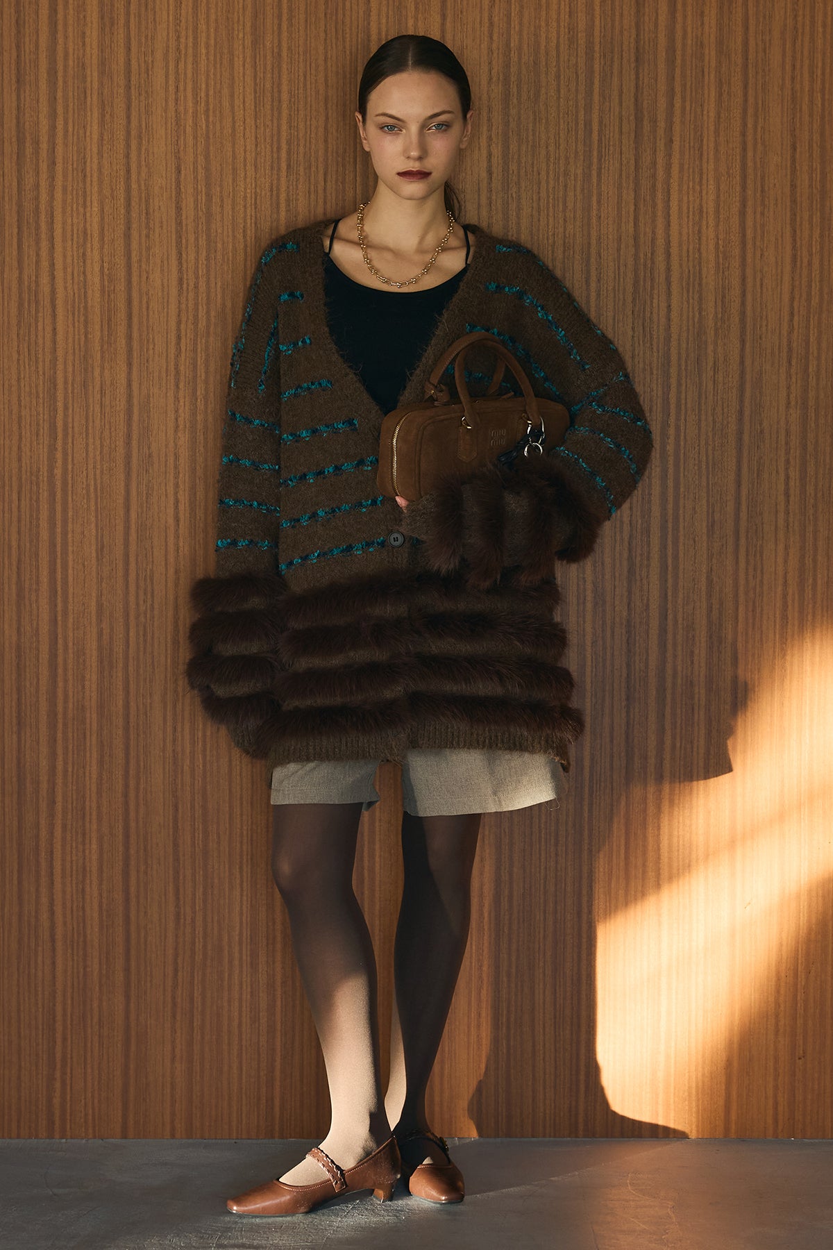 [予約/SET]フェザーライン配色シャギーニットカーディガン+ウールタッチセンタープレスハーフパンツ(2set)
