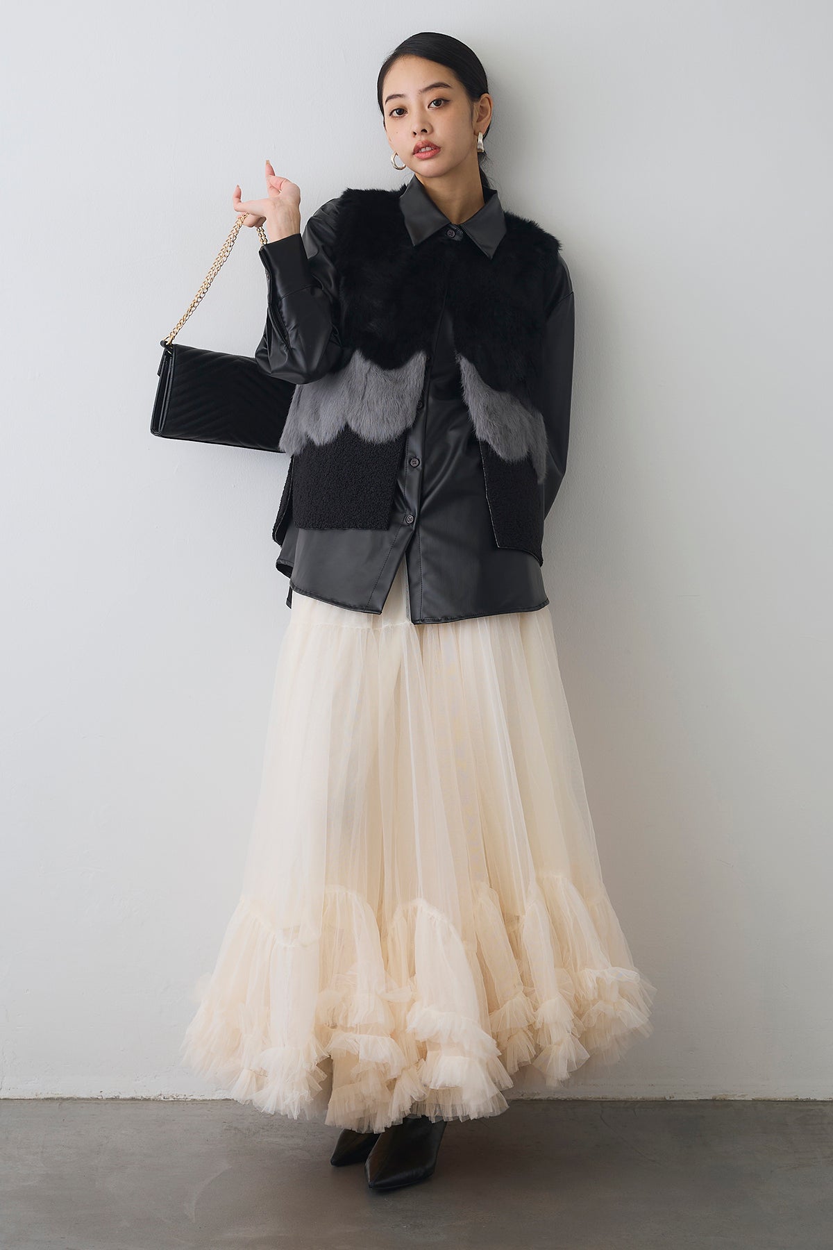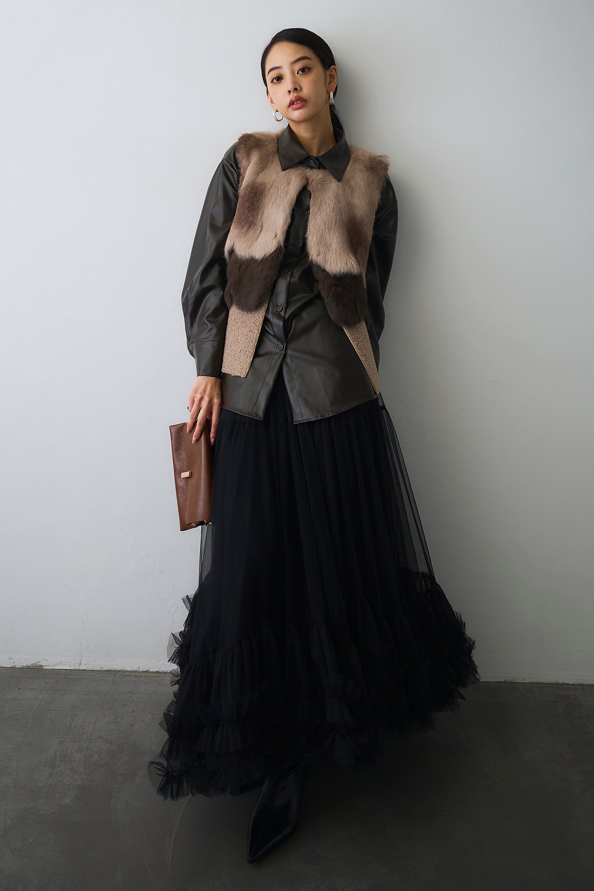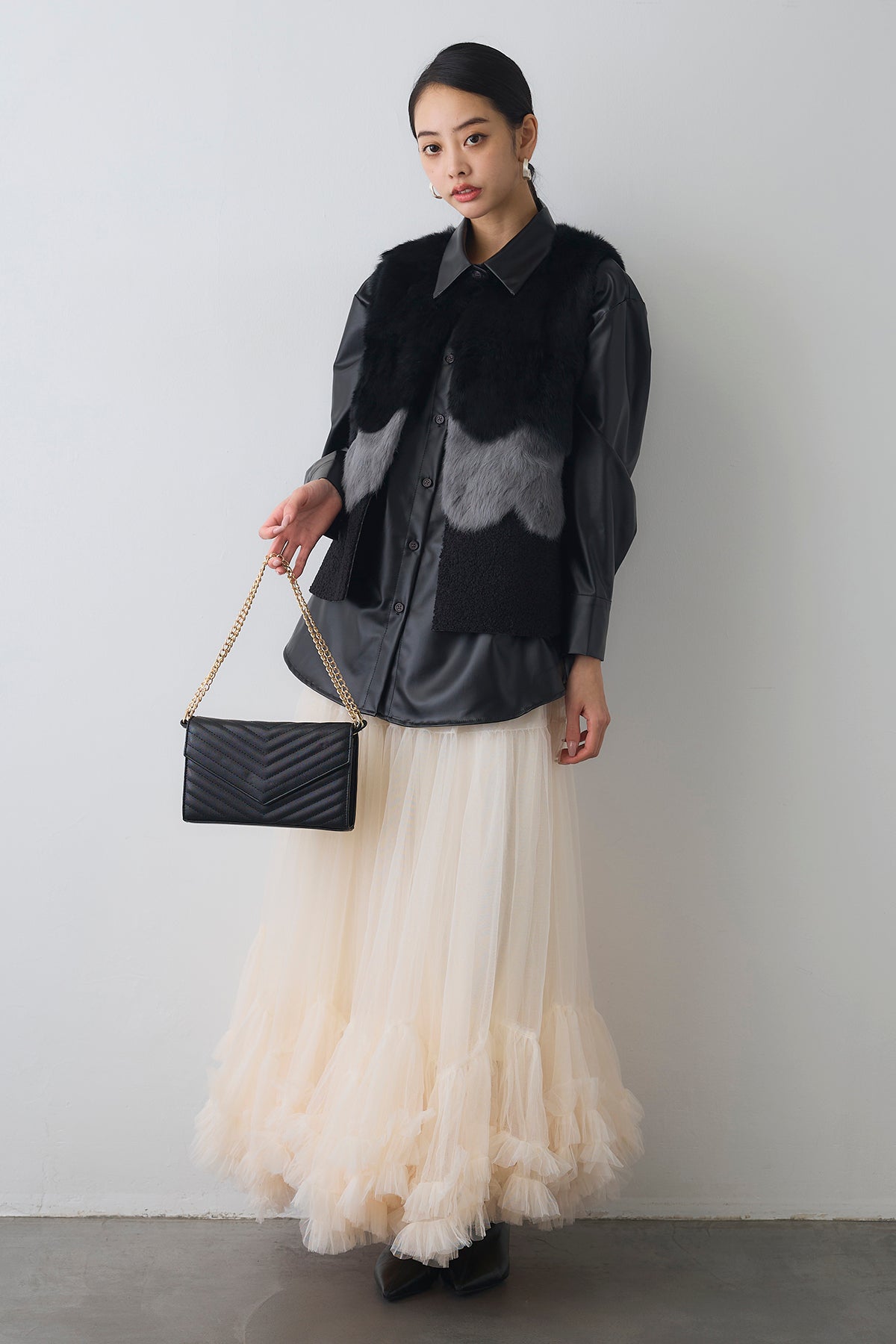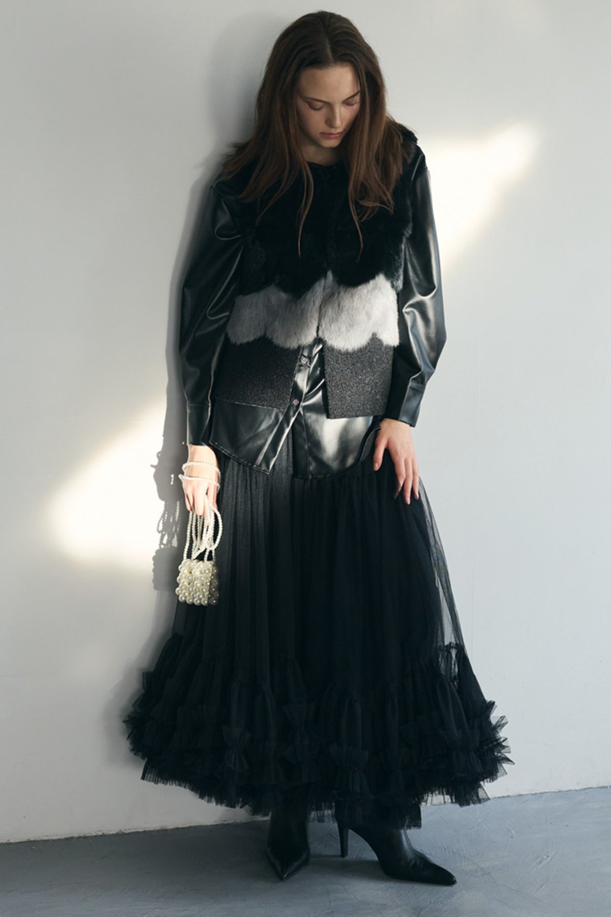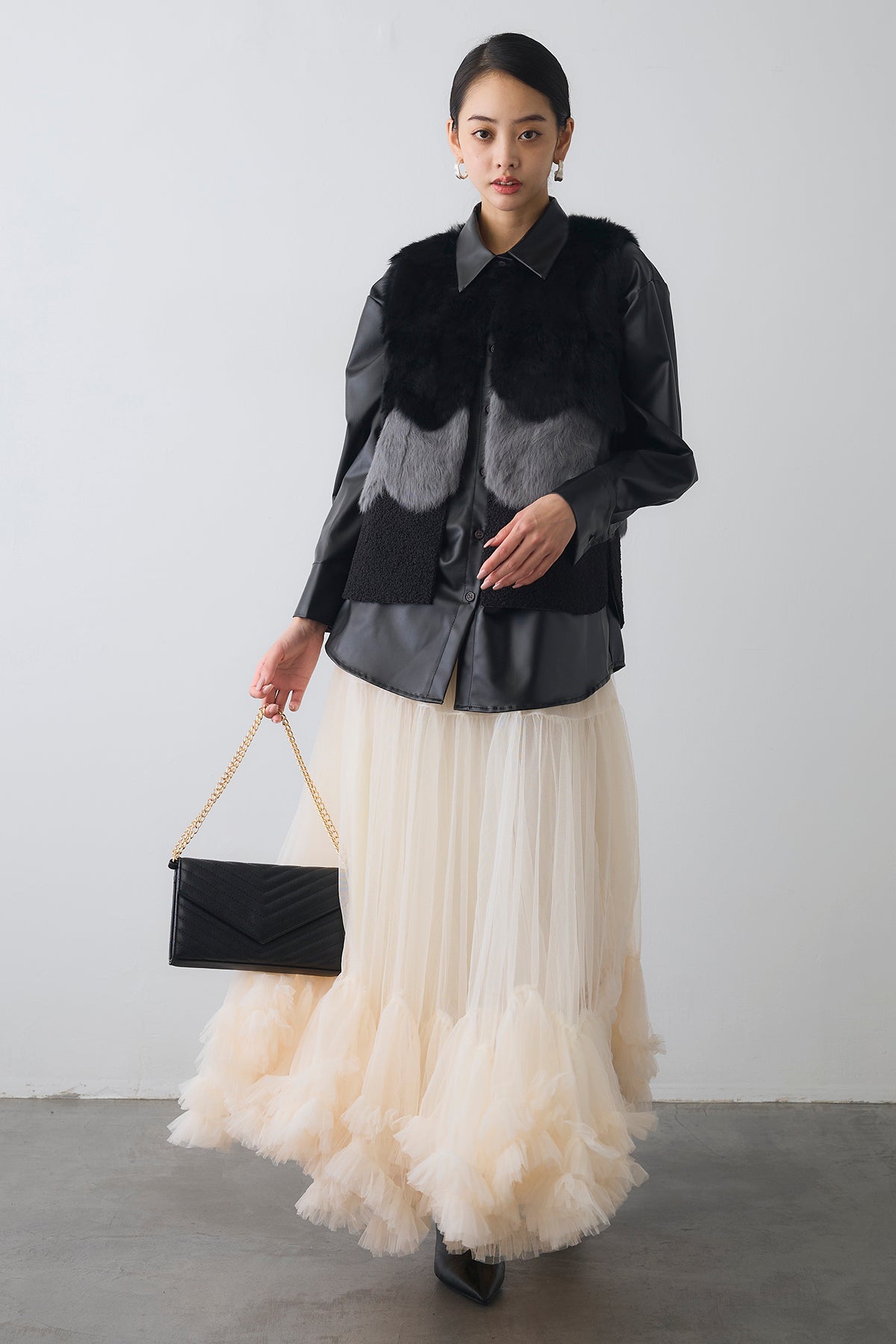 [予約/SET]レザーライクライトシャツ+バイカラースカラップフェイクファーベスト+スウィートチュールフリルスカート(3set)