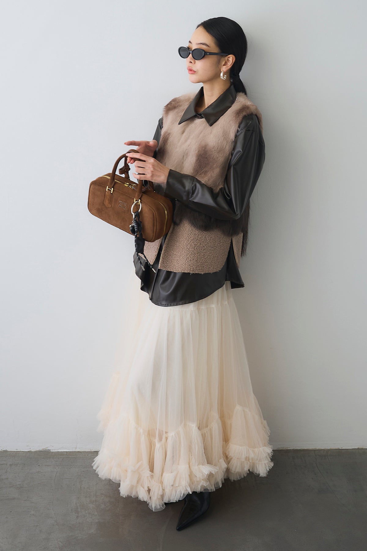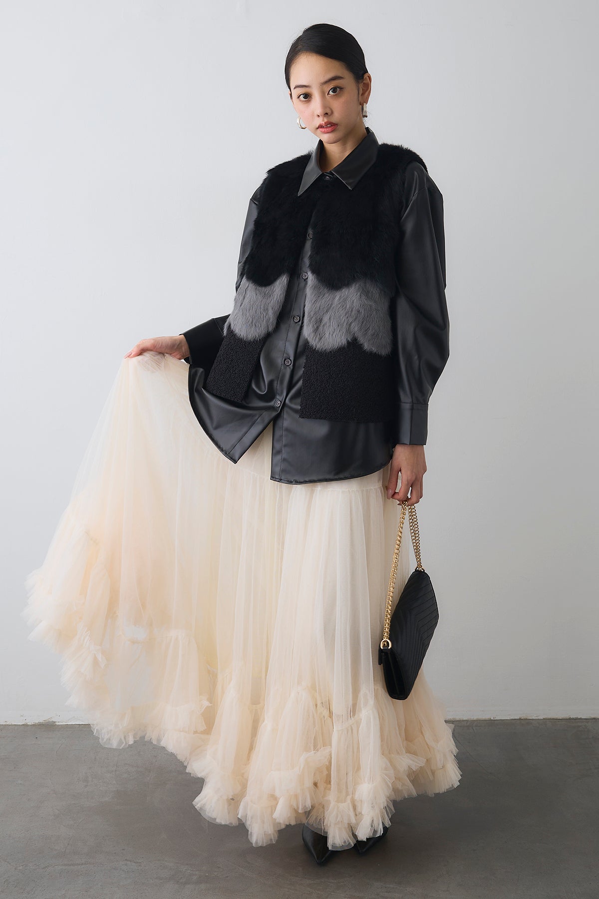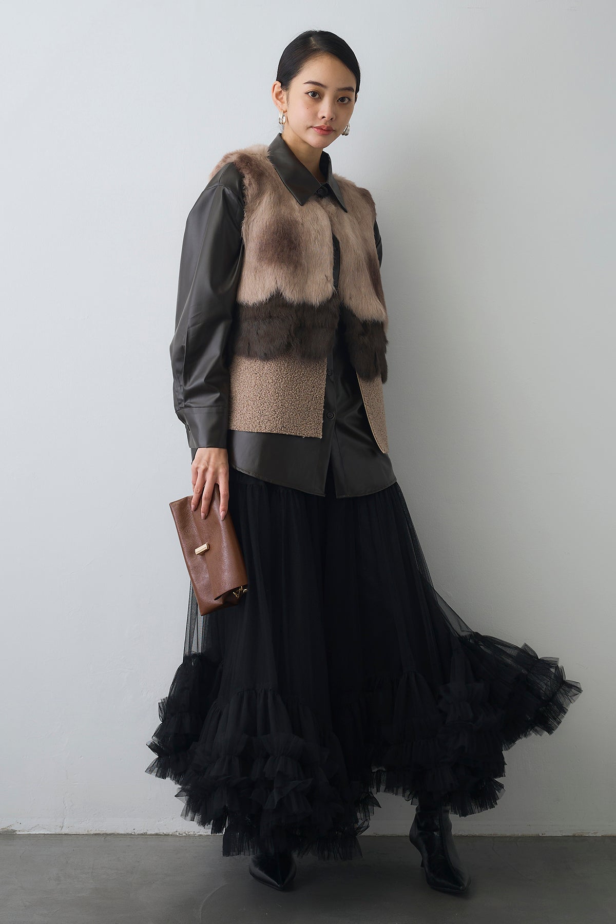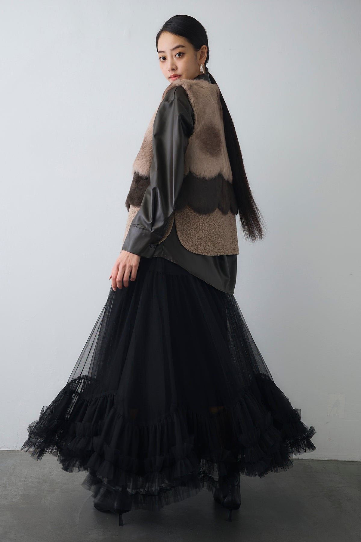 [予約/SET]レザーライクライトシャツ+バイカラースカラップフェイクファーベスト+スウィートチュールフリルスカート(3set)