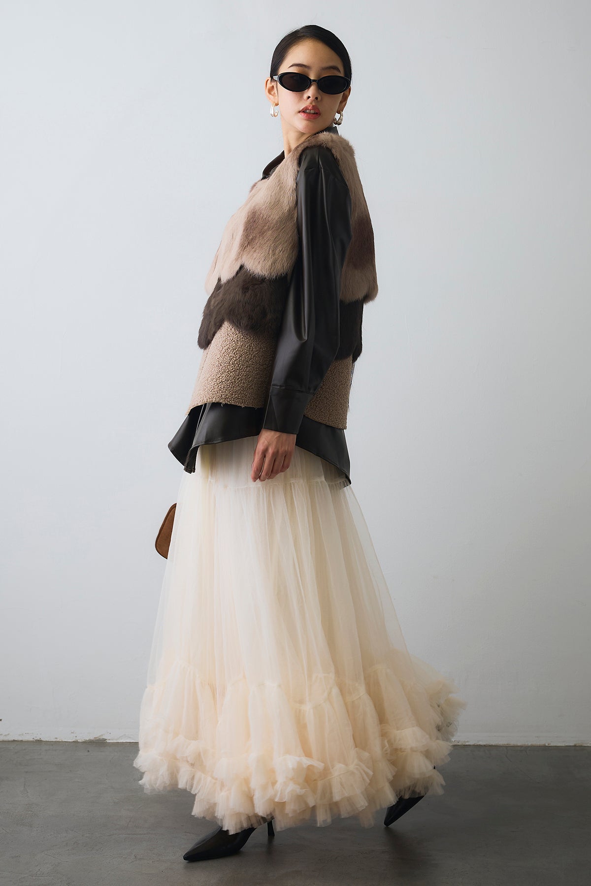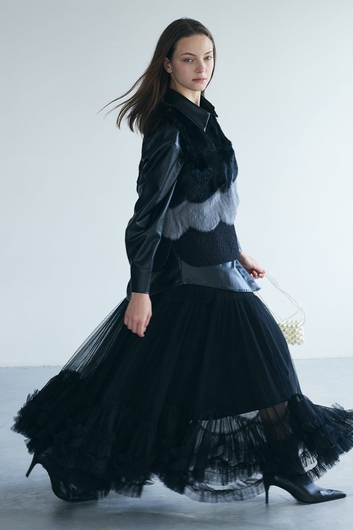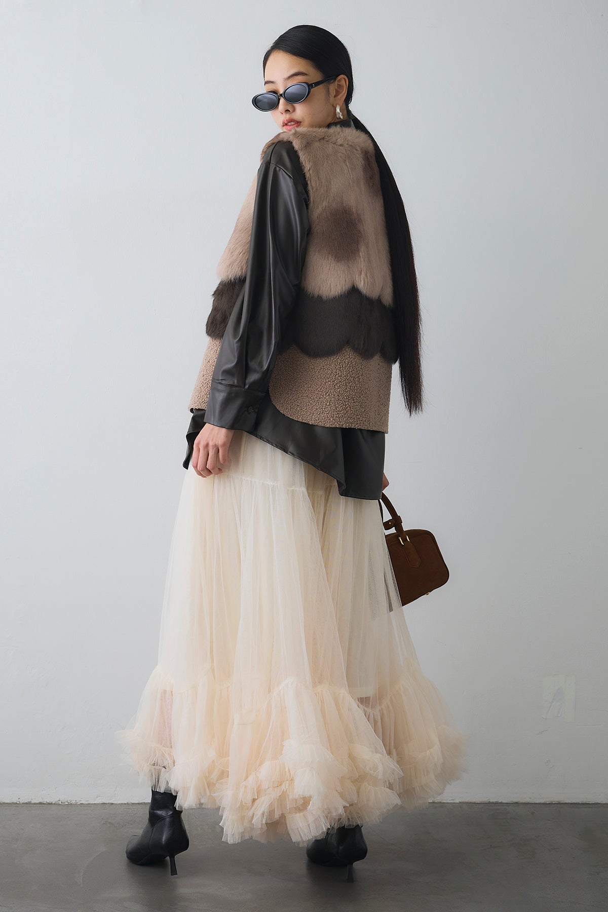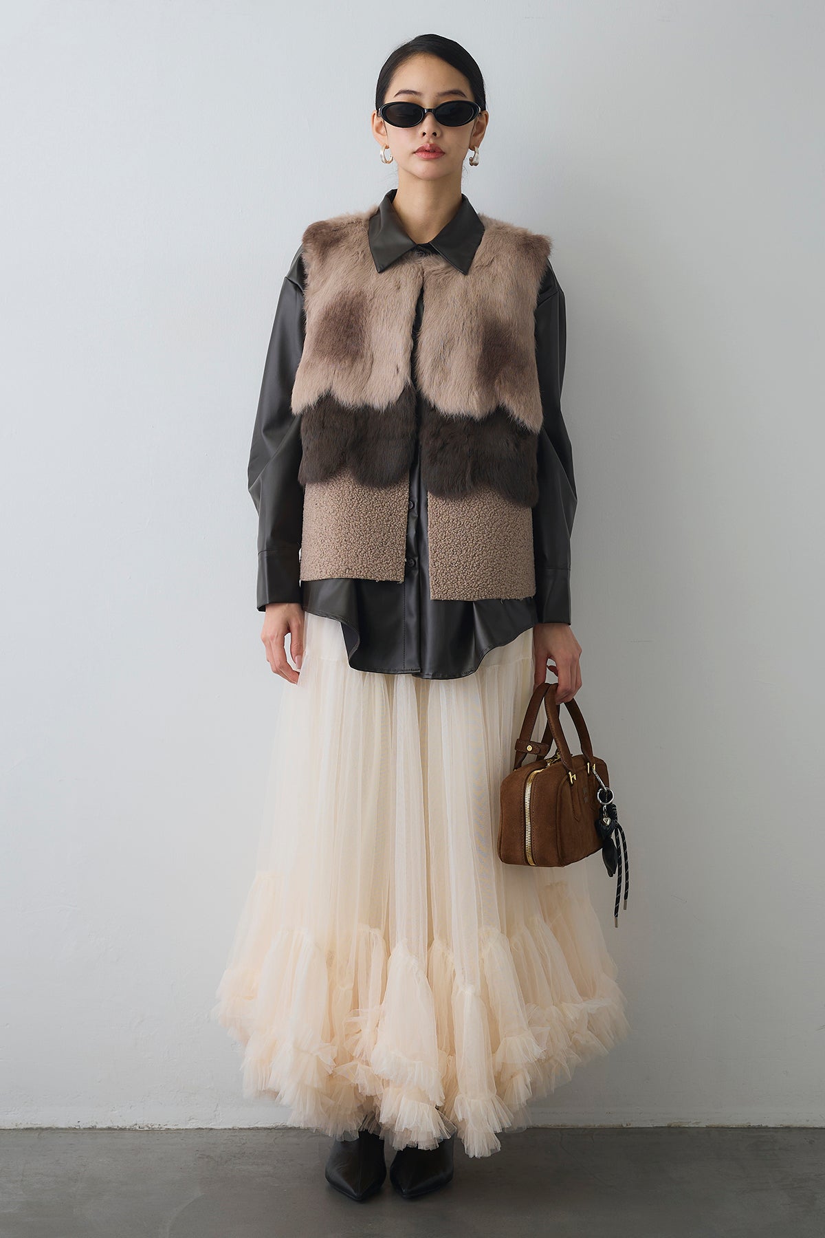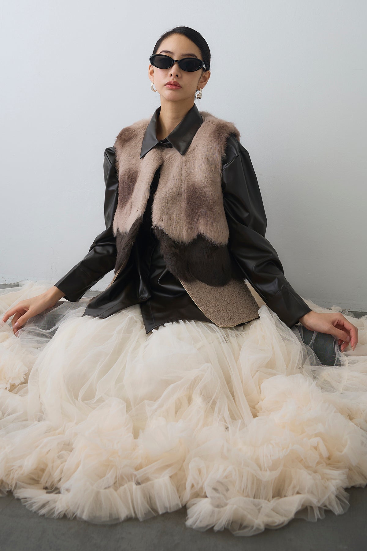 [予約/SET]レザーライクライトシャツ+バイカラースカラップフェイクファーベスト+スウィートチュールフリルスカート(3set)