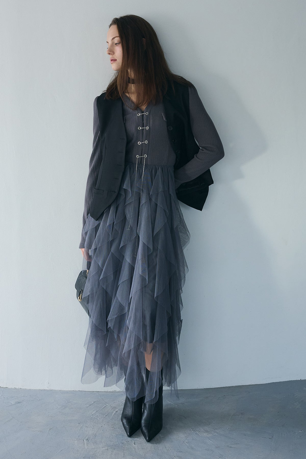 ◆ ニットドッキングポイントチェーンティアードワンピ