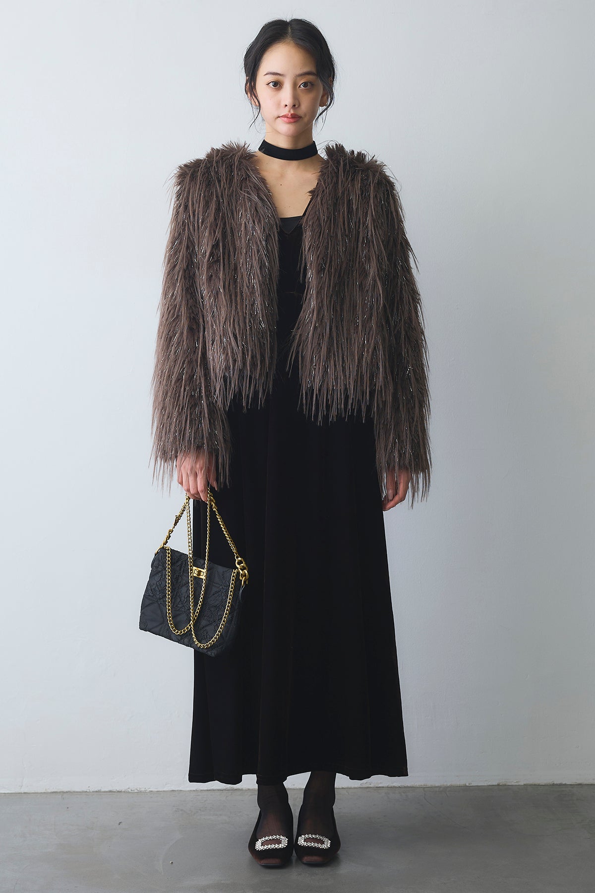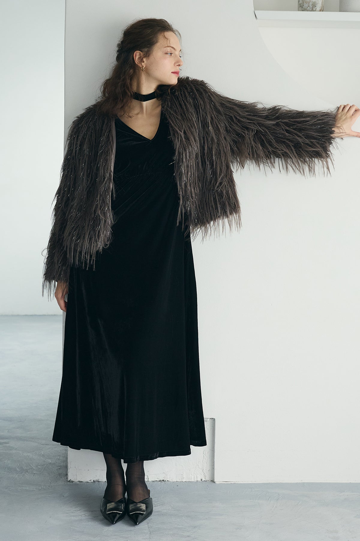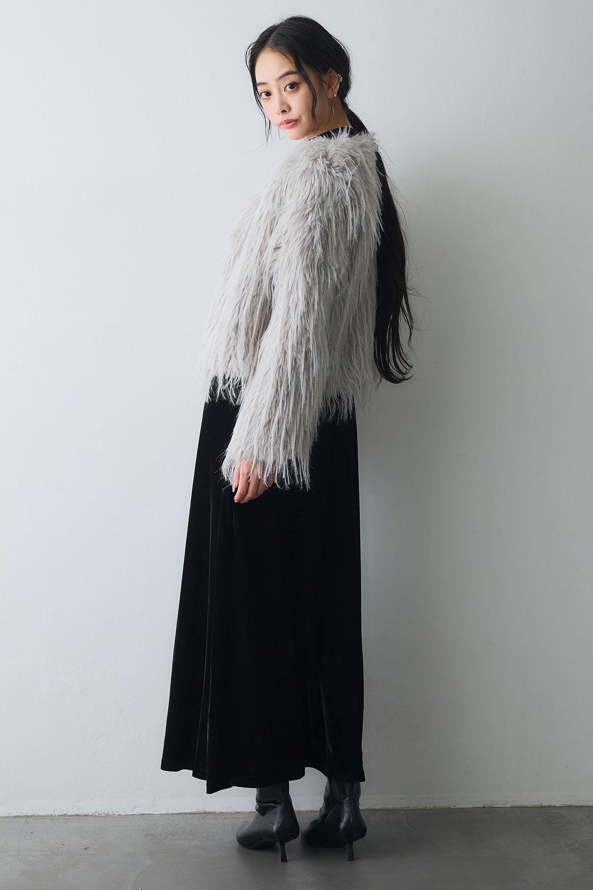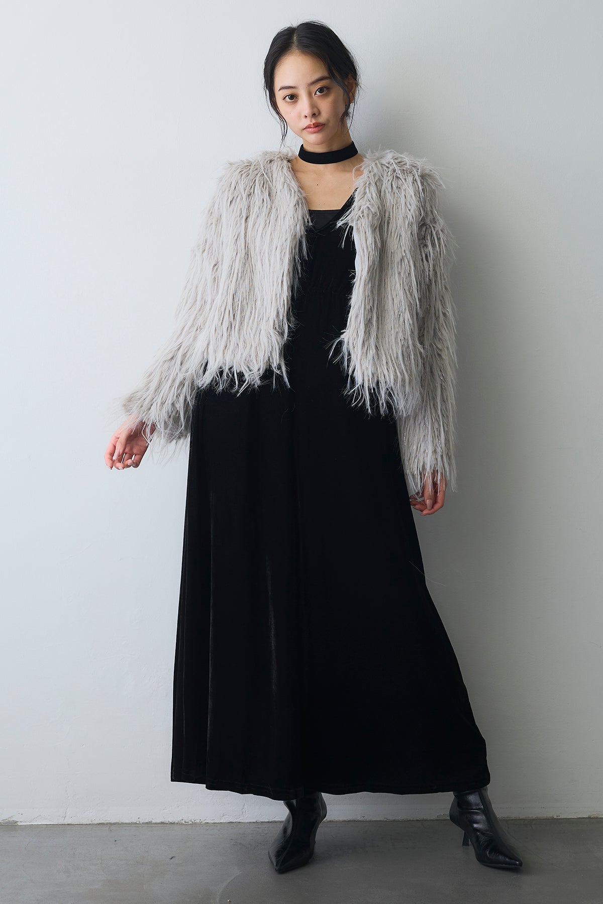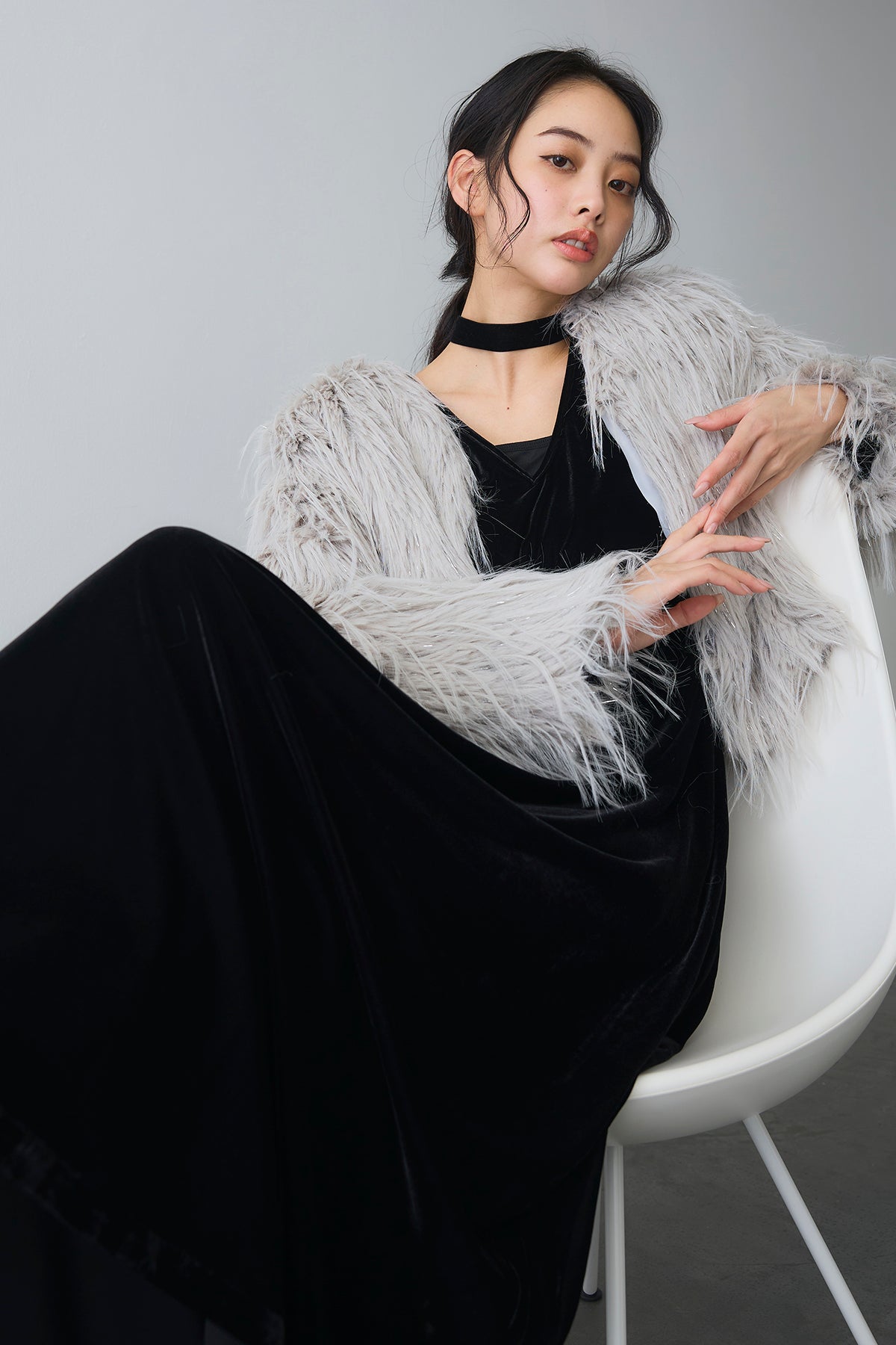 [予約/SET]Vネックベロアロングワンピース+シャイニーロングファーコート(2set)