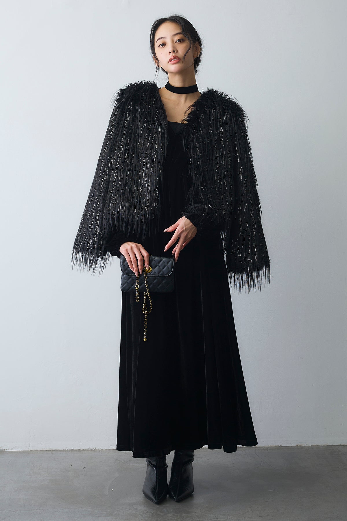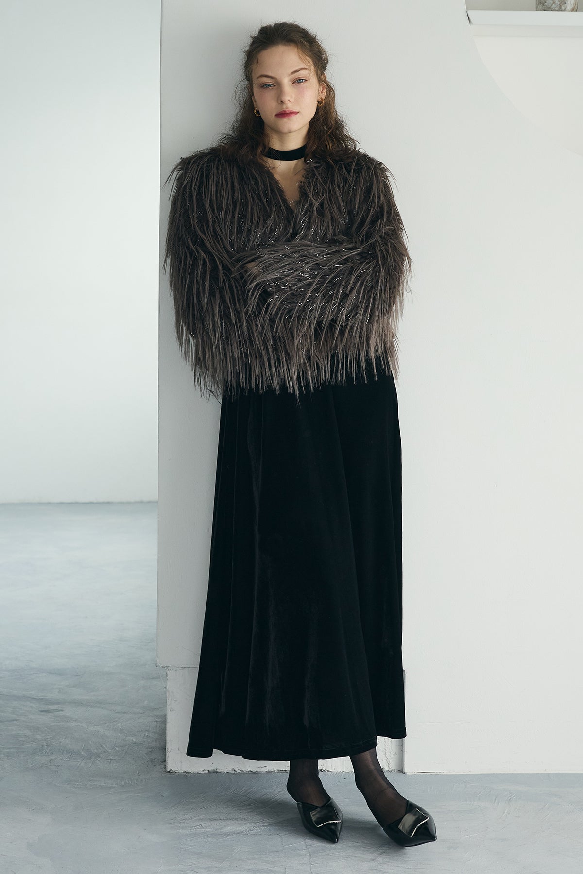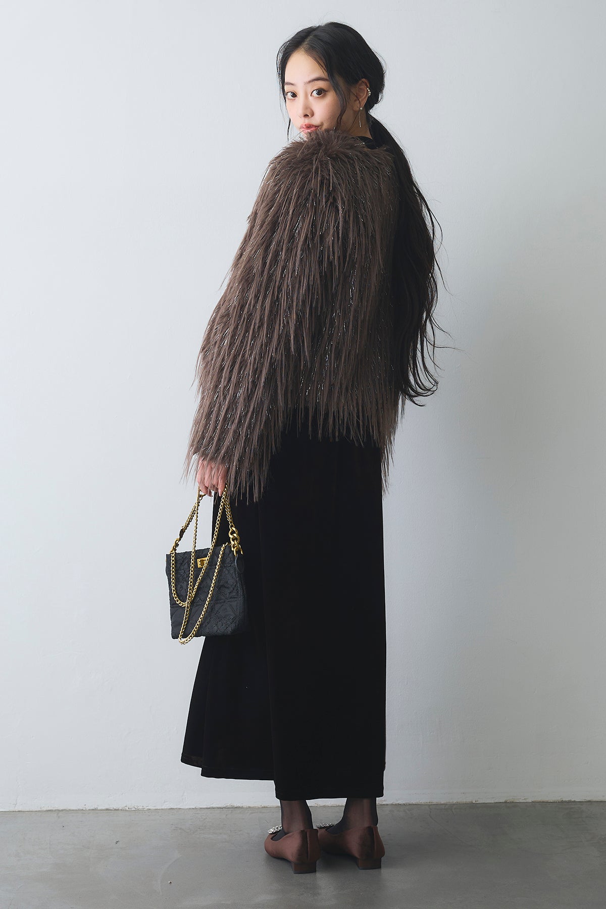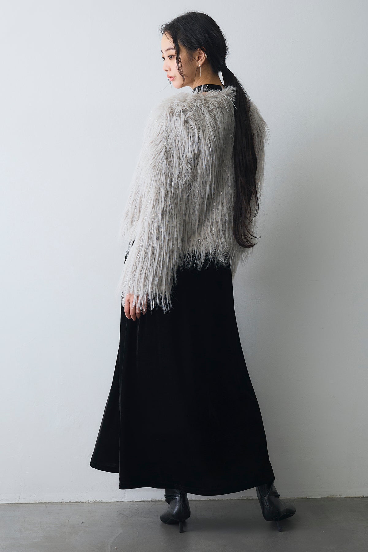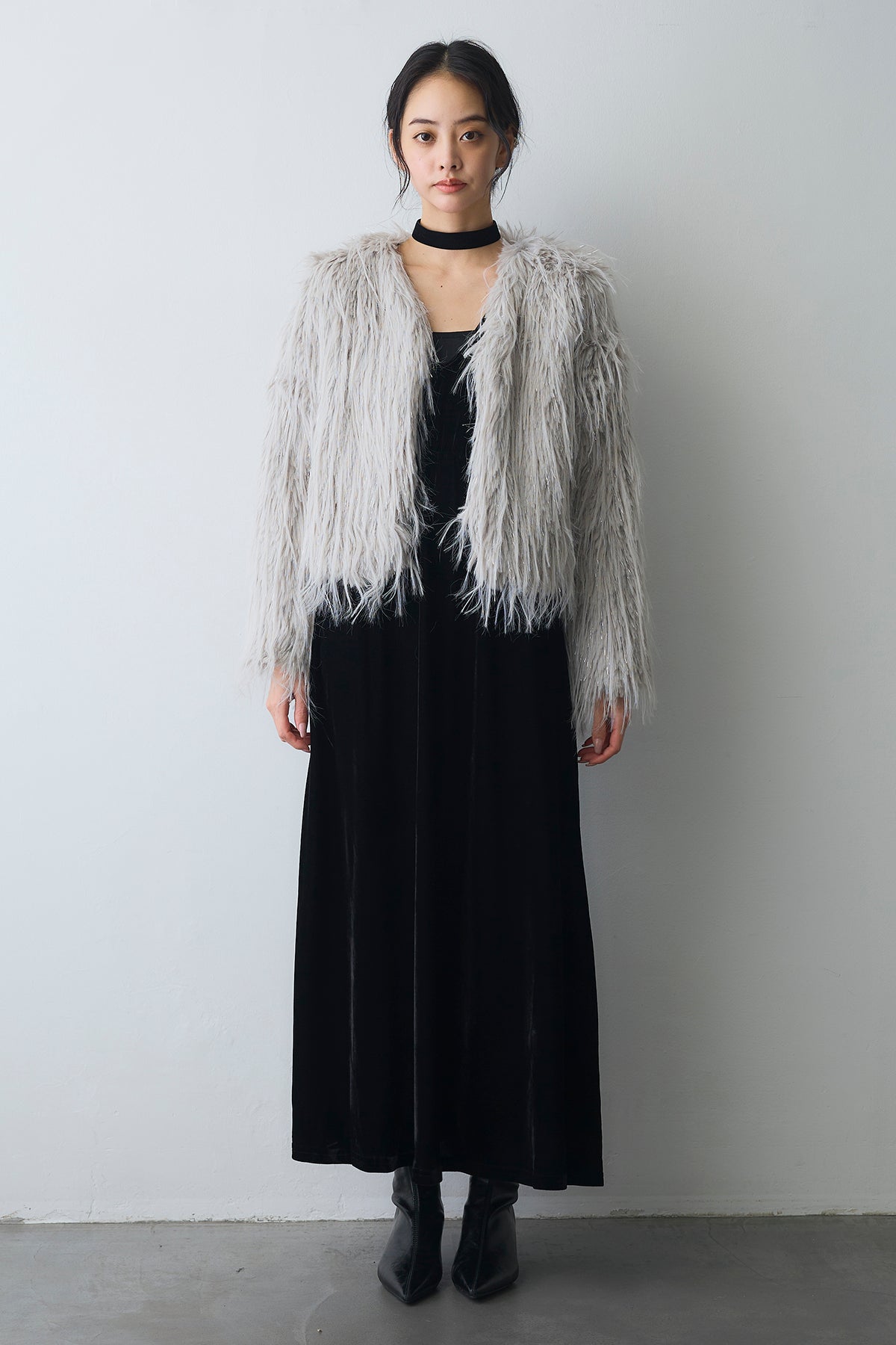 [予約/SET]Vネックベロアロングワンピース+シャイニーロングファーコート(2set)