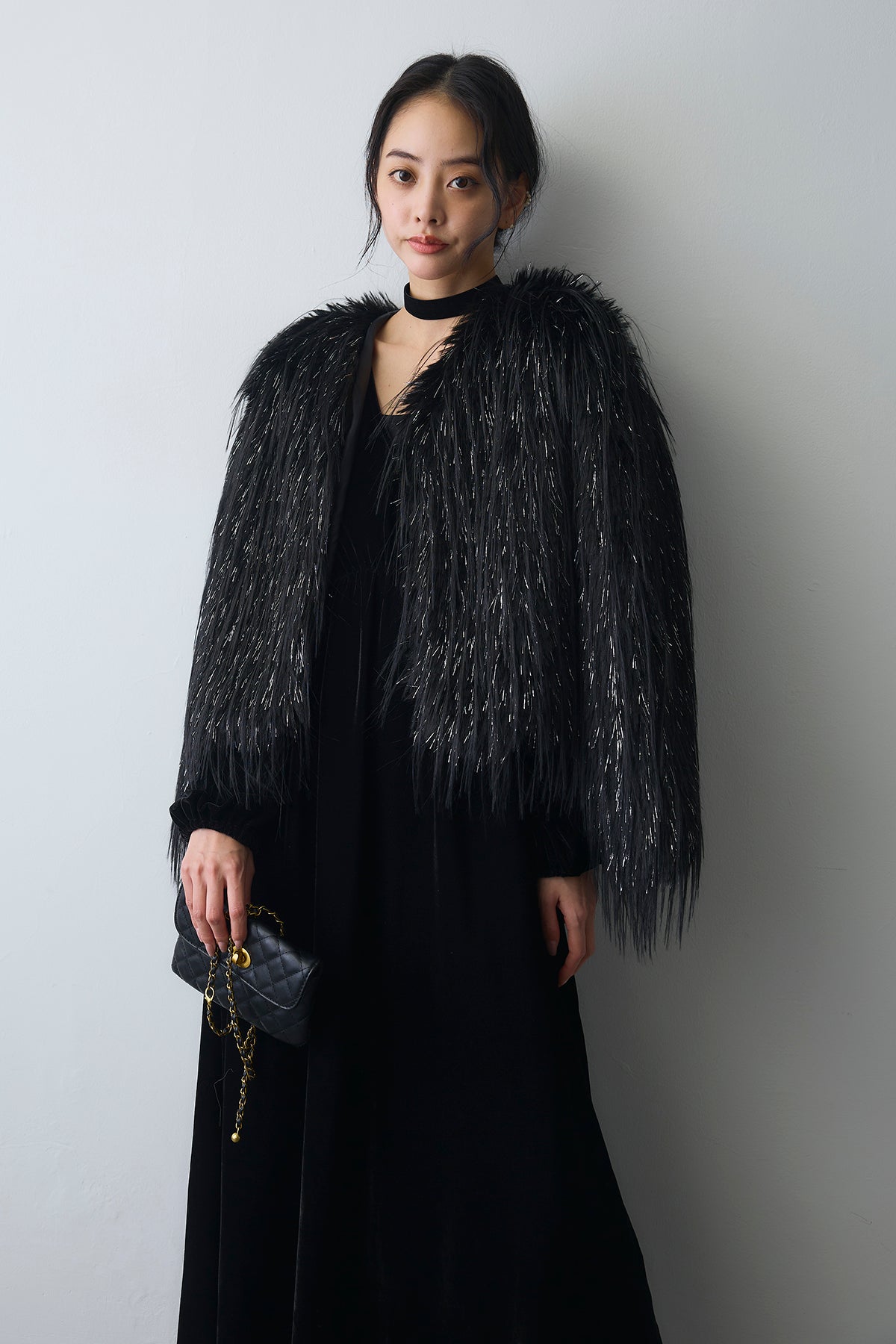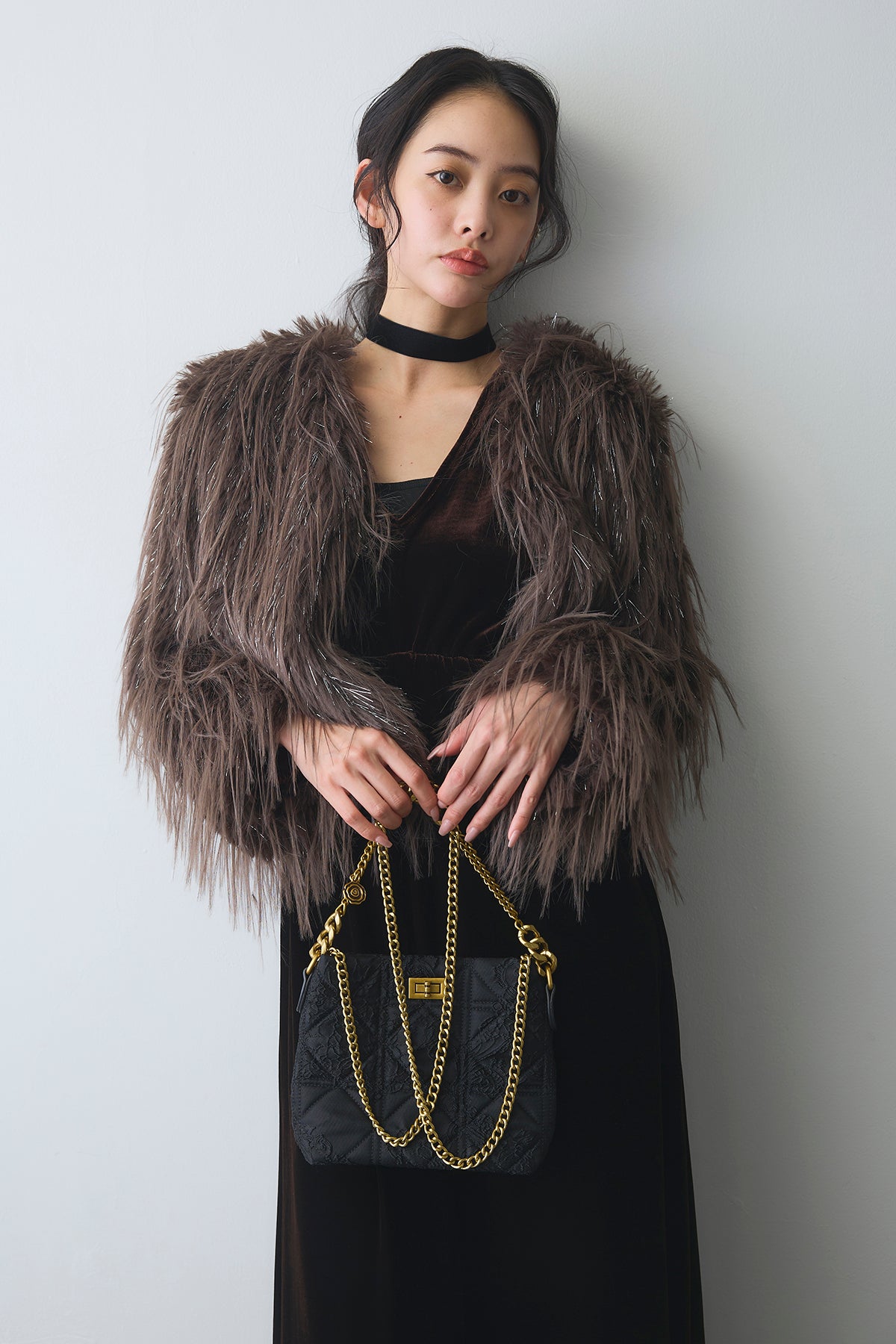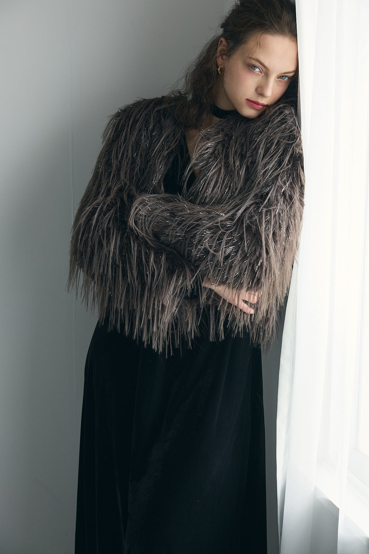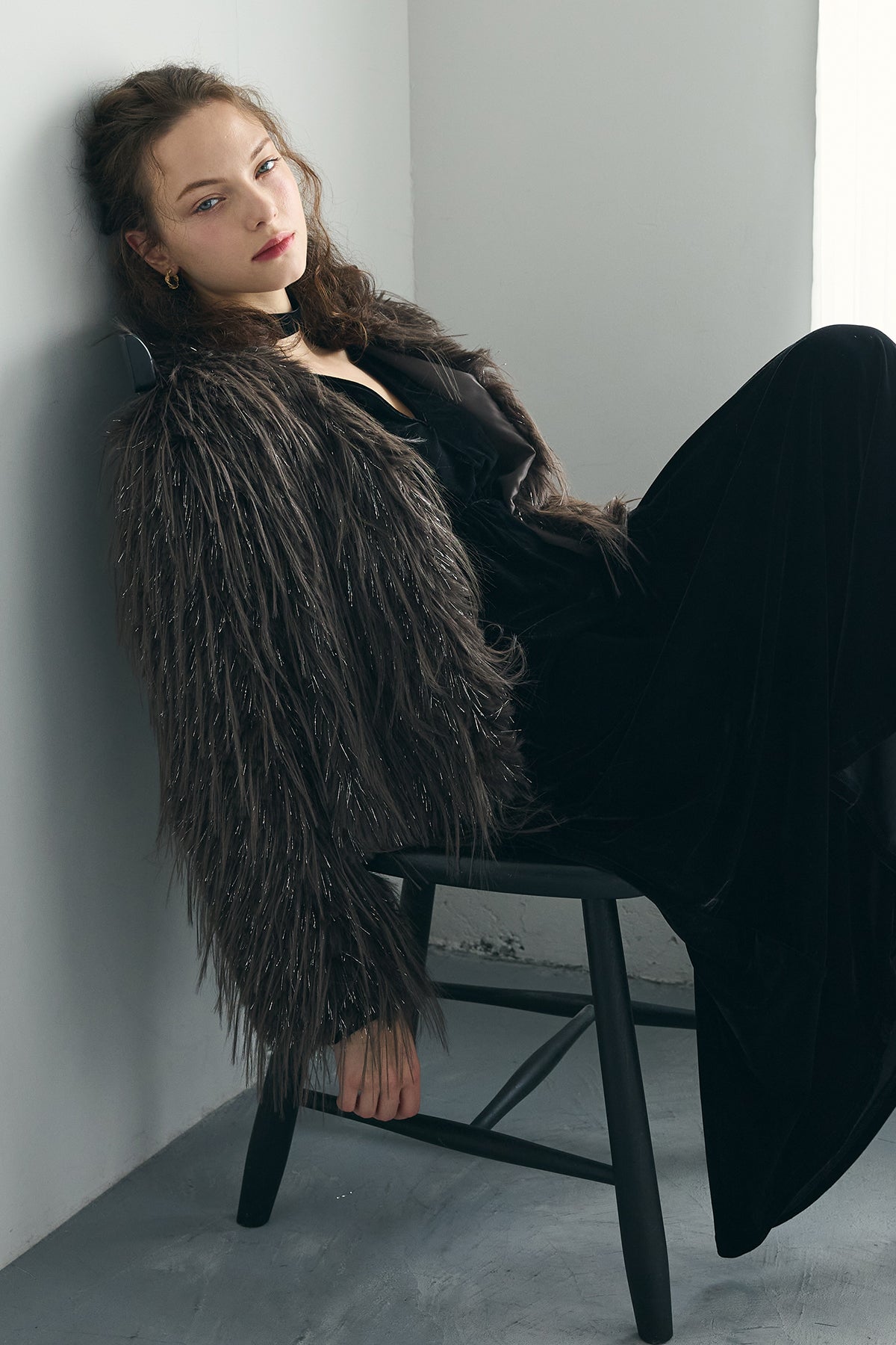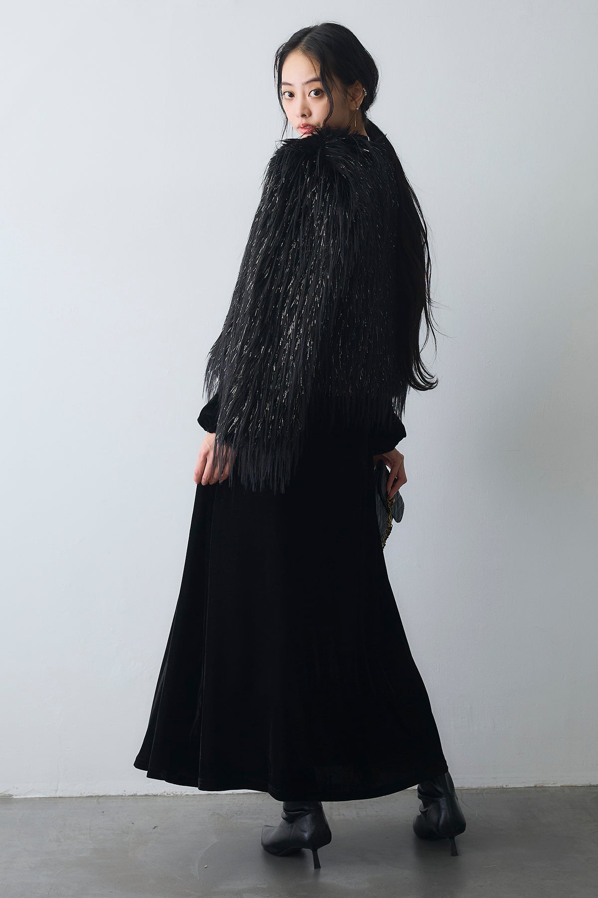 [予約/SET]Vネックベロアロングワンピース+シャイニーロングファーコート(2set)