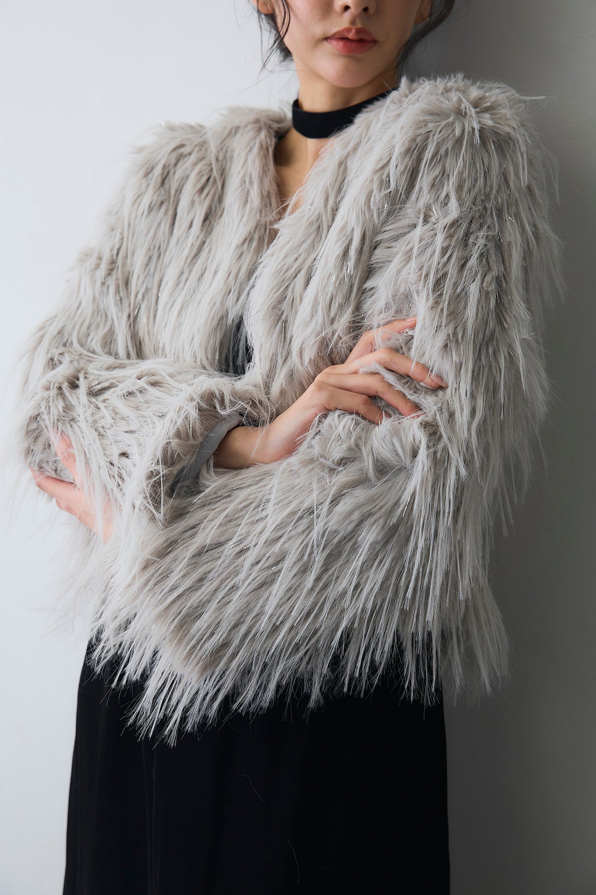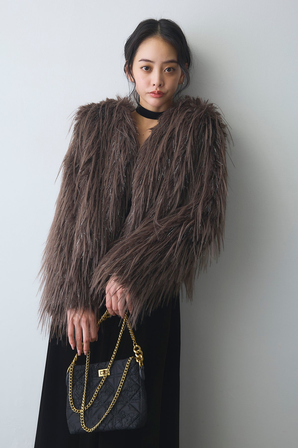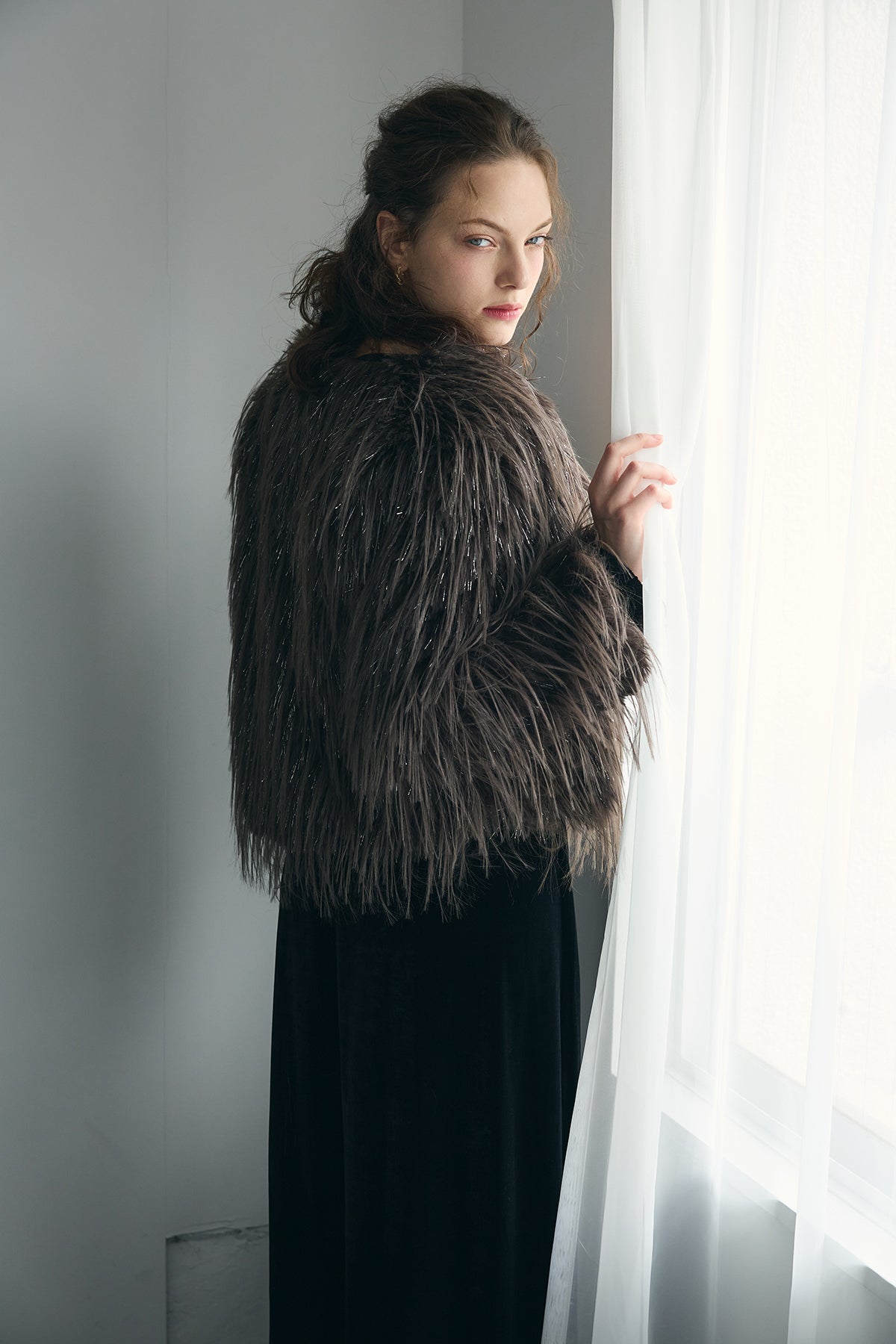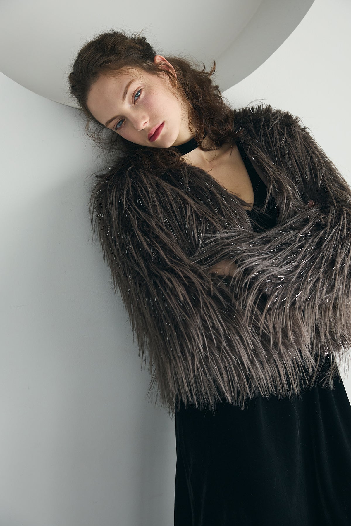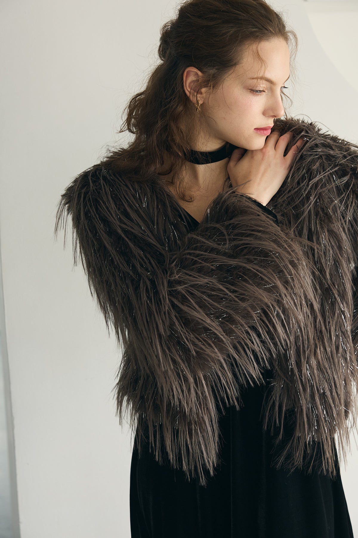 [予約/SET]Vネックベロアロングワンピース+シャイニーロングファーコート(2set)
