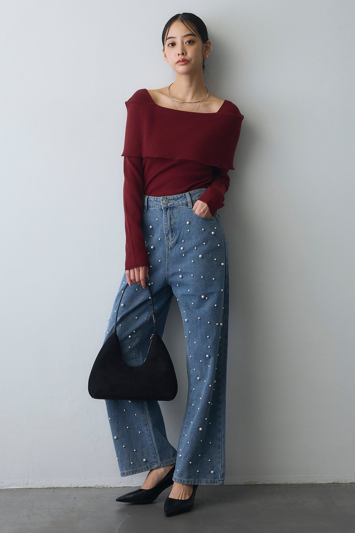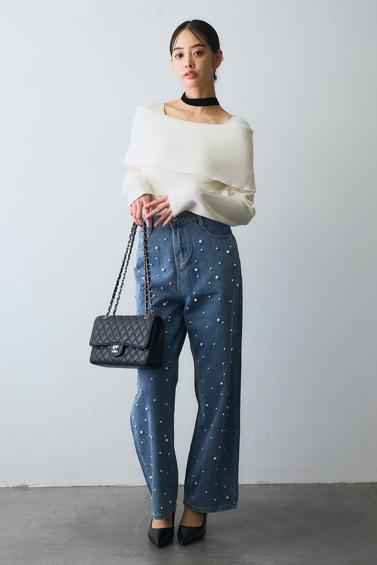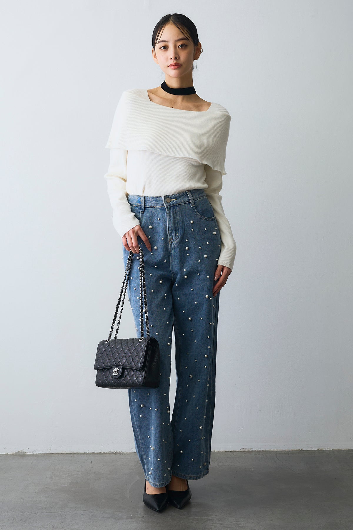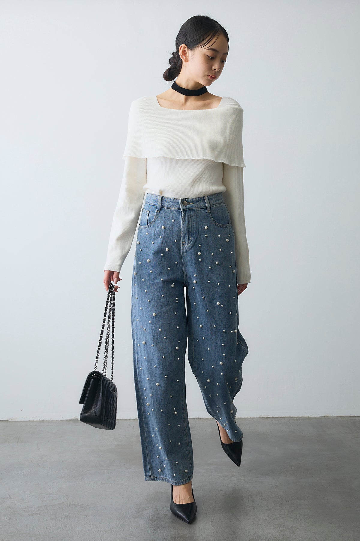 [予約/SET]リブオフショルロングスリーブニット+ランダムパールハイウエストストレートデニム(2set)