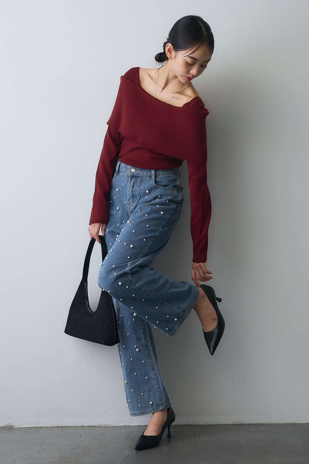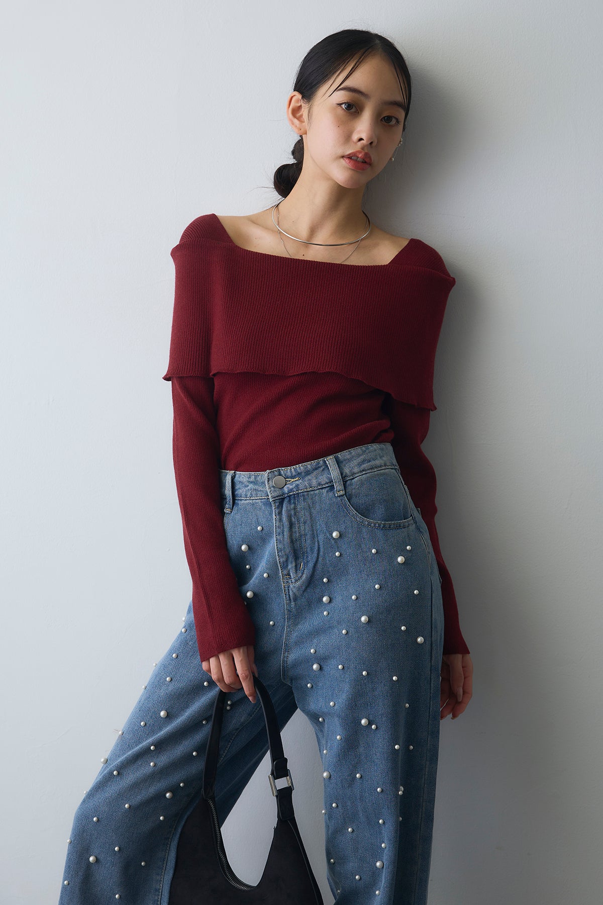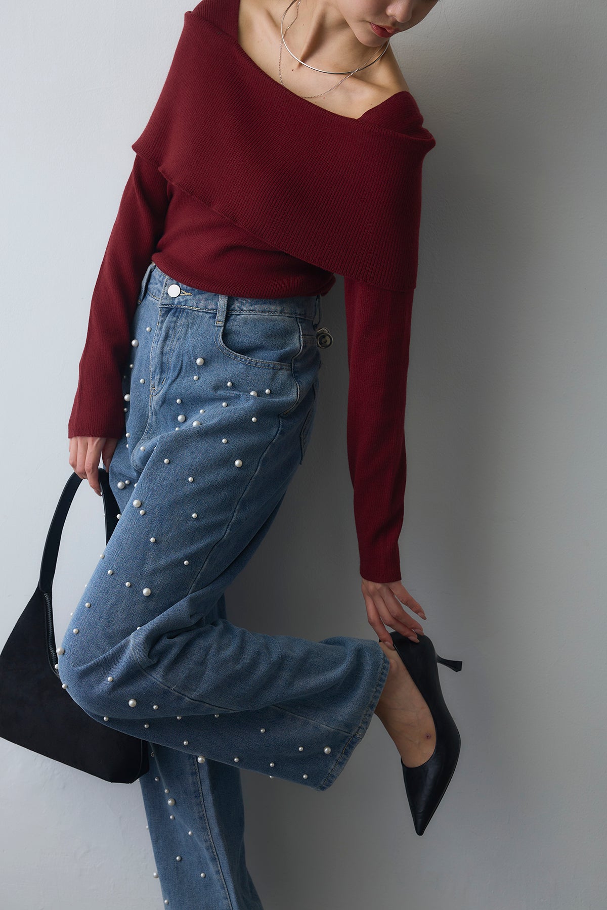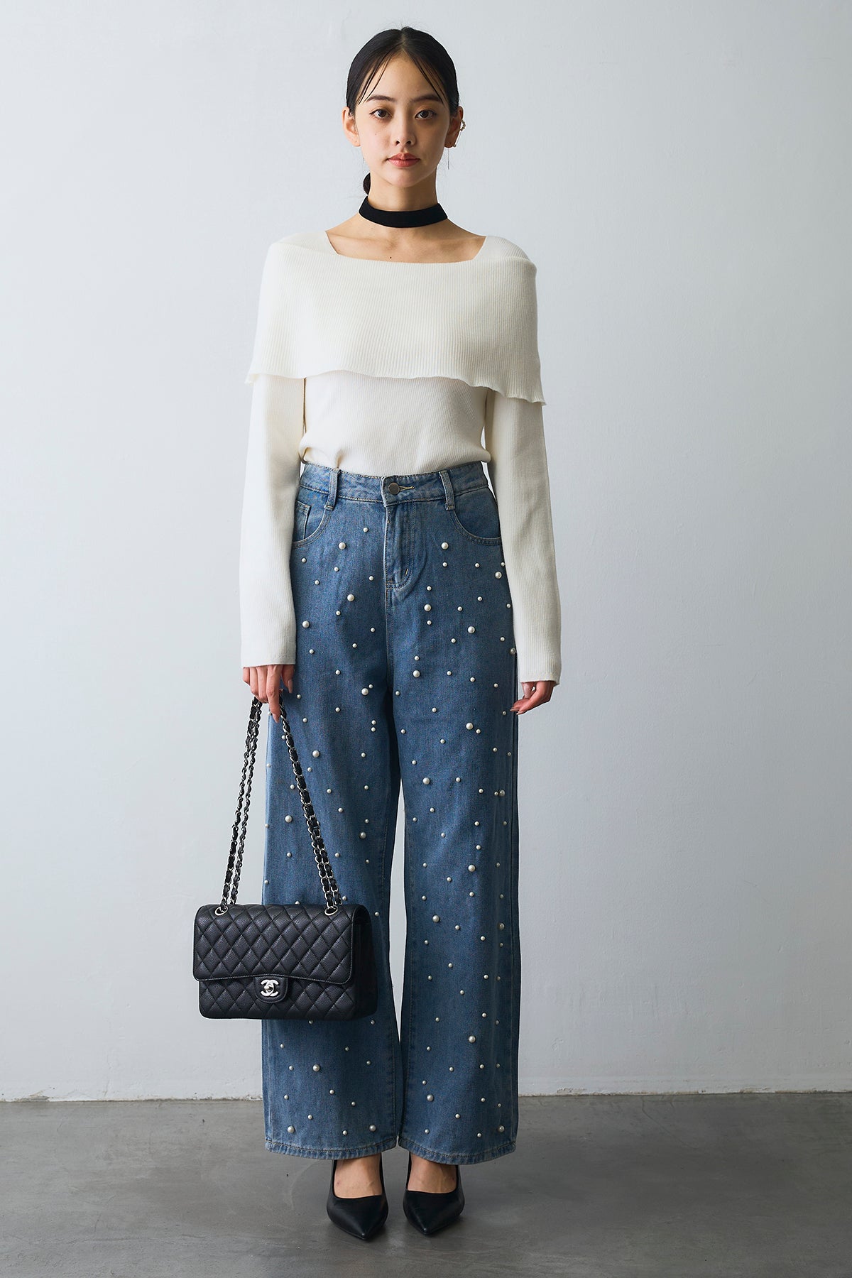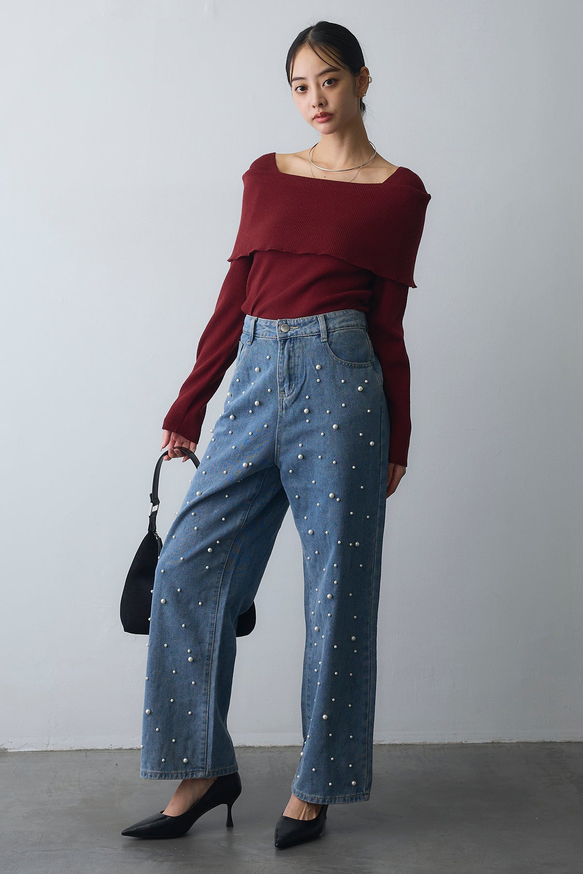 [予約/SET]リブオフショルロングスリーブニット+ランダムパールハイウエストストレートデニム(2set)
